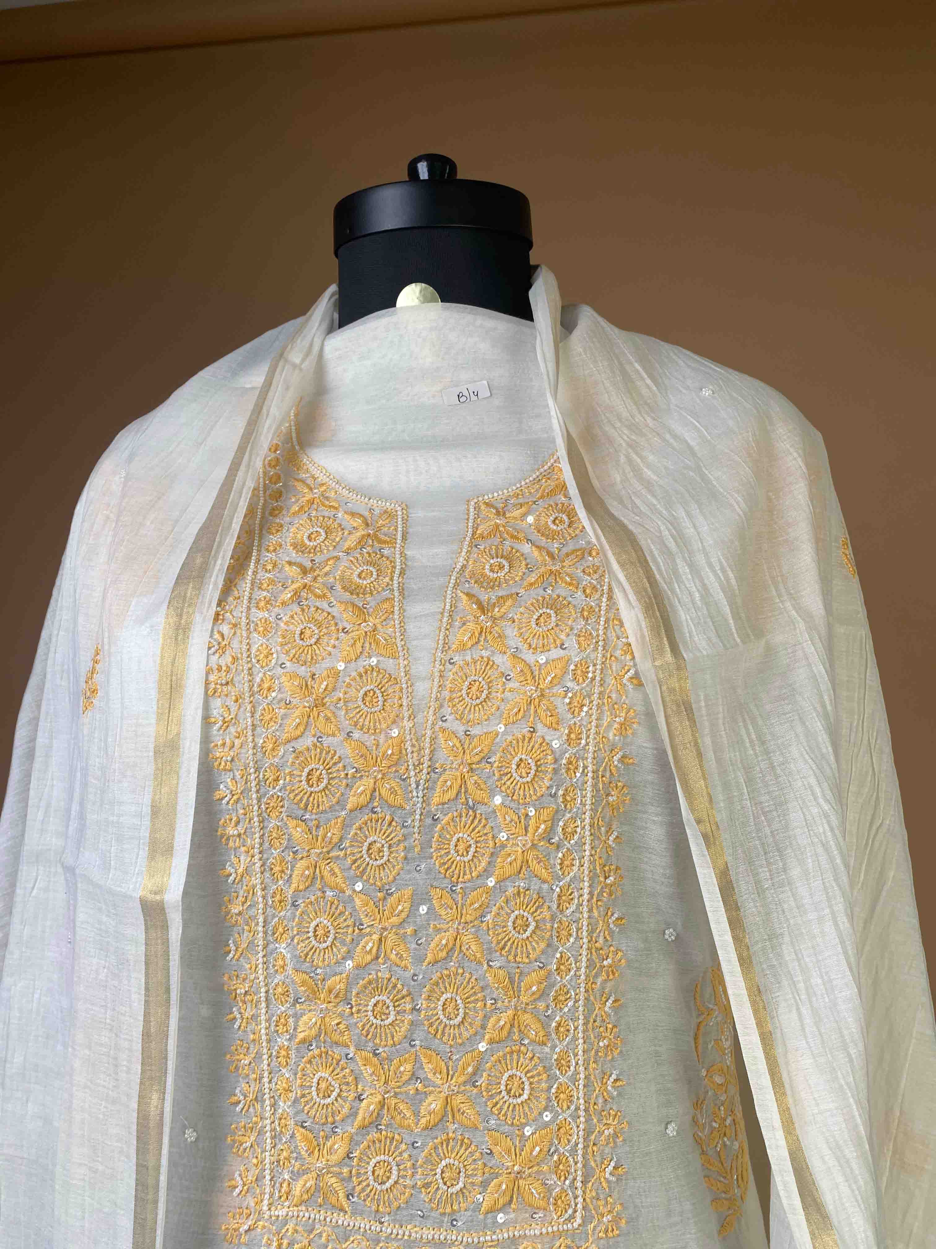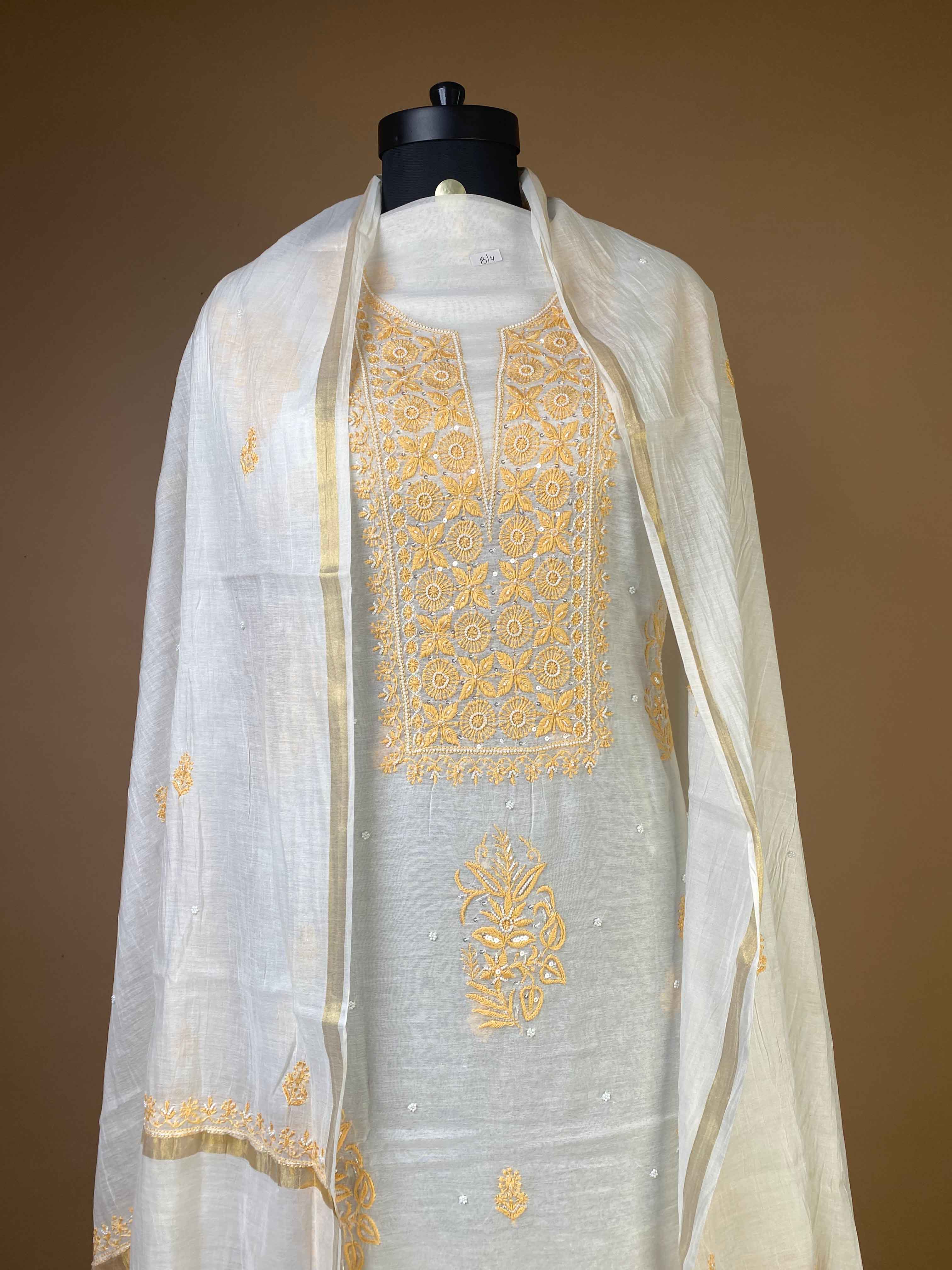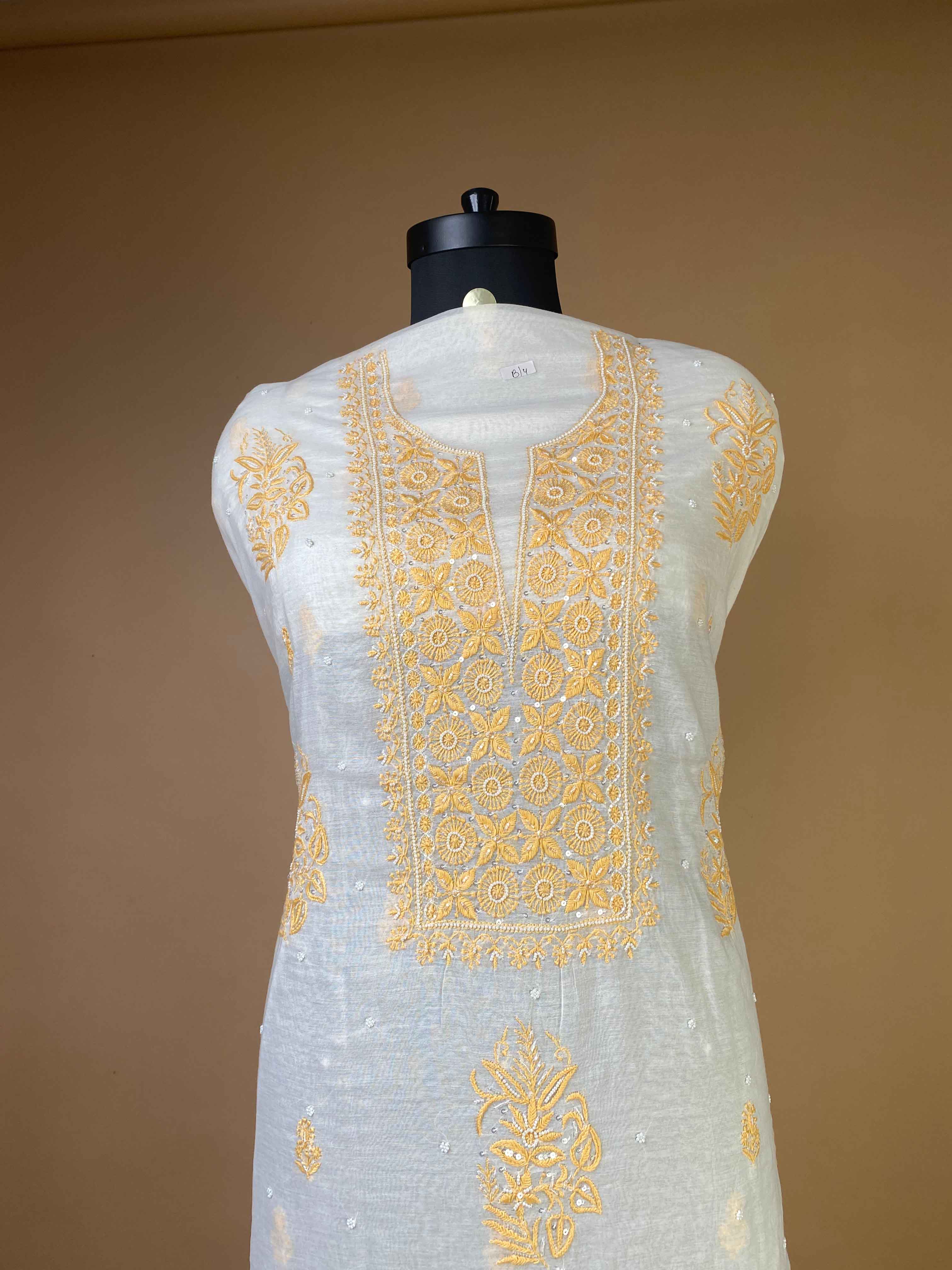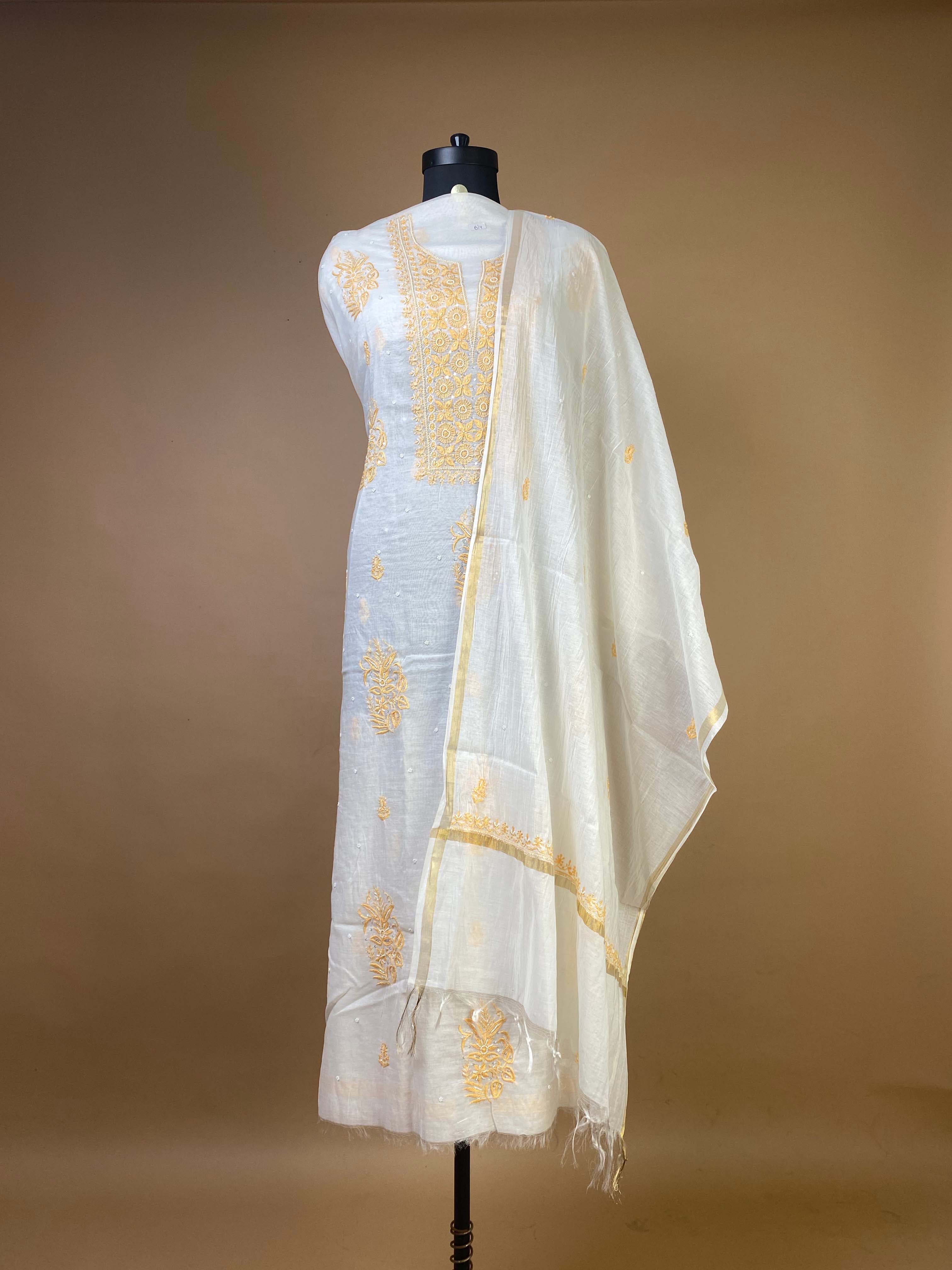 Crafted with precision and an eye for detail, this Pure Mul Chanderi ensemble features intricate amber-colored chikankari thread work, bringing out its true elegance. The beautiful motifs are further adorned with delicate beadwork and cut dana, adding depth and richness to the design. This 2-piece set (kurta and dupatta) comes unstiched, allowing for a tailored fit that suits your personal style.