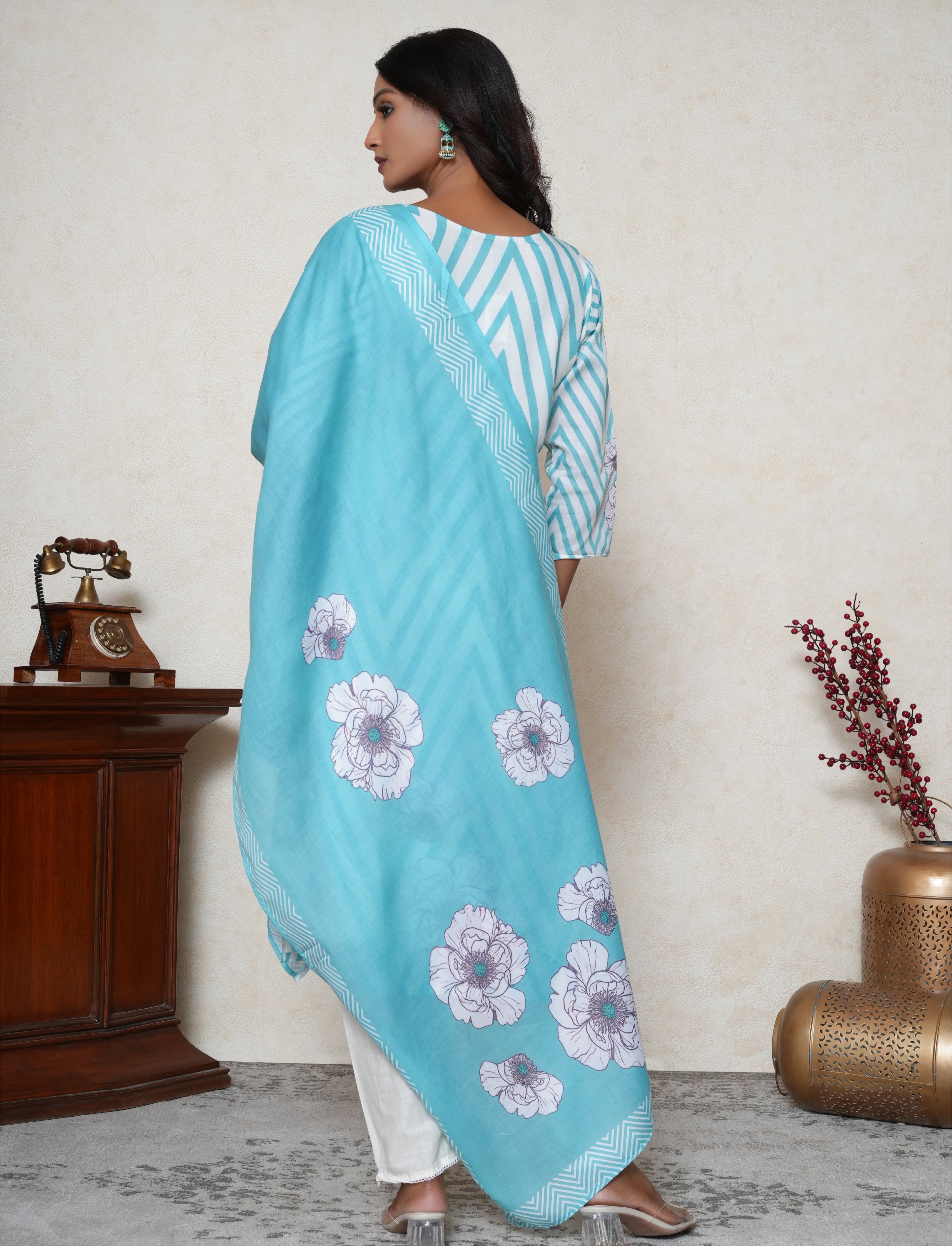 Fresh, graceful, and effortlessly chic — this Aqua Blue and White Cotton Suit Set is the perfect blend of elegance and comfort. The straight-cut cotton kurta showcases a stylish zigzag horizontal pattern, brought to life with a V-neckline embellished with pearl, cutdana, and sequins work, adding just the right touch of festive sparkle. Delicate floral prints on the kurta are further elevated with hand-embellished pearl and cutdana detailing, creating a soft, refined look. Paired with crisp white cotton straight-fit pants, the outfit is perfect for warm-weather occasions. A soft, breathable cotton dupatta with bold floral prints completes the set, adding a vibrant contrast while keeping the look fresh and contemporary.