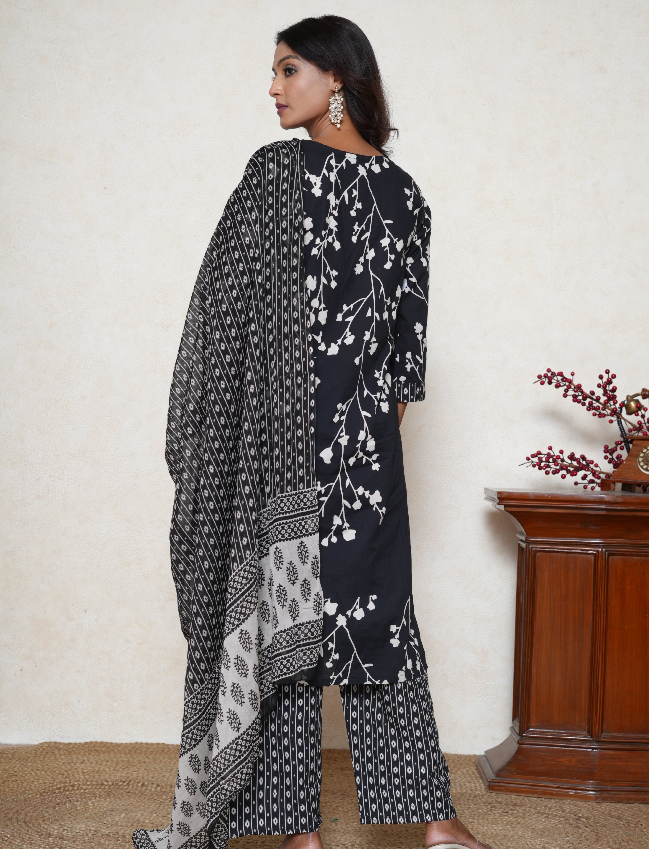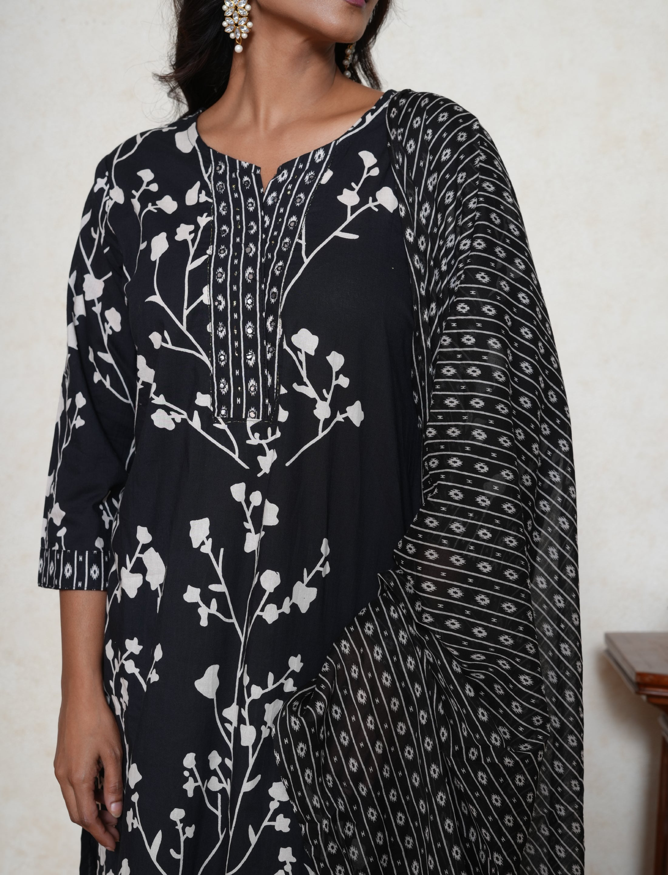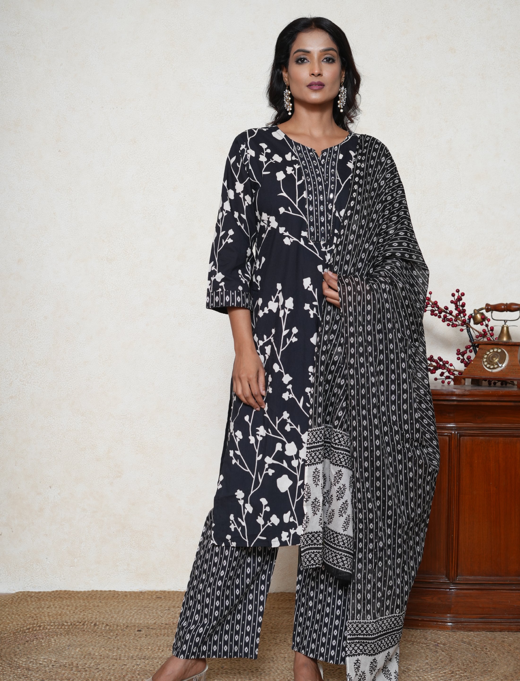 This floral print cotton straight-fit kurta comes with cotton pants and a cotton dupatta. It features an all-over floral print, a straight hemline, and 3/4th sleeves.