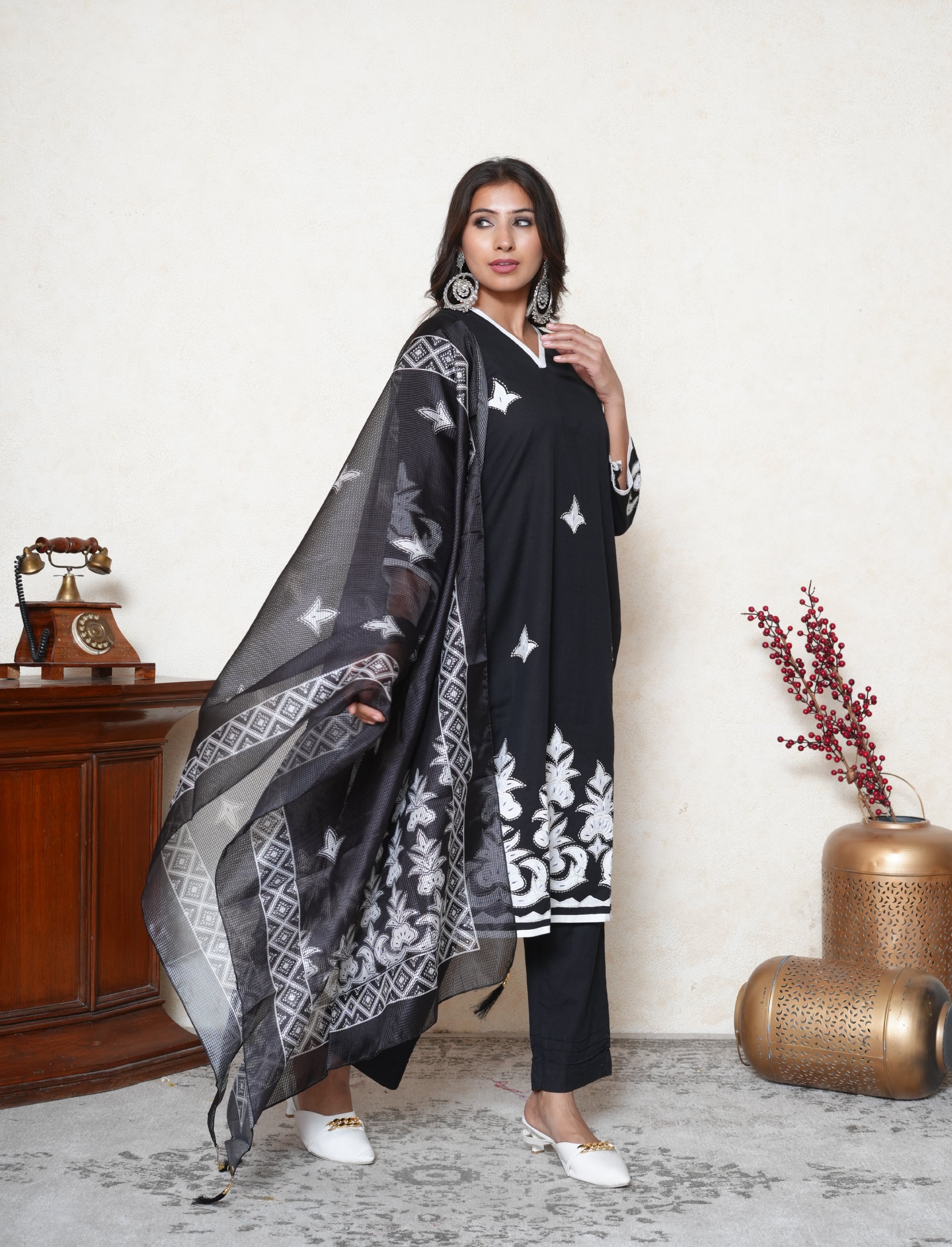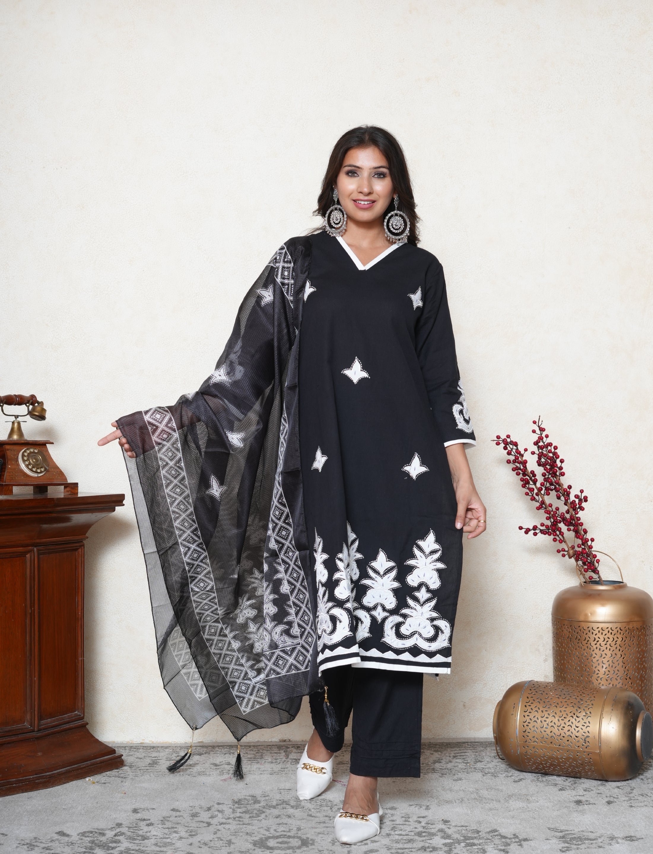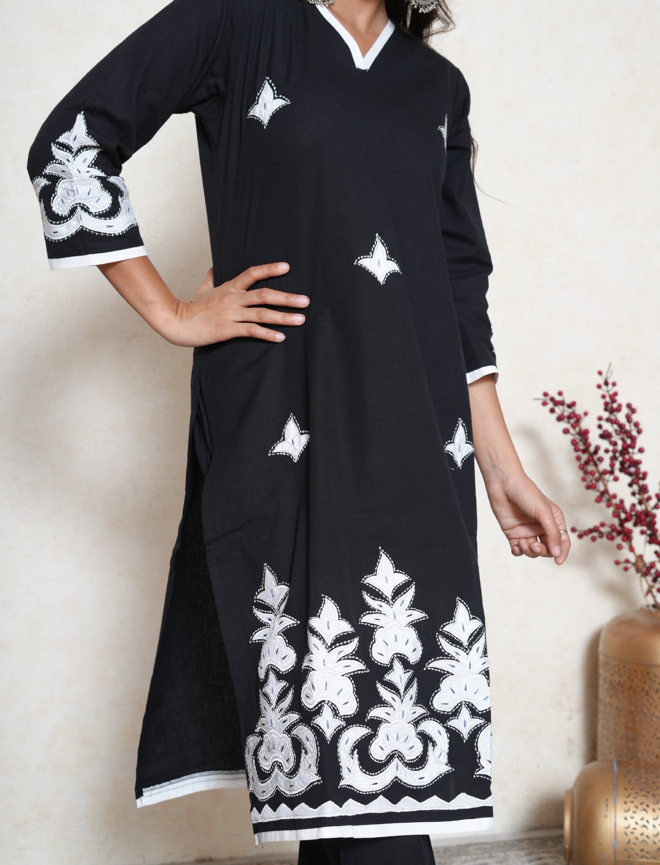 This premium cotton suit is handcrafted with intricate appliqué work on the fabric. It is paired with a lightweight Kota dupatta and black cotton pants, creating a balanced blend of elegance and comfort.