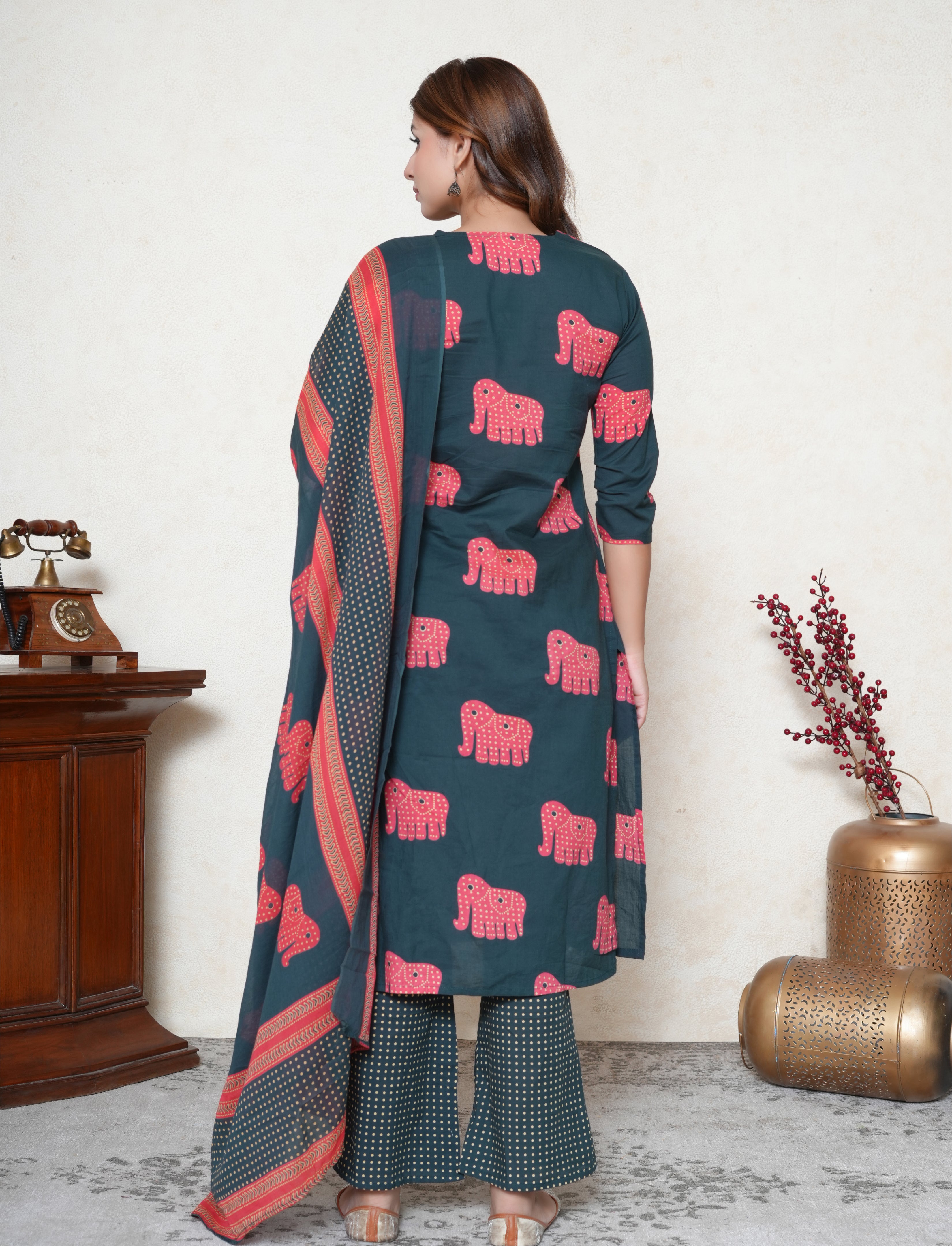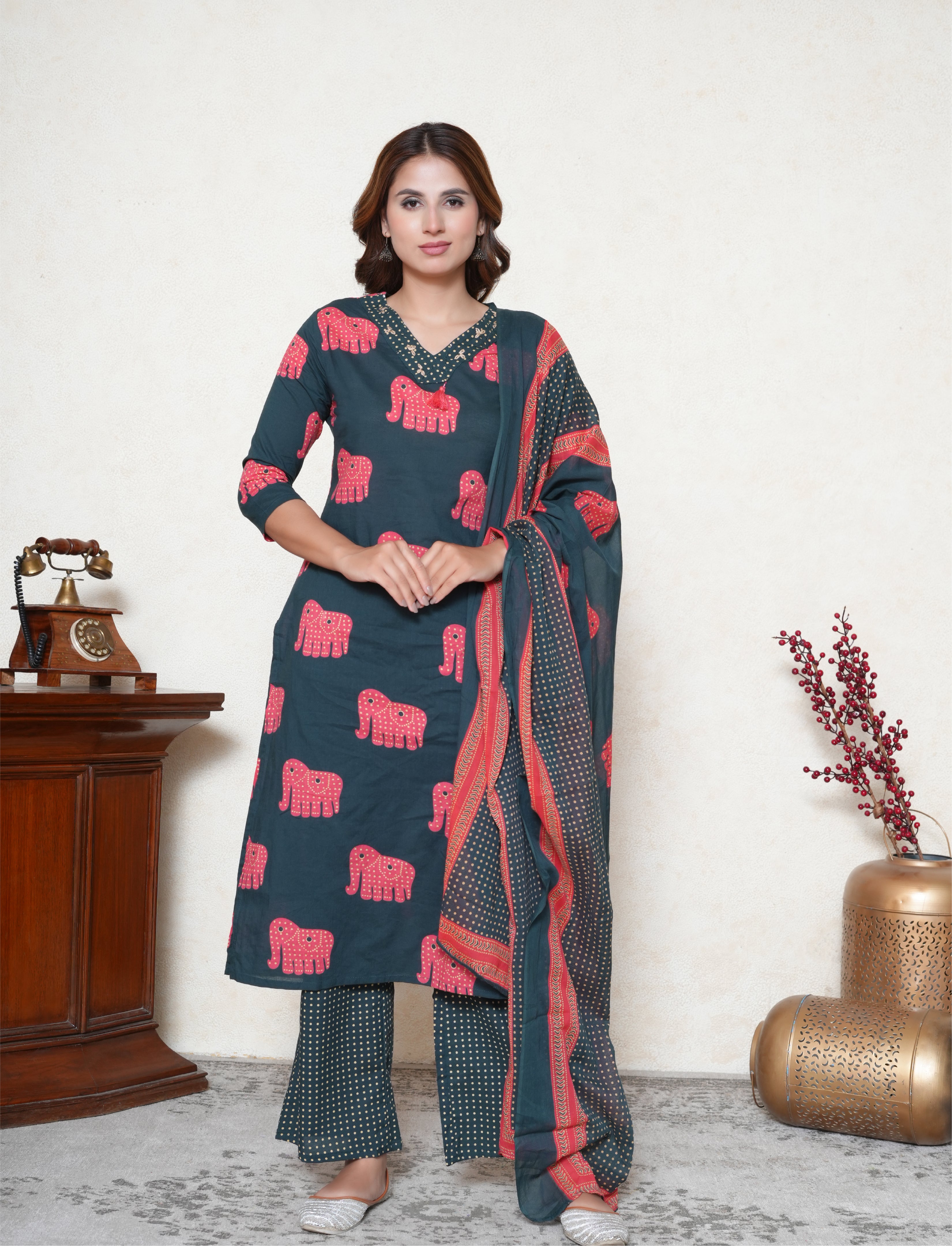Embrace traditional elegance with this stunning bottle green cotton kurta adorned with playful red elephant motifs. The V-neck design adds a contemporary twist to the classic silhouette, enhanced with detailed accents along the neckline. A charming polka dot print on the hemline of the V-neck brings a touch of whimsy and contrast to the rich green backdrop. Paired with polka dot cotton pants, this ensemble exudes a unique blend of ethnic charm and modern style. The set is completed with a matching cotton dupatta, making it the perfect choice for festive events, casual outings, or relaxed gatherings.