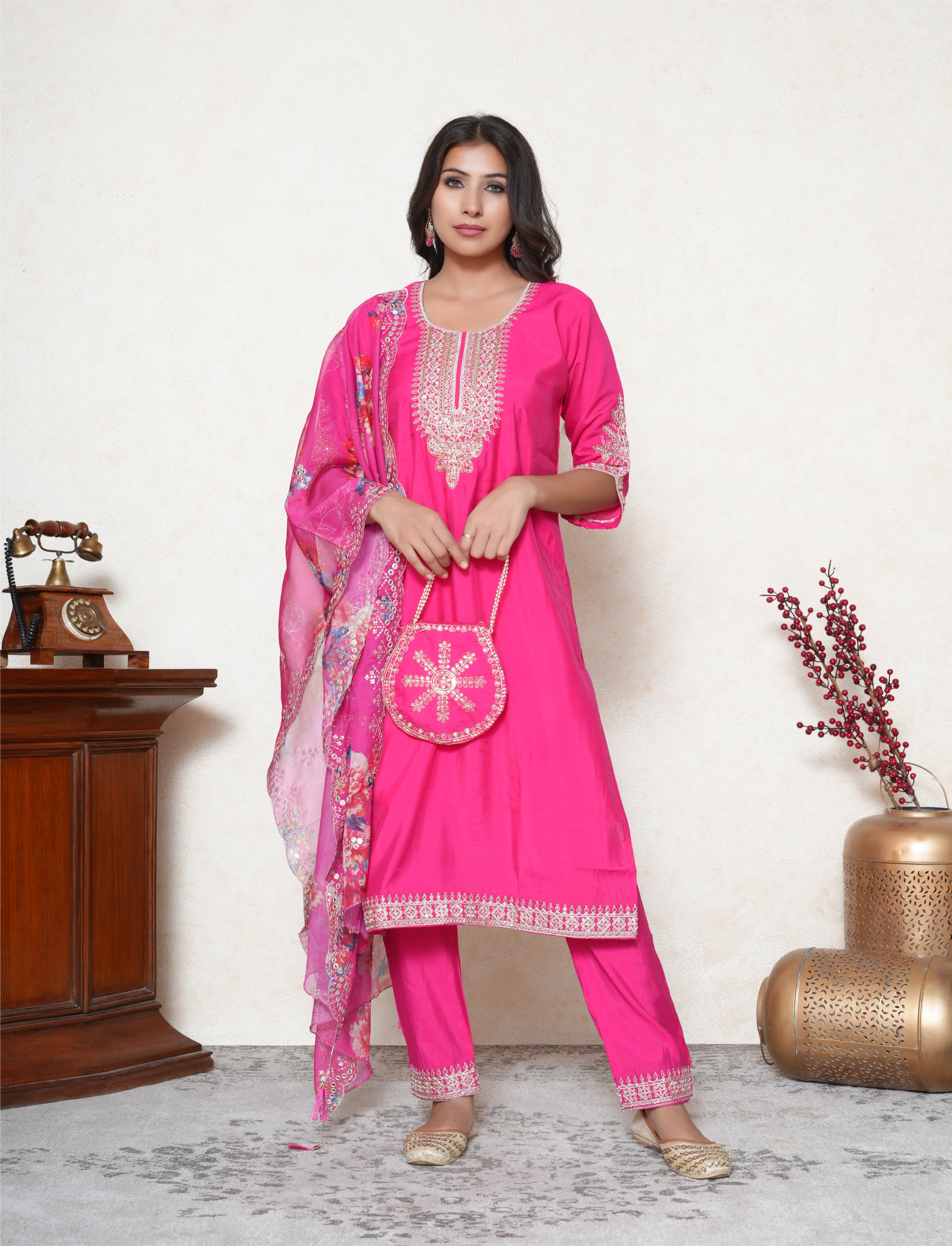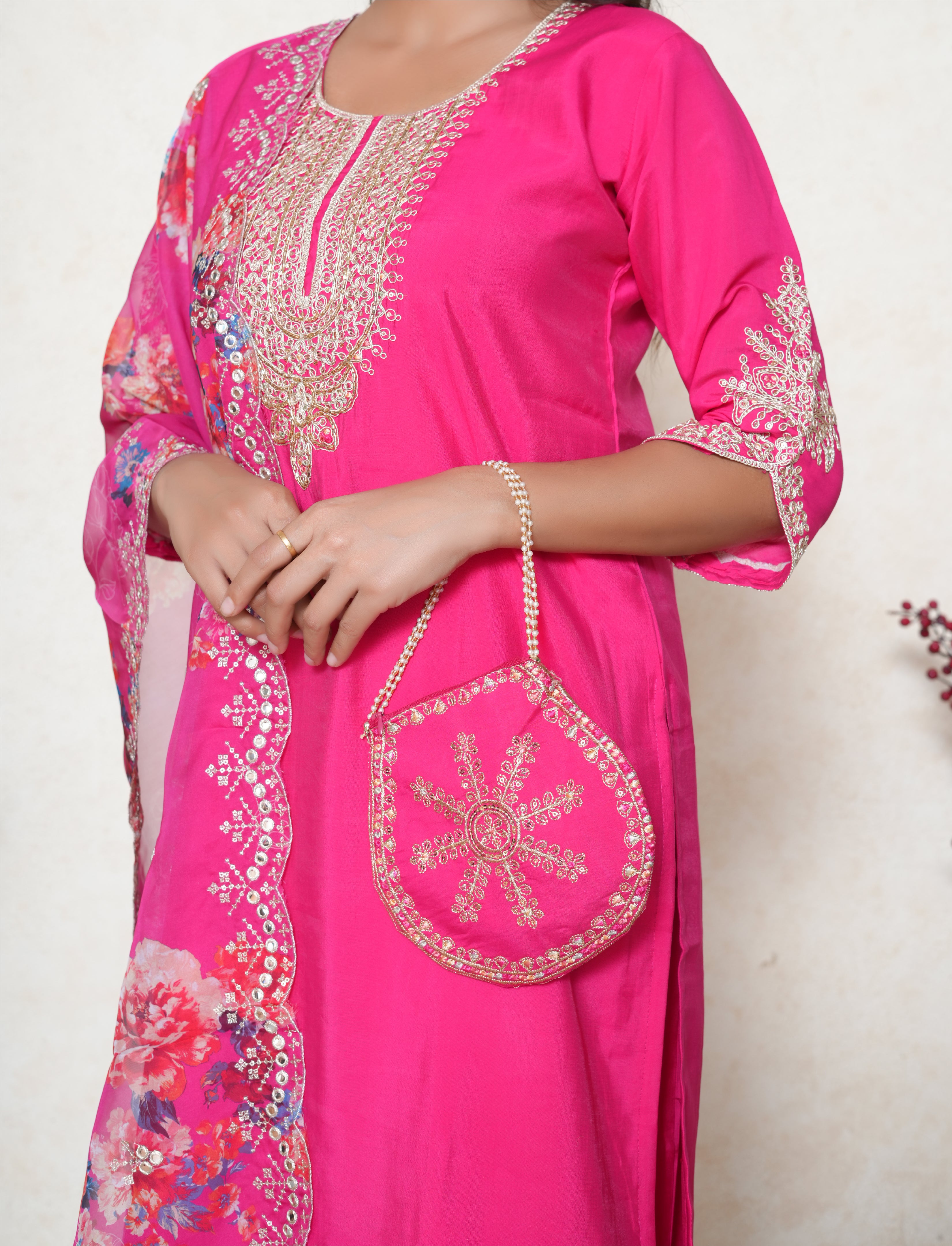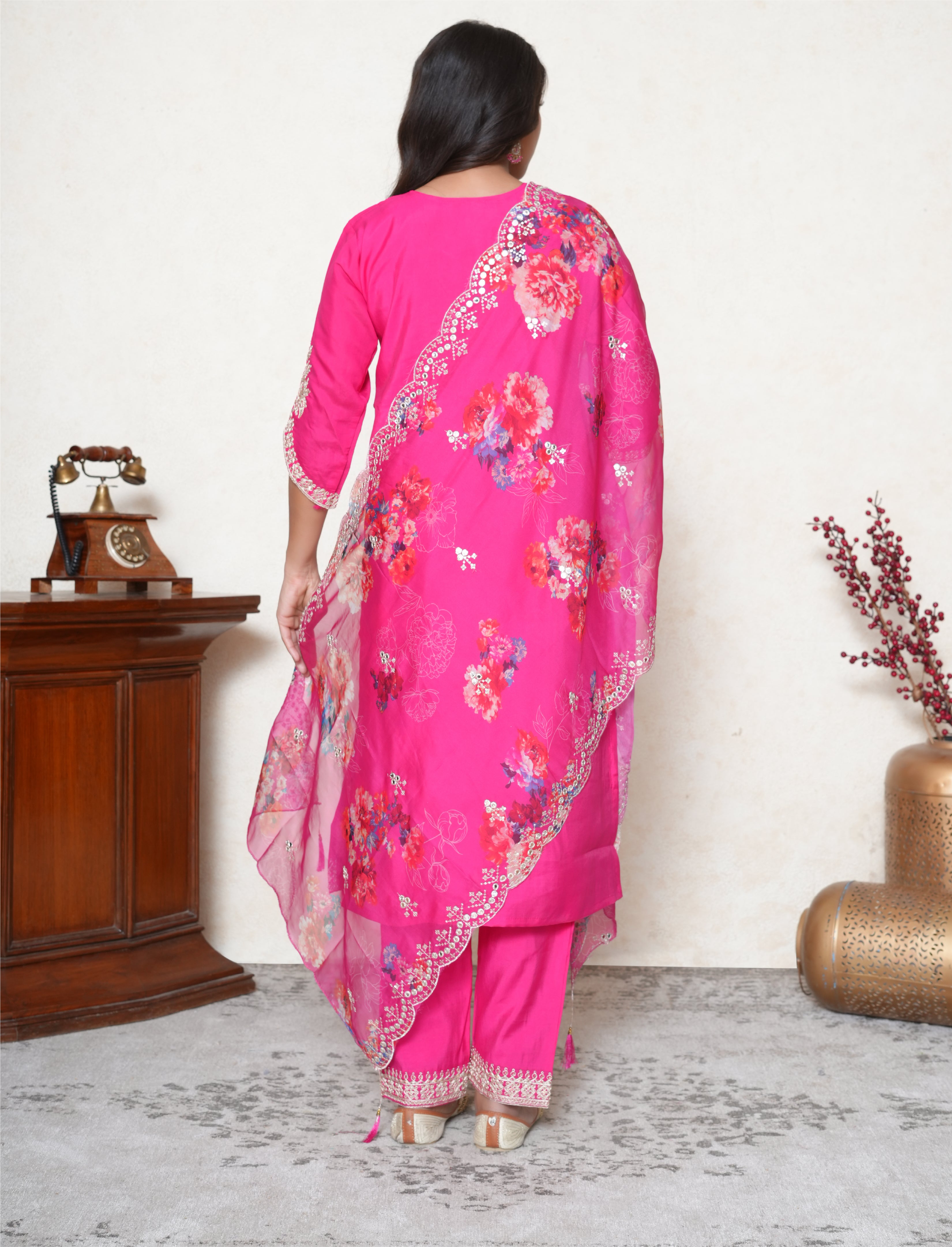 Turn heads in this vibrant and feminine Bright Pink silk blend Stitched Suit Set, a perfect fusion of elegance and festive charm. The silk blend kurta features a classic round neckline, beautifully embellished with zari threadwork, cutdana, and sequins, offering a subtle sparkle ideal for both day and evening wear. Detailed embroidery lines the hem of the kurta, sleeves, and pants, adding a refined finish to this timeless silhouette. The set is paired with a matching pair of straight silk blend pants, featuring coordinated embroidery for a well-balanced, polished look. The ensemble is completed with a breezy organza dupatta, adorned with a delicate floral print, mirror detailing, and a scalloped embroidered border—bringing a light, graceful contrast to the richness of the kurta.
