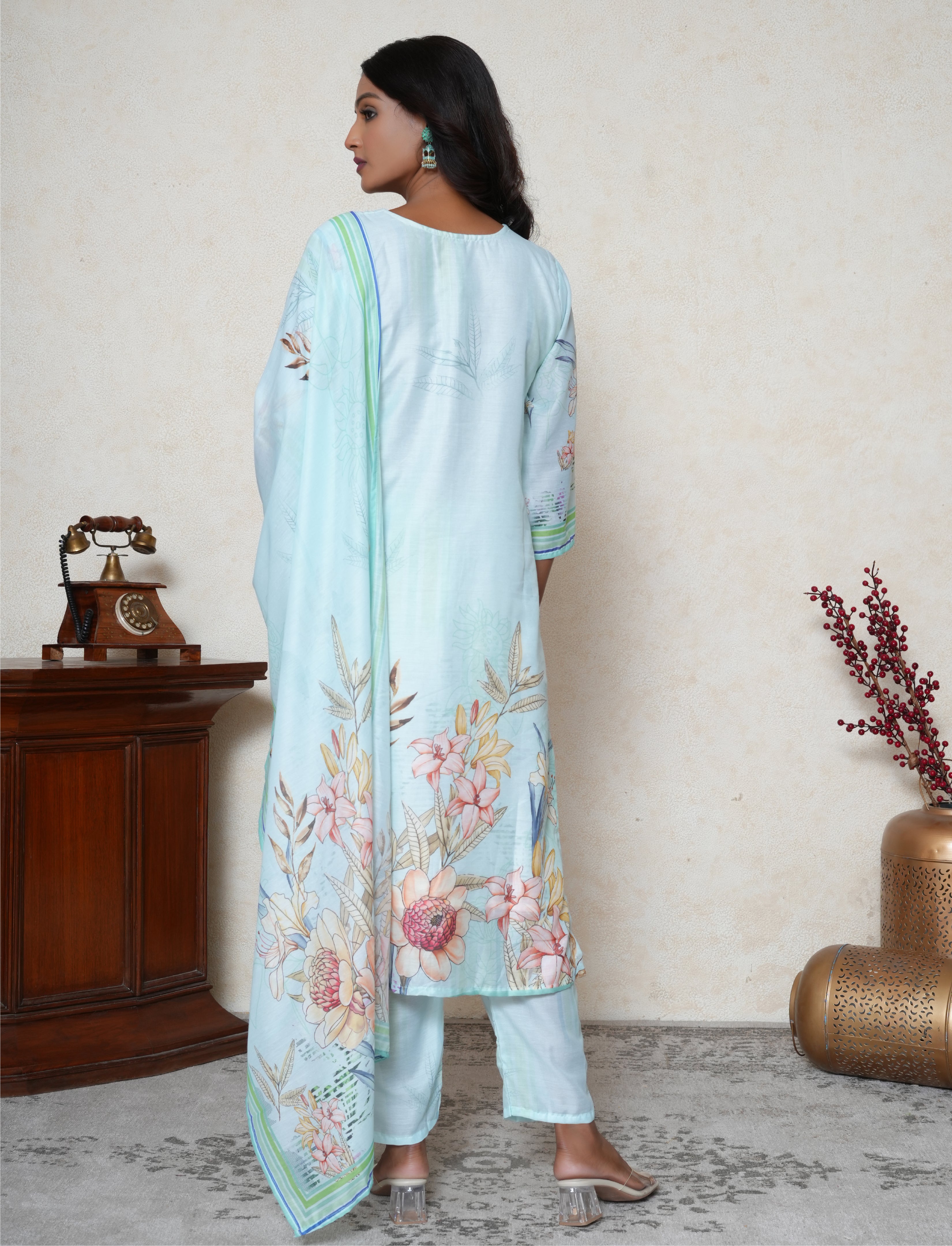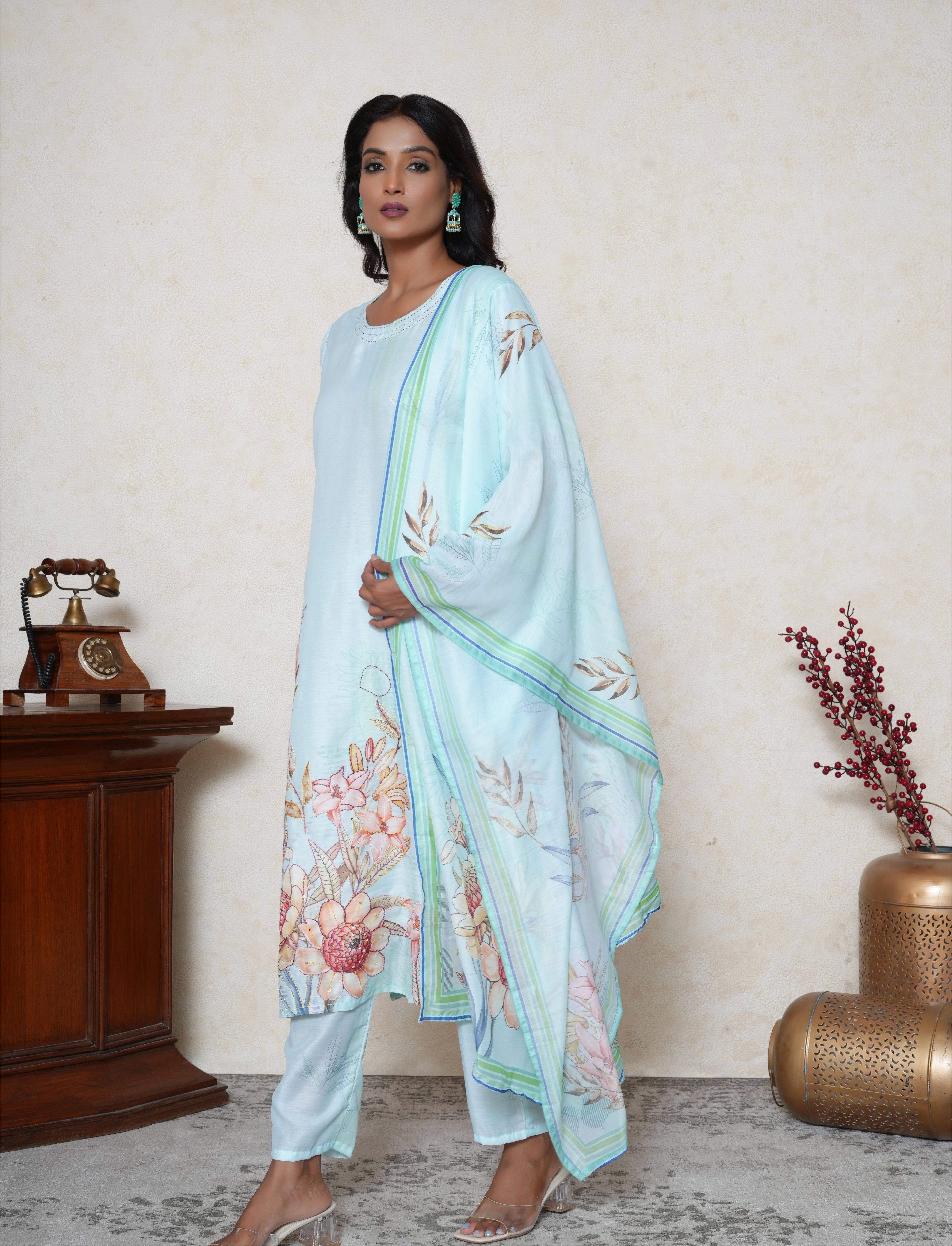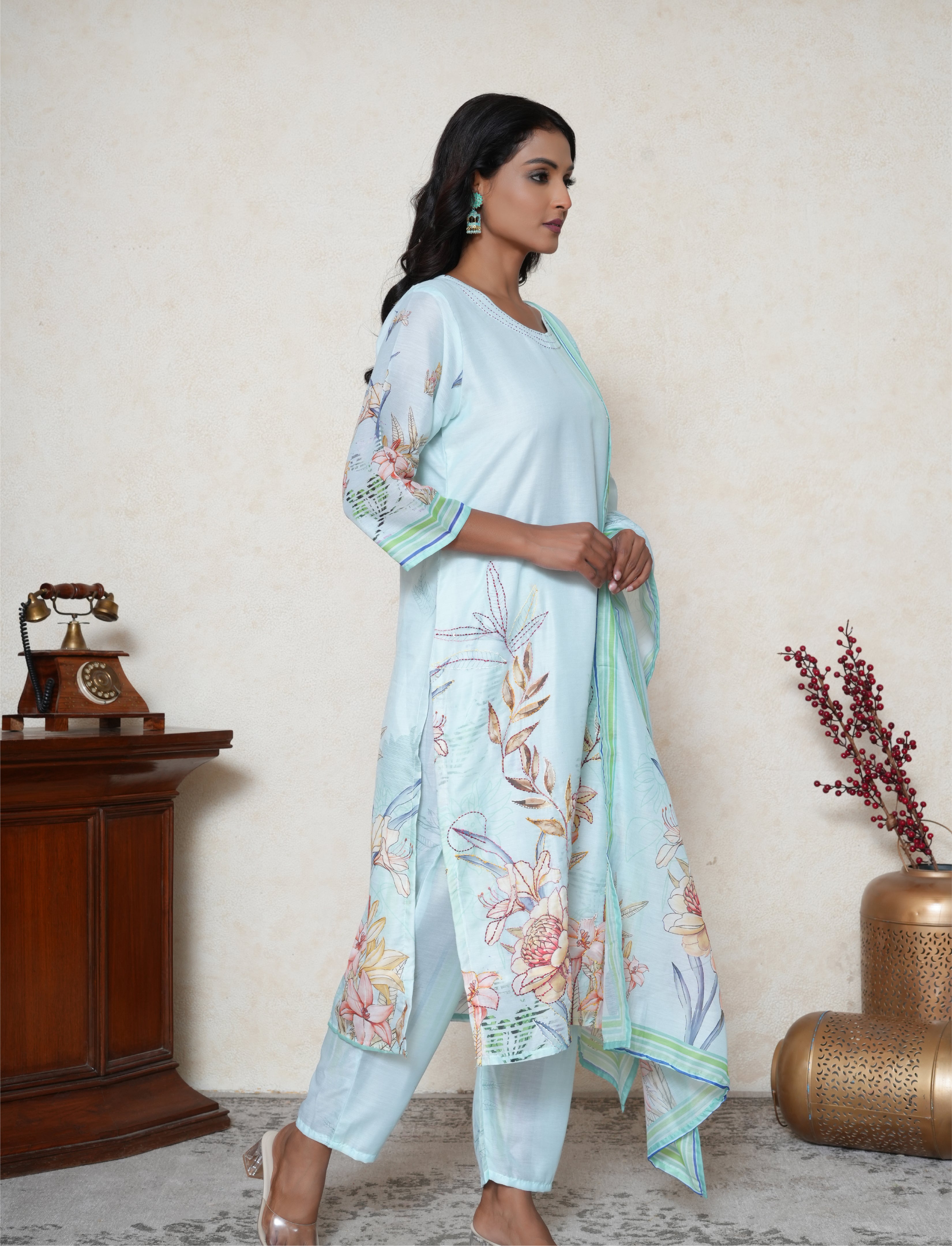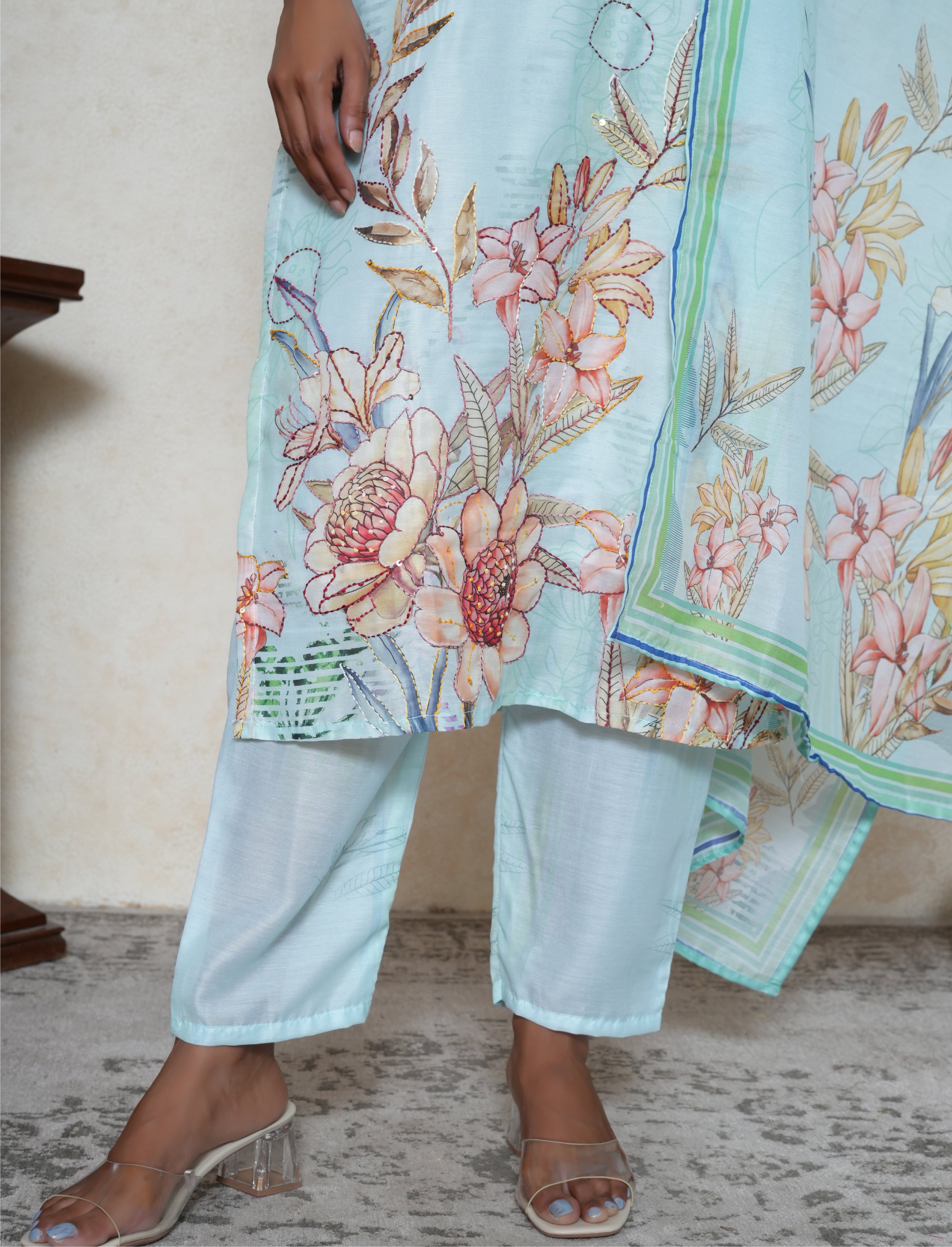 This casual kurta suit set has floral pattern on the sleeves and along the border of kurta with intricate kantha work around the neckline and floral print. it is paired with pants and printed dupatta.