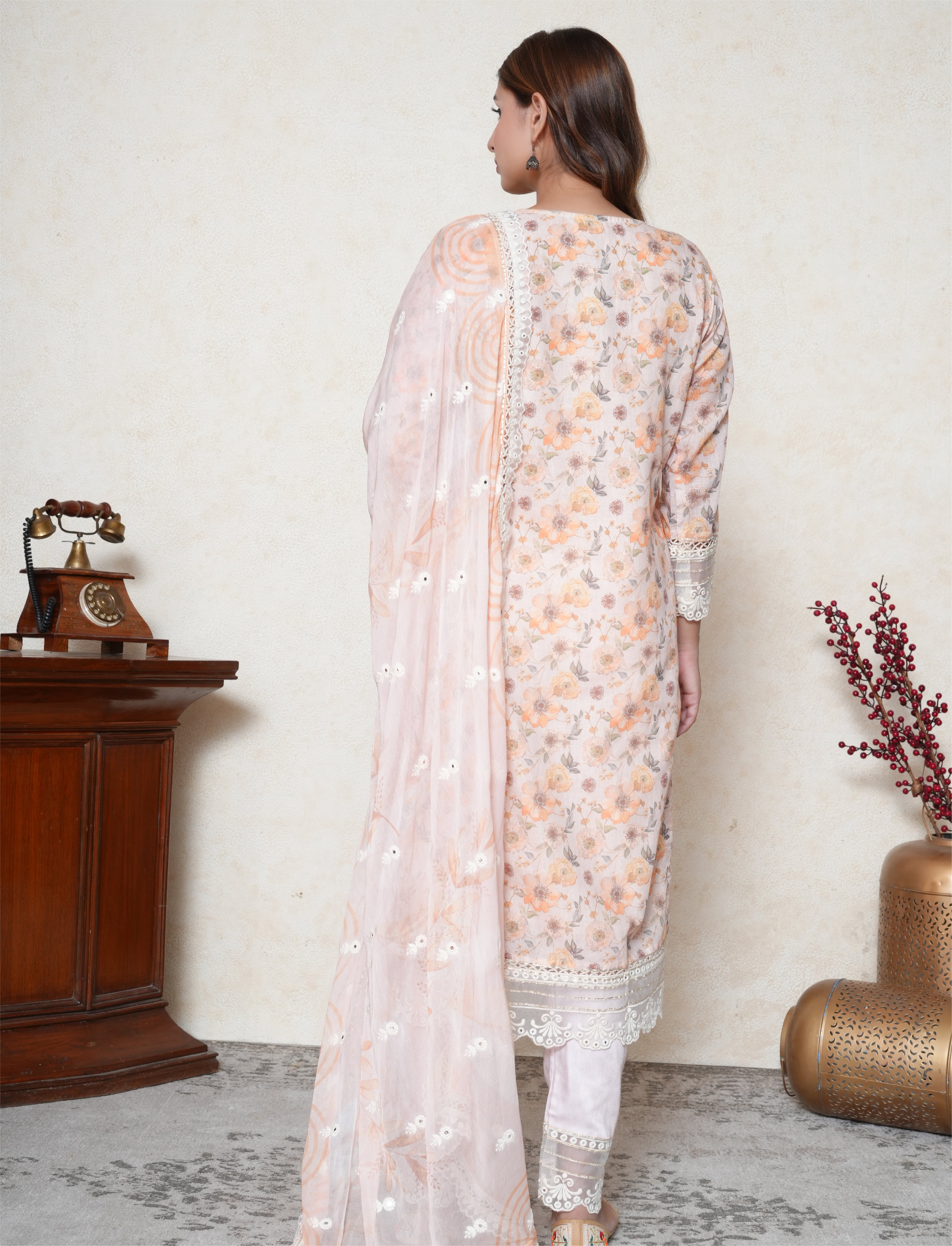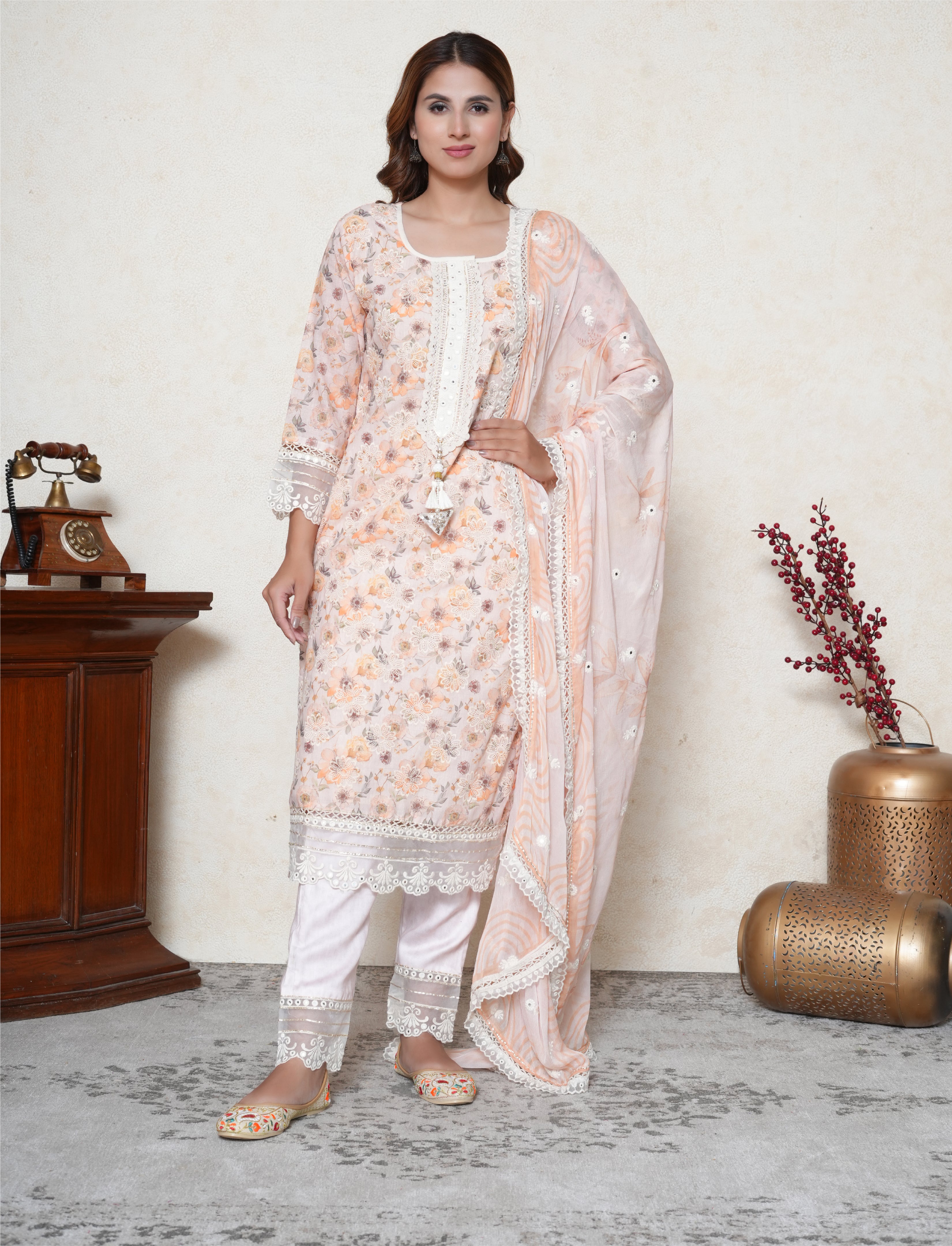Add a touch of elegance with this floral print cotton suit set. Crafted from soft cotton, the suit is decorated with fine lace detailing along the neck, sleeves, and trousers. The kurta sleeves, border, and trousers feature a net scalloped hem, enhancing the delicate design. It is paired with a chiffon dupatta adorned with mirror work floral booties all over, completing the graceful ensemble.