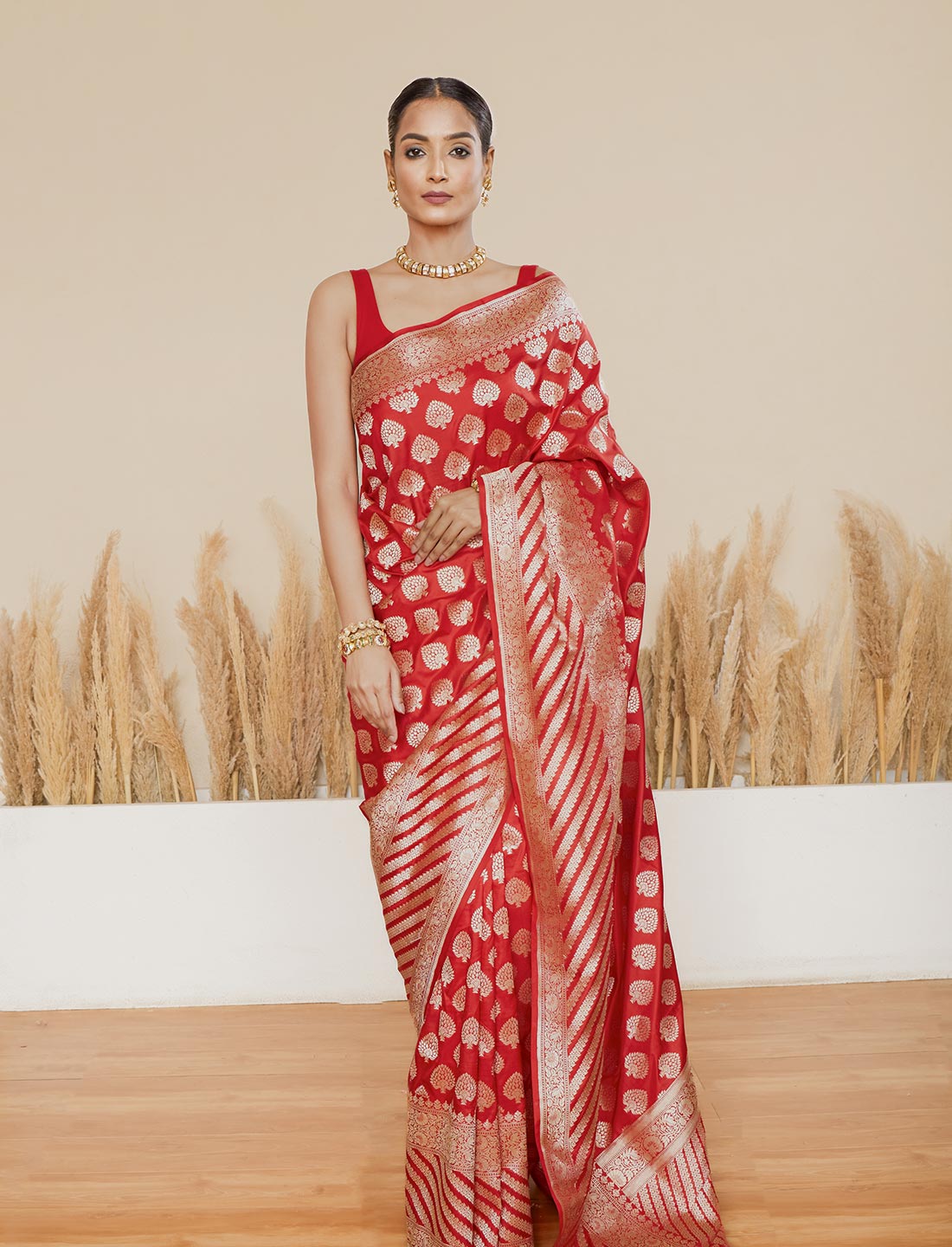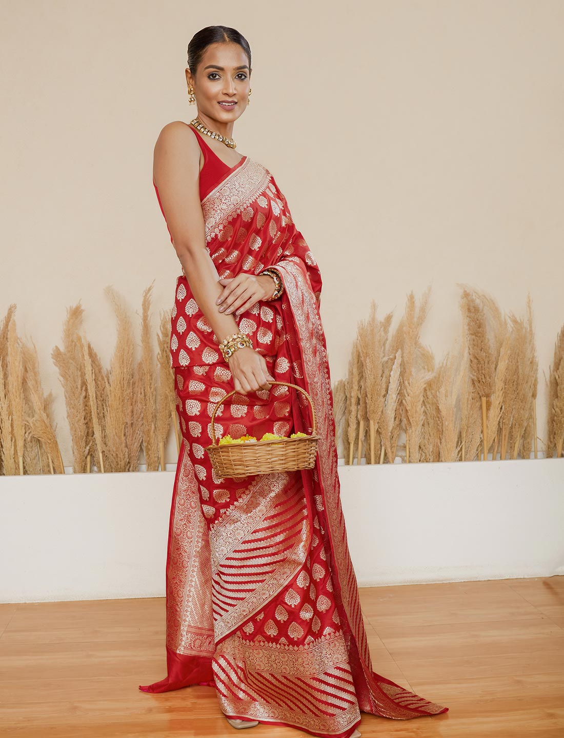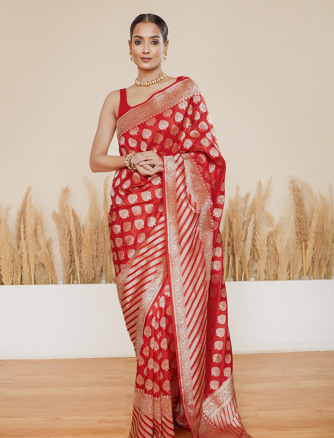 Pure handwoven Katan by Katan silk with Upada design Weaving. Katan silk also known as the the queen of all silk, truly inspired by artistic heritage and artisans adroitness. This silk is created by twisting threads together to give it an everlasting and more durable quality, also providing a touch of regality to the look.