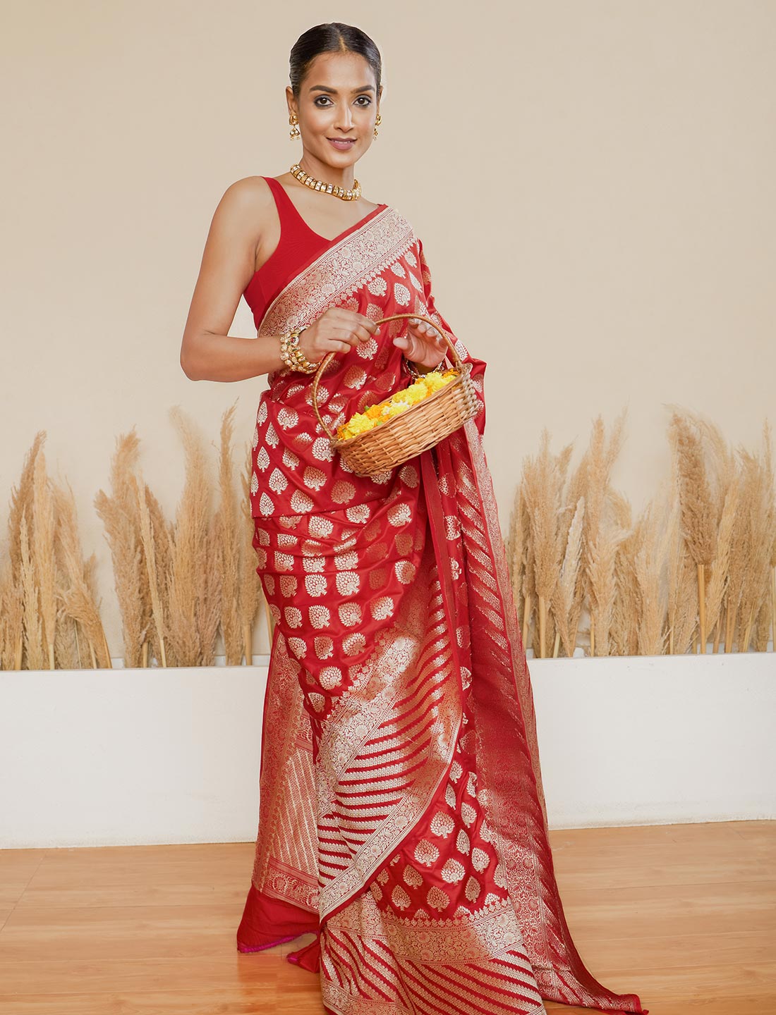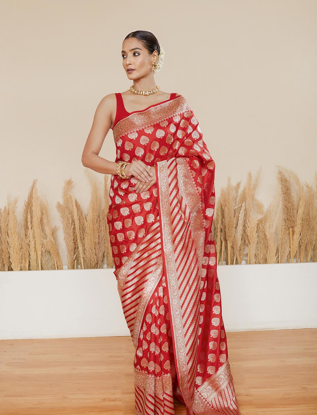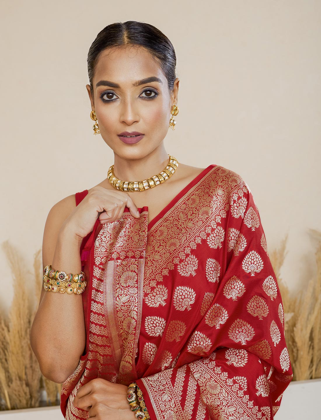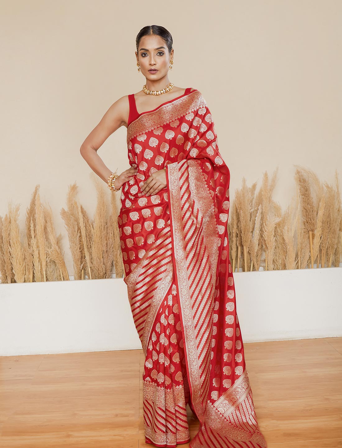 Pure handwoven Katan by Katan silk with Upada design Weaving. Katan silk also known as the the queen of all silk, truly inspired by artistic heritage and artisans adroitness. This silk is created by twisting threads together to give it an everlasting and more durable quality, also providing a touch of regality to the look.