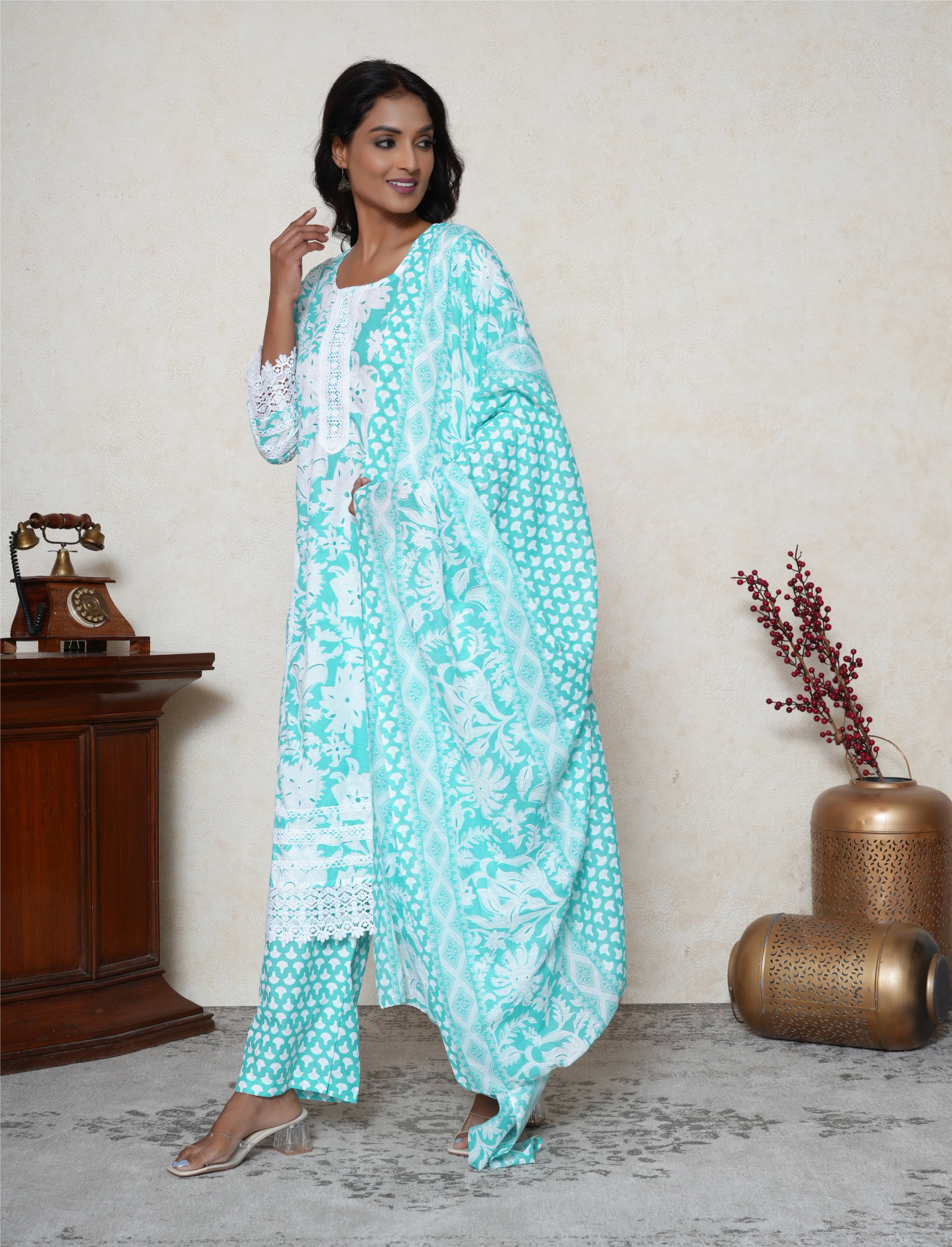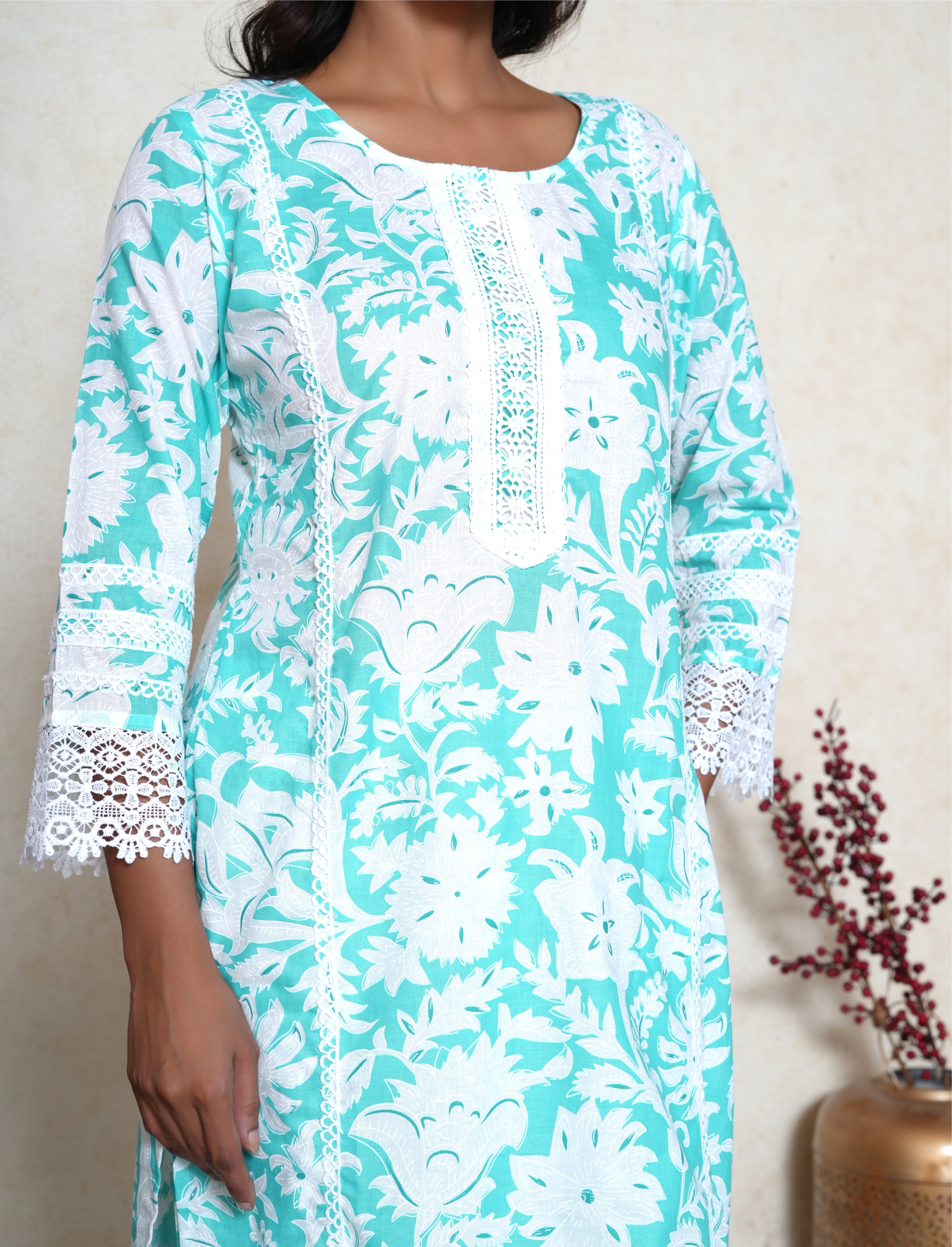Soft, feminine, and effortlessly stylish — this Georgia Peach Cotton Suit Set brings comfort and elegance together in one graceful ensemble. The straight-fit cotton kurta features a delicate floral print in soothing tones, perfect for summer days and casual gatherings. Designed with a classic round neckline, the kurta includes a lace panel at the front and lace detailing along the hem and sleeve edges, adding a subtle touch of charm and texture. Paired with printed cotton straight-fit pants, the outfit maintains a coordinated and breezy look. A lightweight cotton dupatta completes the set, making it ideal for daytime wear, workwear, or relaxed festive events.