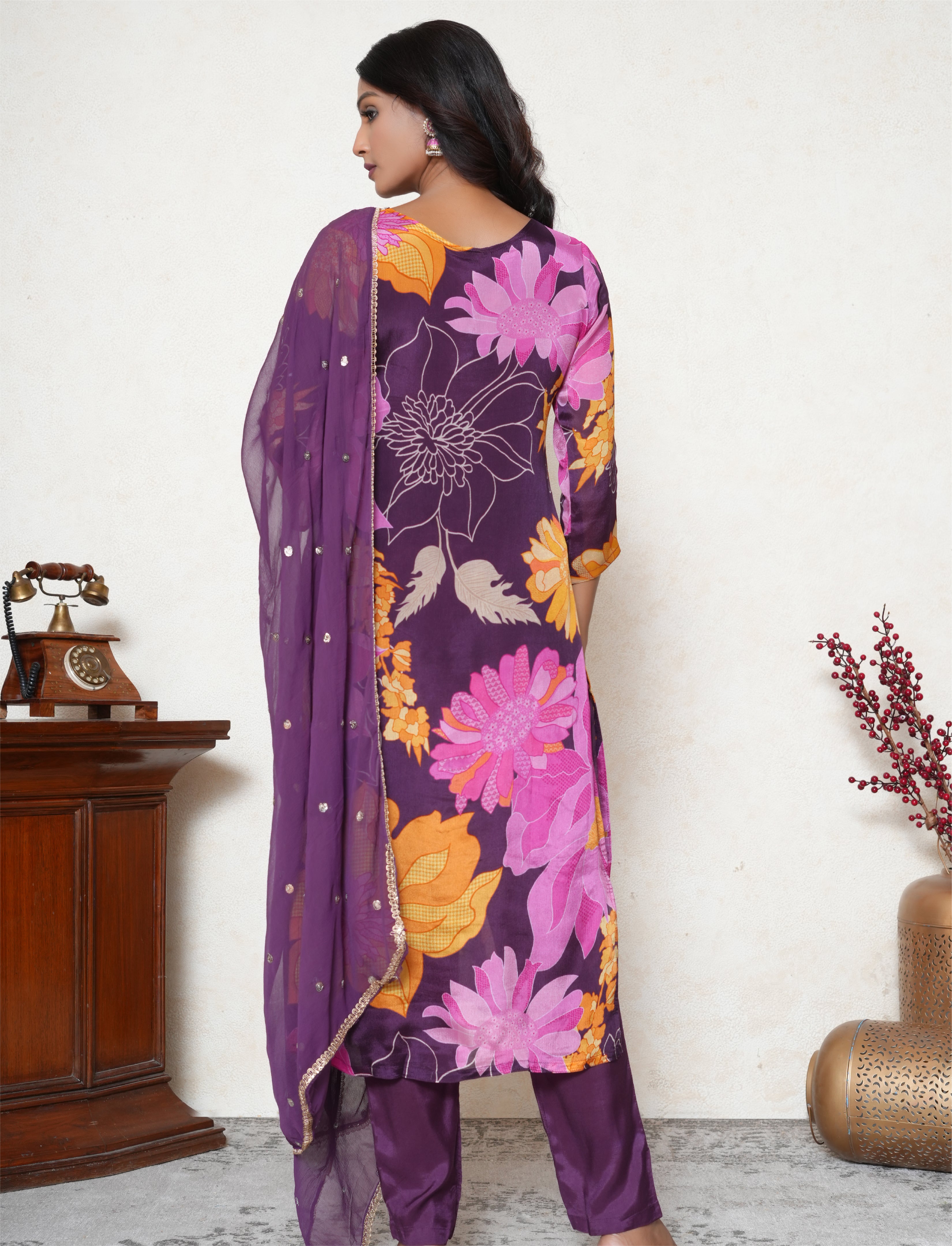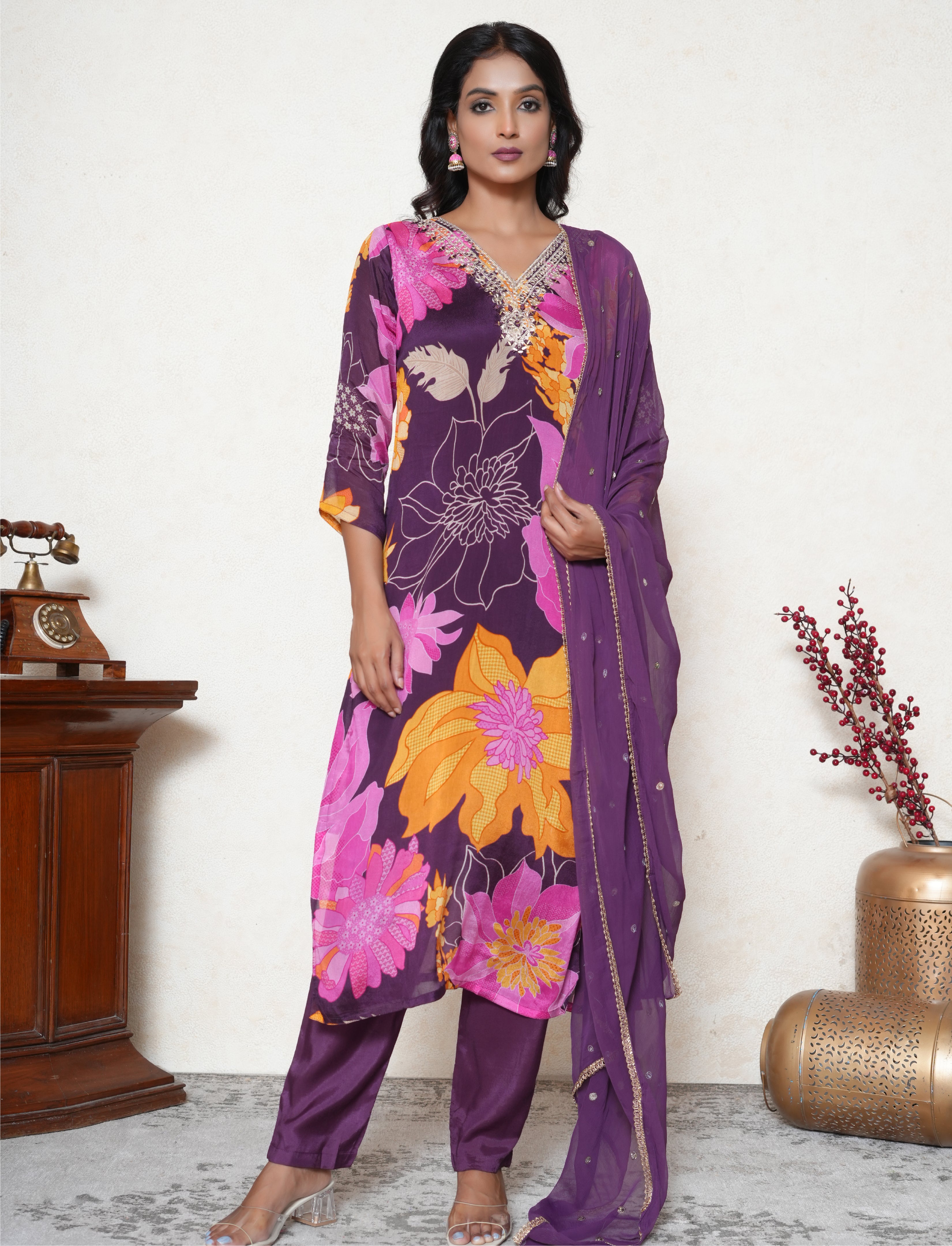 Embrace the traditional look with this eminence purple kurta set. This crepe silk kurta features floral pattern along the kurta and 3/4th sleeves. It boasts a V-neckline accentuated by zari threadwork complemented with sequins detailing. To complete the ensemble, it is paired with purple straight-fit silk blend matching pants along with a chiffon dupatta with lace border and sequins detailing all over it.