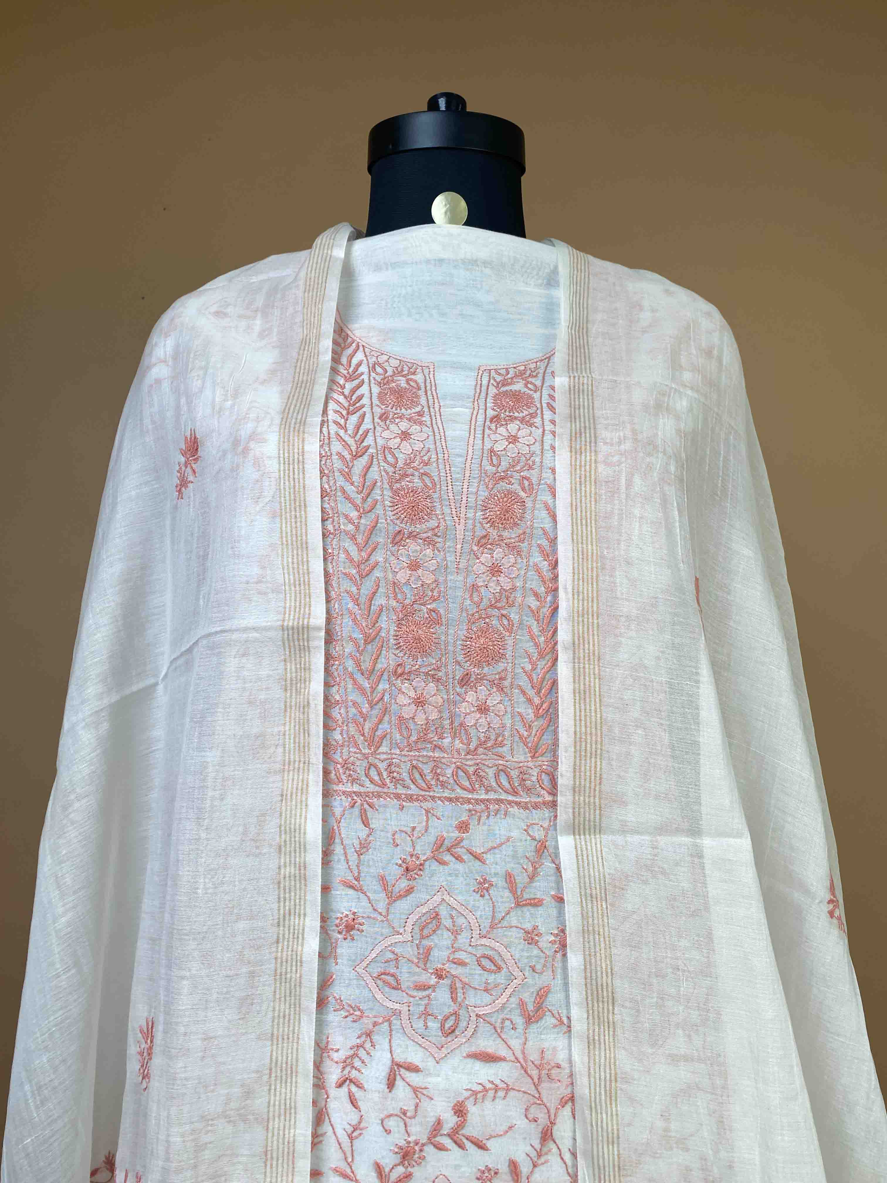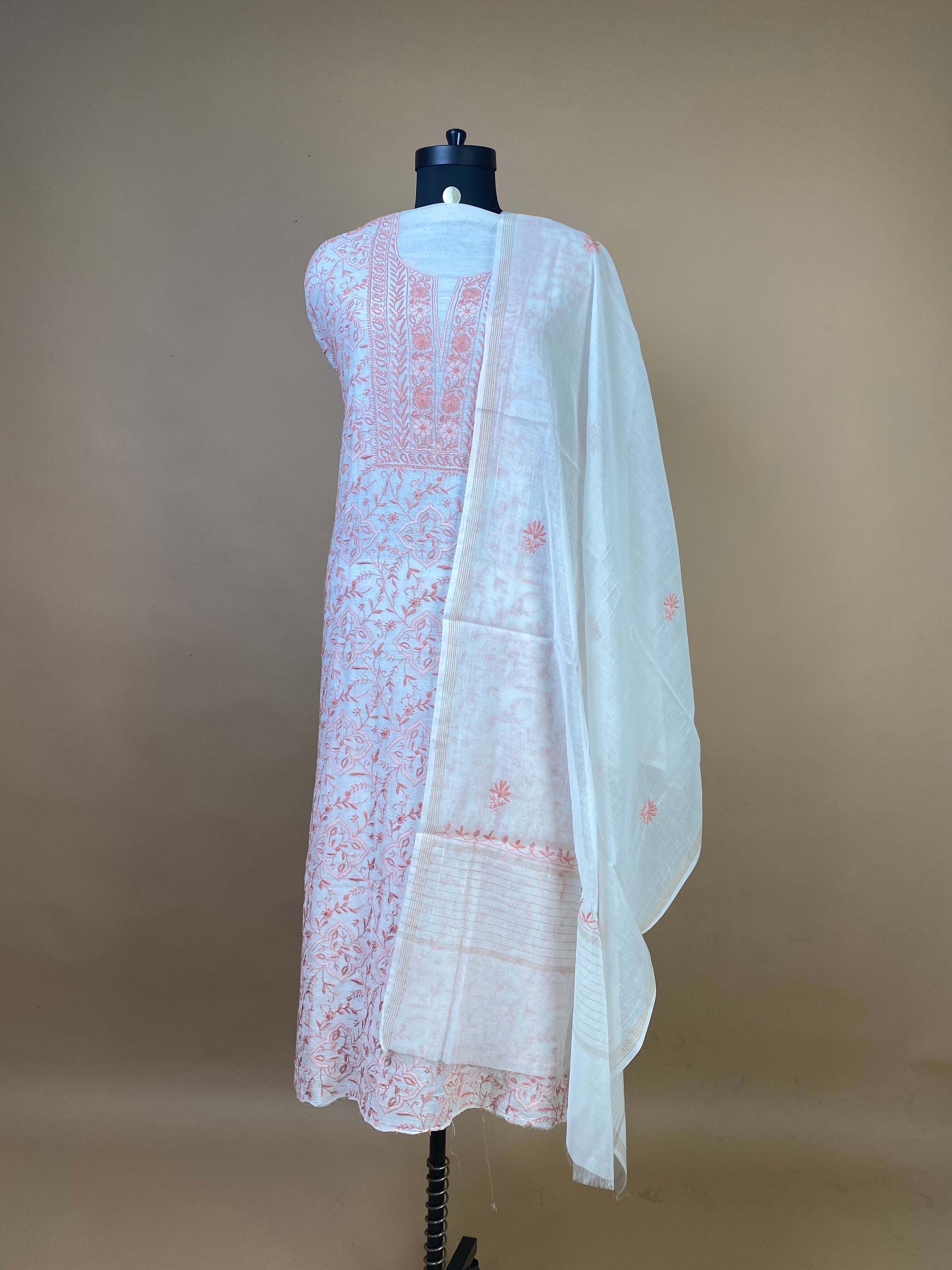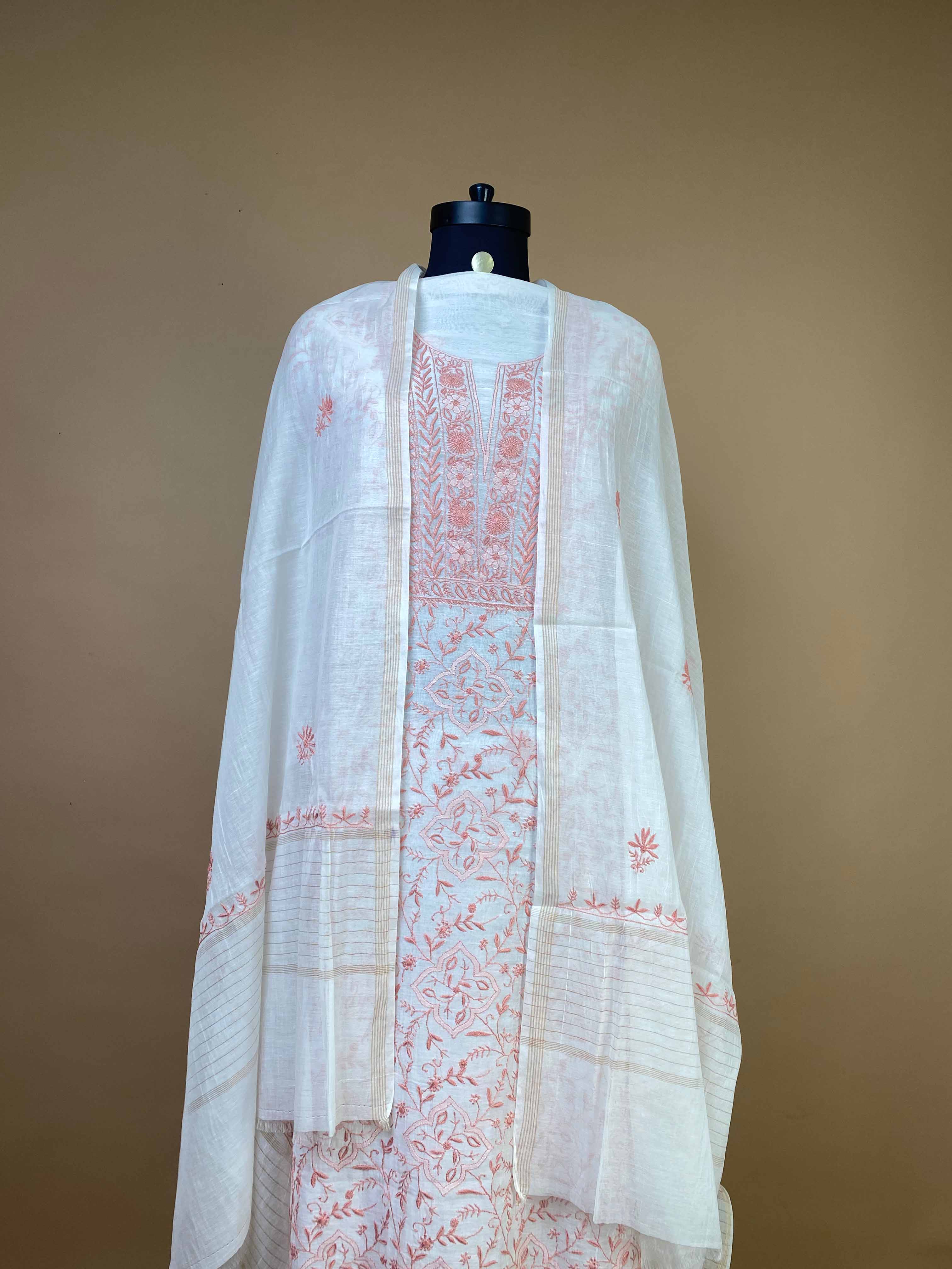 This exquisite Jaaldar Mul Chanderi set combines the softness and breathability of premium fabric with the timeless beauty of intricate chikankari stitches. The kurta is beautifully adorned with delicate rust orange thread embroidery, creating a graceful and elegant design that flows seamlessly. Perfect for any occasion, this 2-piece set (kurta and dupatta) comes unstiched, allowing you to customize the fit and style to your preference.