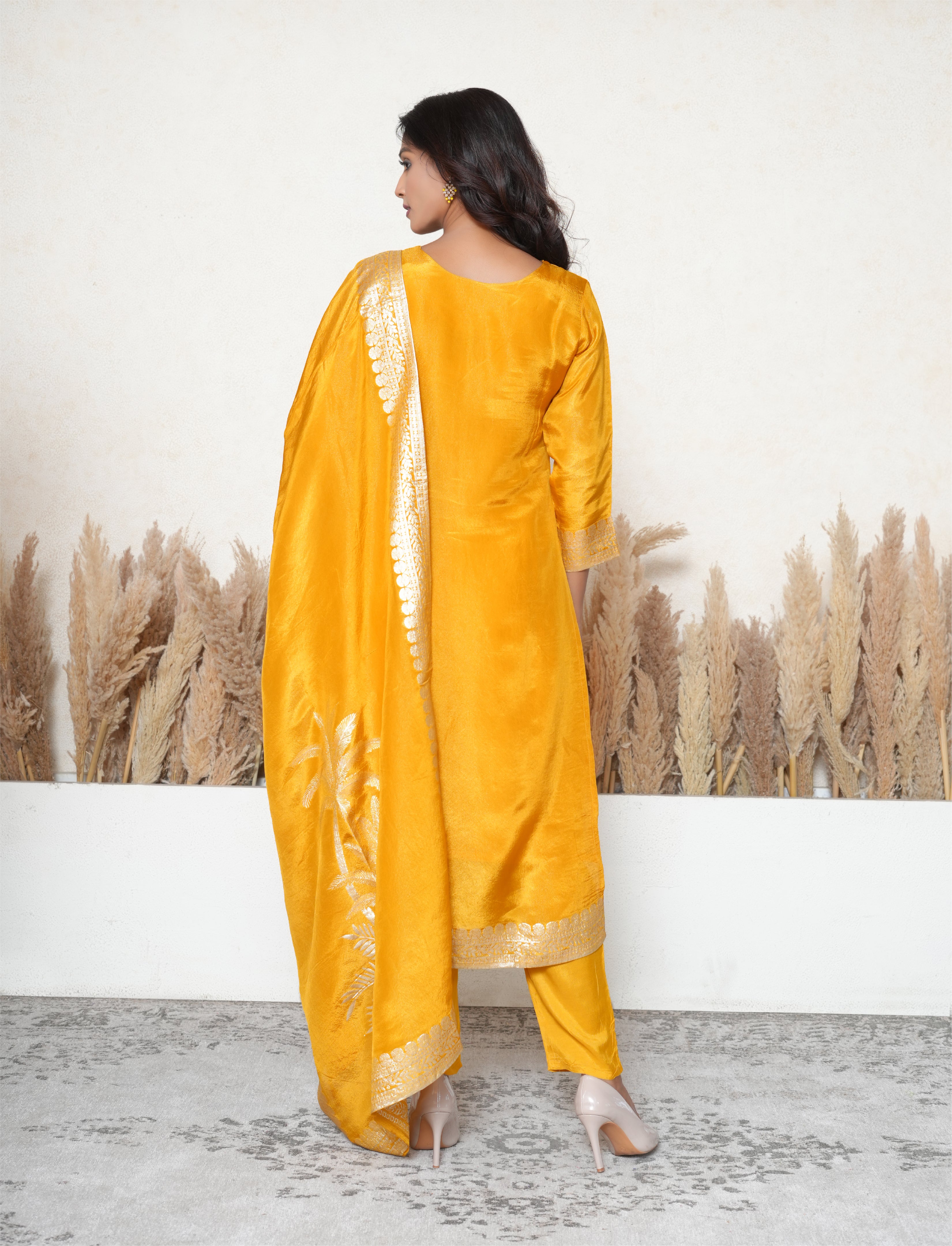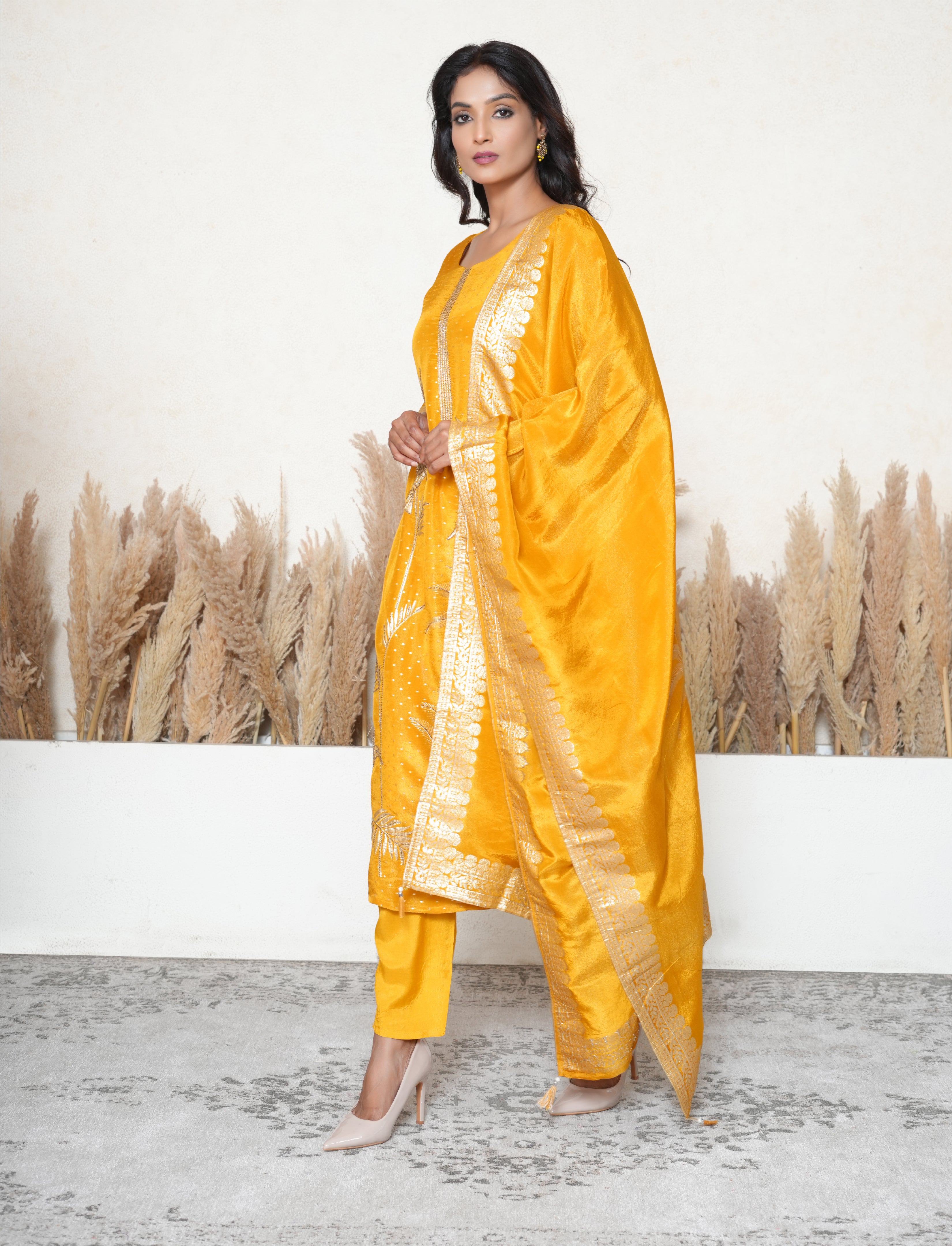 Infuse your wardrobe with a burst of warmth and artistry in this striking fire yellow silk blend suit, crafted for those who appreciate unique detailing with a traditional twist. The kurta features a classic round neckline and is adorned with delicate booties all over, adding subtle texture and elegance.
