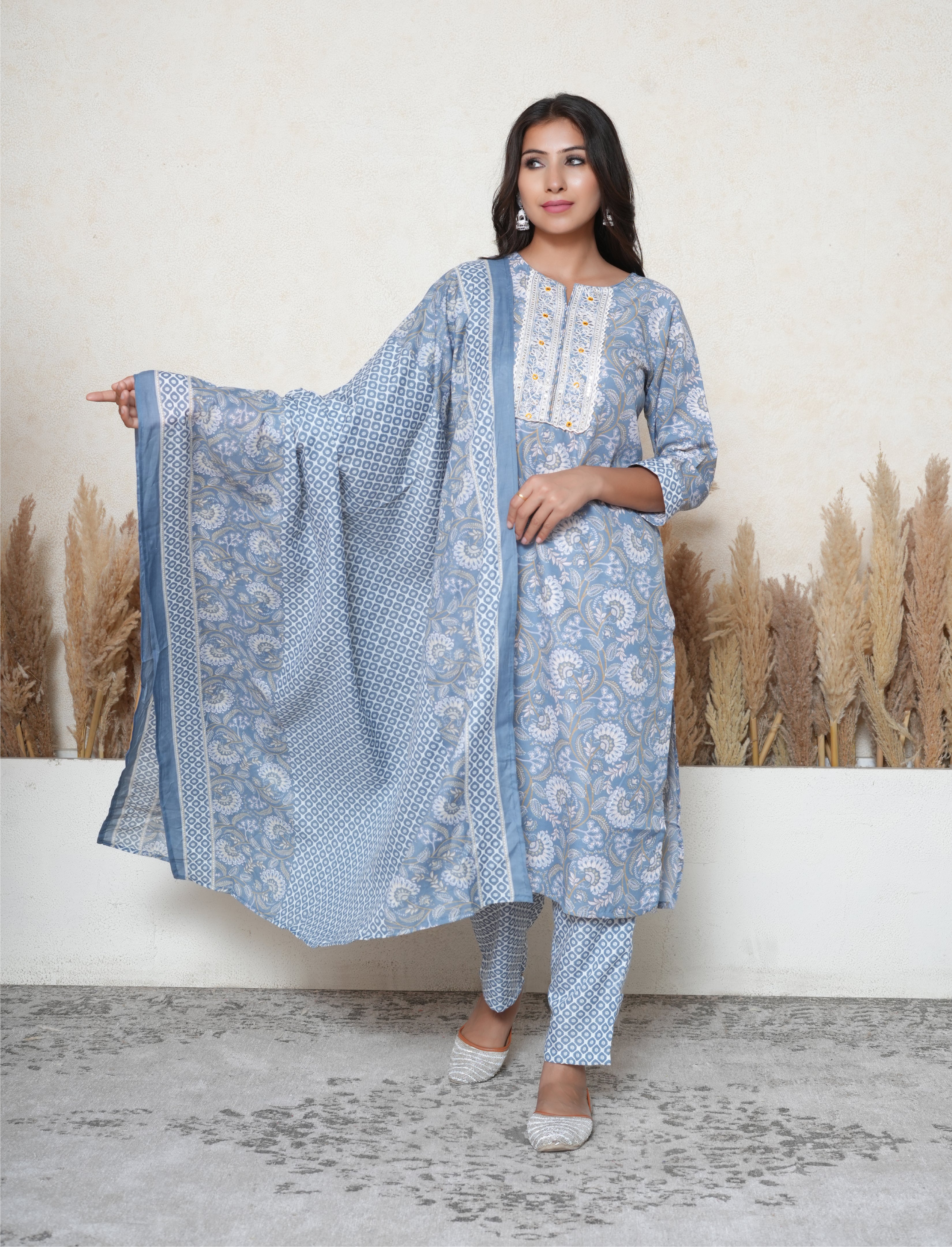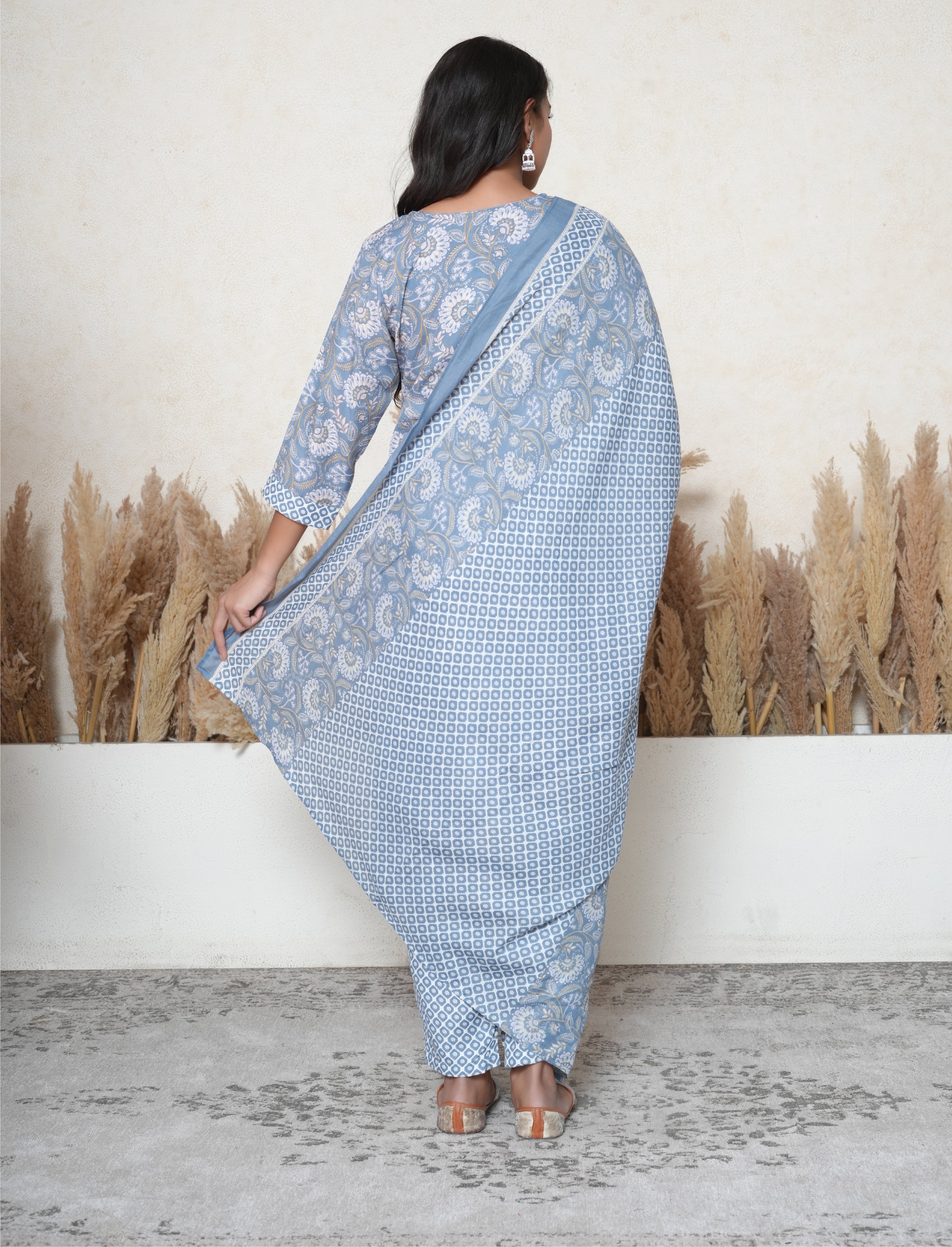 Paired with comfortable cotton pants and a matching printed cotton dupatta, this suit offers the perfect blend of comfort and artisanal charm.