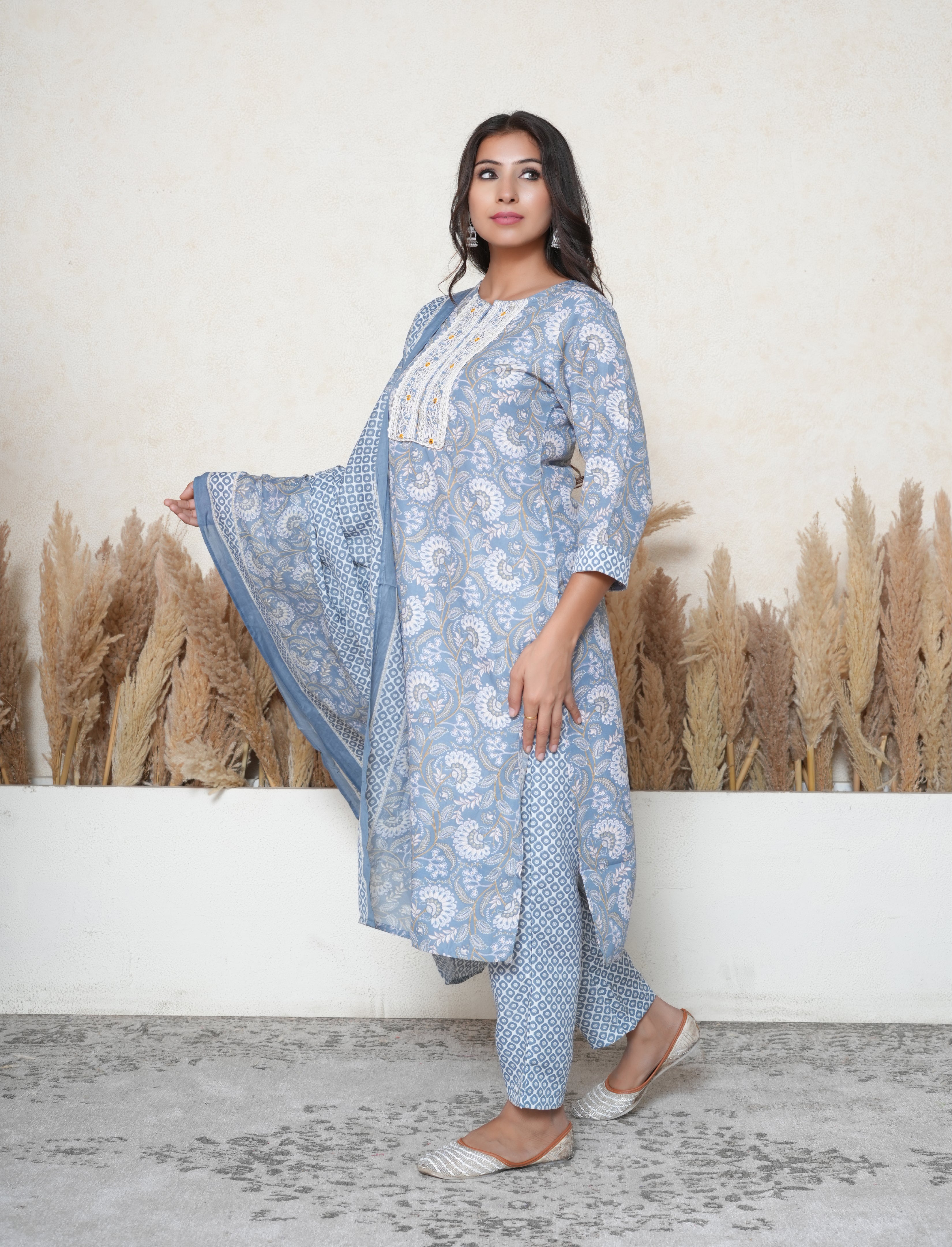 Elevate your everyday ethnic style with this sophisticated grey cotton suit, featuring a beautifully detailed cotton kurta adorned with traditional Kalamkari print. The yoke is enhanced with delicate lace detailing, artfully decorated with shimmering mirrors that catch the light with every move, adding a subtle sparkle to the design.