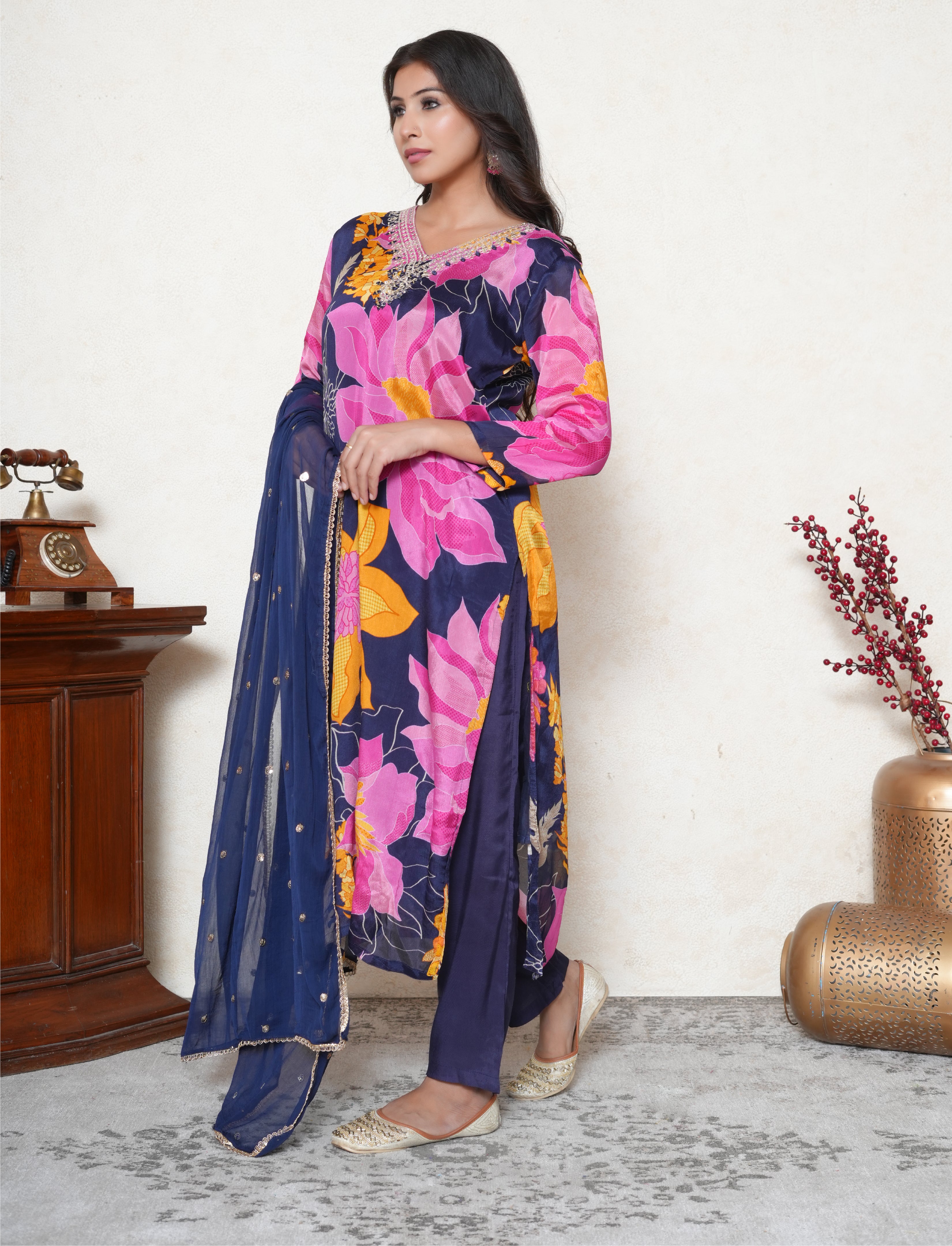 Embrace the traditional look with this eminence purple kurta set. This crepe silk kurta features a floral pattern along the kurta and 3/4th sleeves. It boasts a V-neckline accentuated by zari threadwork complemented with sequins detailing. To complete the ensemble, it is paired with purple straight-fit silk blend matching pants along with a chiffon dupatta with lace border and sequins detailing all over it.