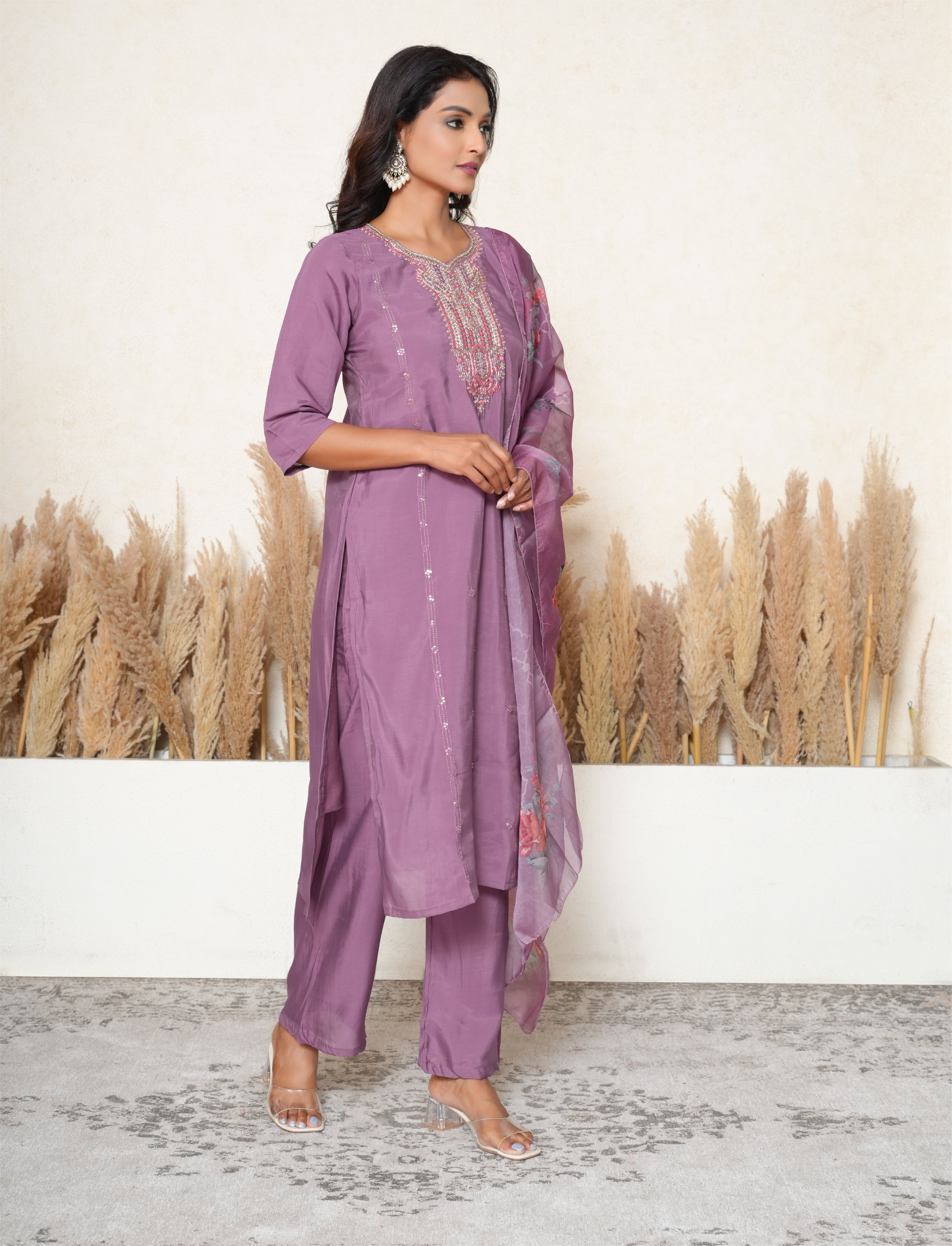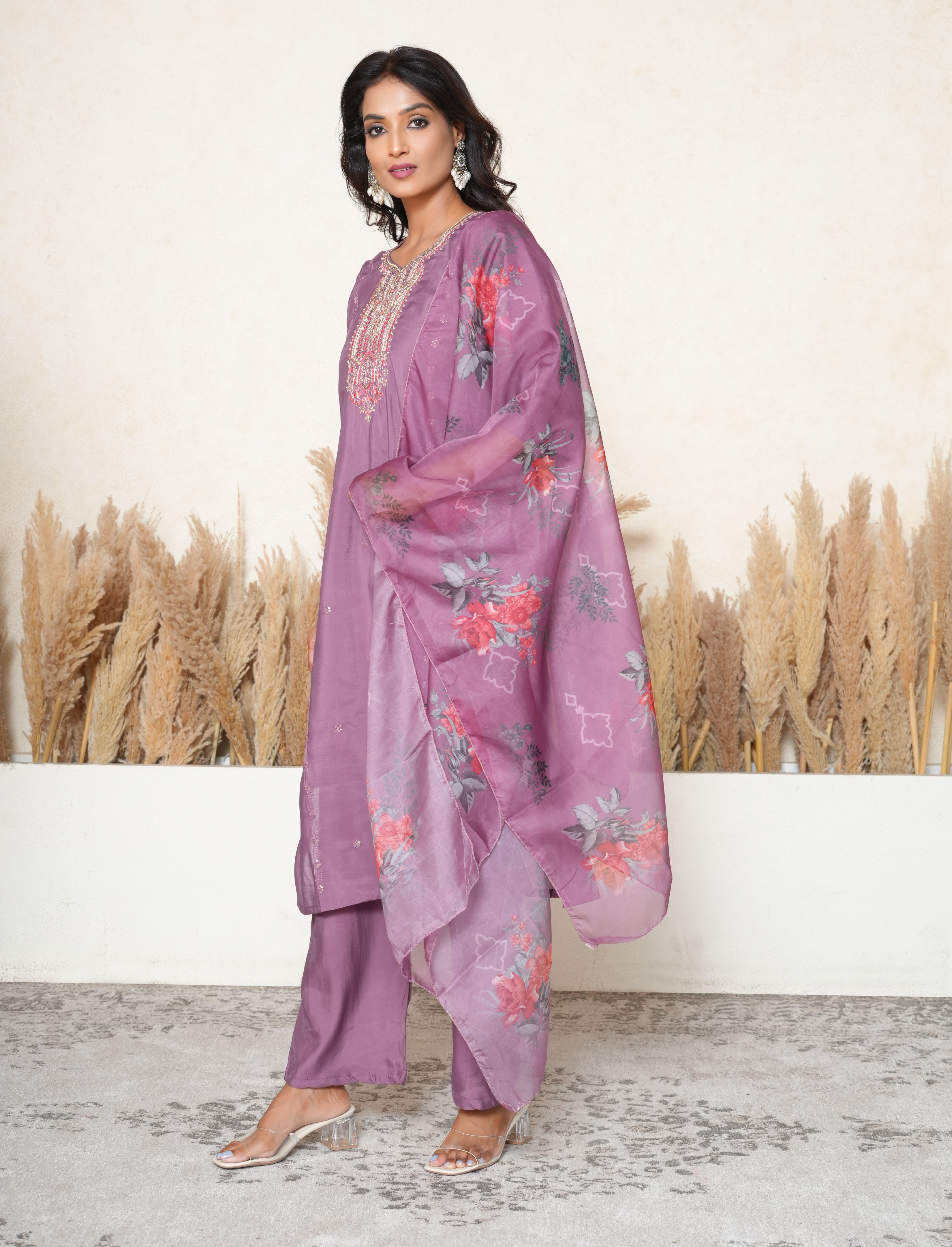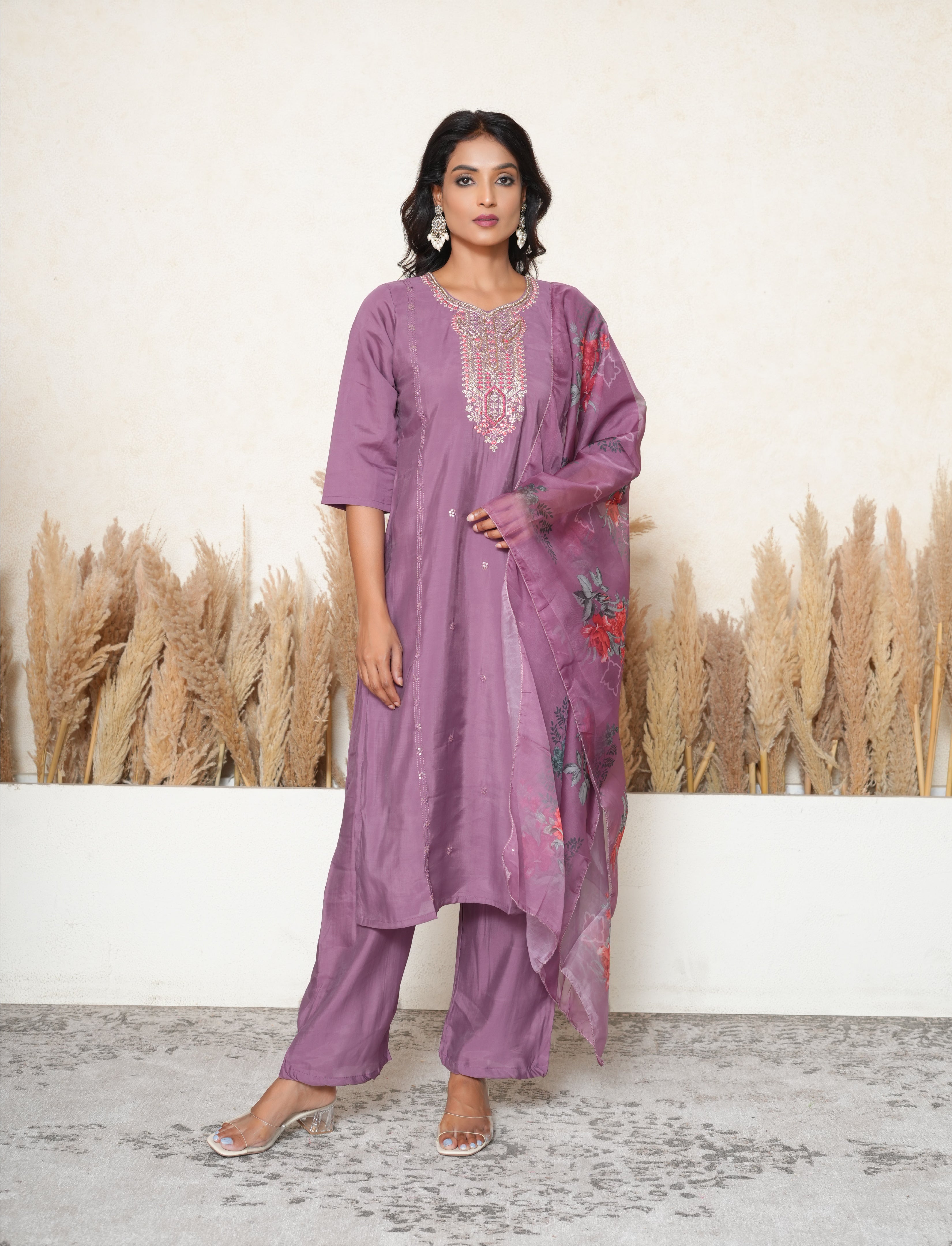 Make a statement in this elegantly stitched iris purple suit, crafted for refined grace. The silk blend kurta features a heart-shaped neckline, adorned with intricate zari threadwork, shimmering sequins, and delicate cutdana embellishments for a touch of festive sparkle. Paired with silk blend pants and a lightweight organza dupatta showcasing soft floral print, this ensemble blends tradition with modern charm — perfect for daytime celebrations or evening gatherings.