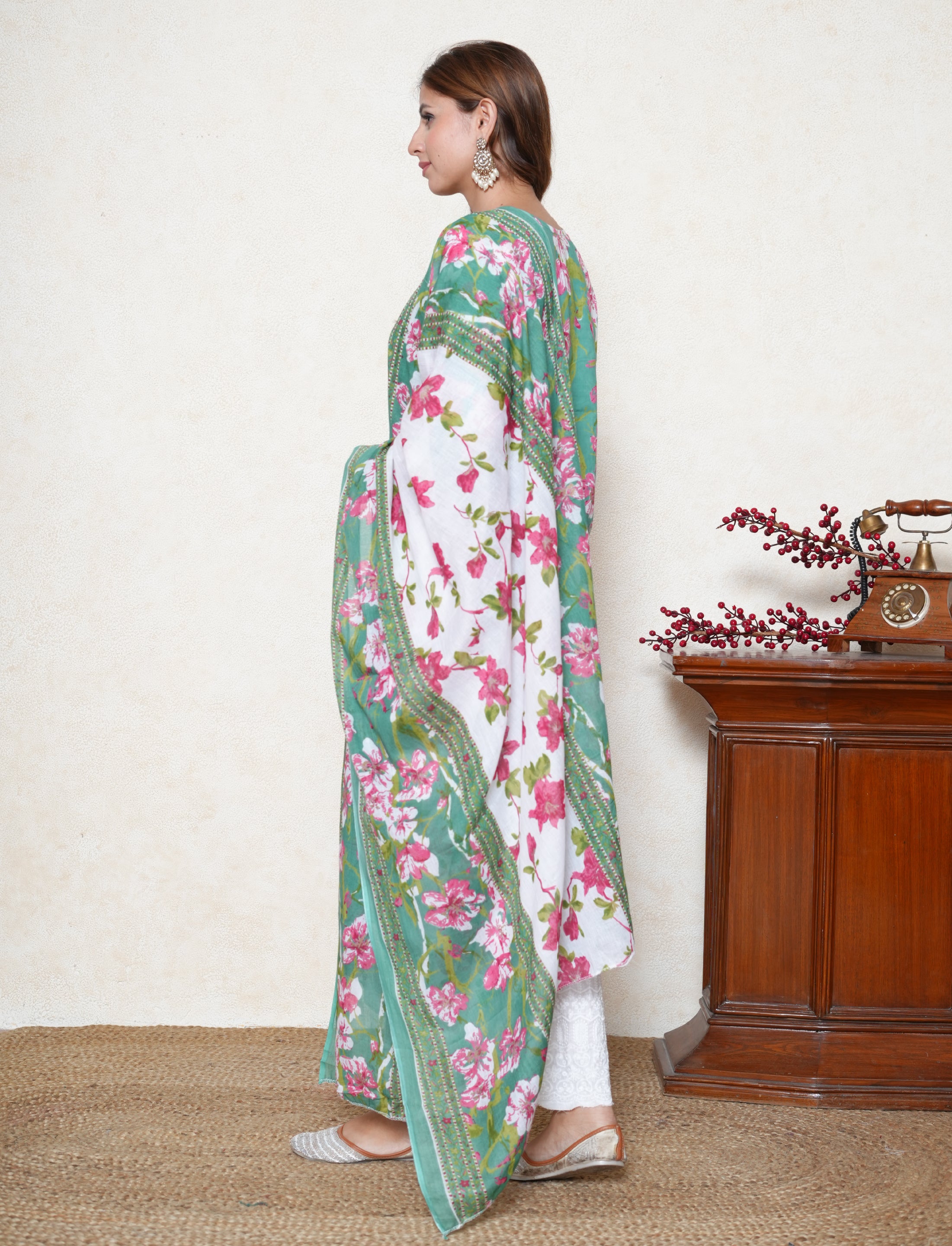Indulge in refined beauty with our cotton floral print V-neck jade green suit set with dupatta. The cotton kurta features a V-neckline adorned with intricate embroidery, complemented by mirror detailing and a delicate lace border. Completing the ensemble are solid white elasticated cotton pants and a white printed cotton dupatta, ensuring both comfort and style. This suit allows you to showcase your grace and charm effortlessly.