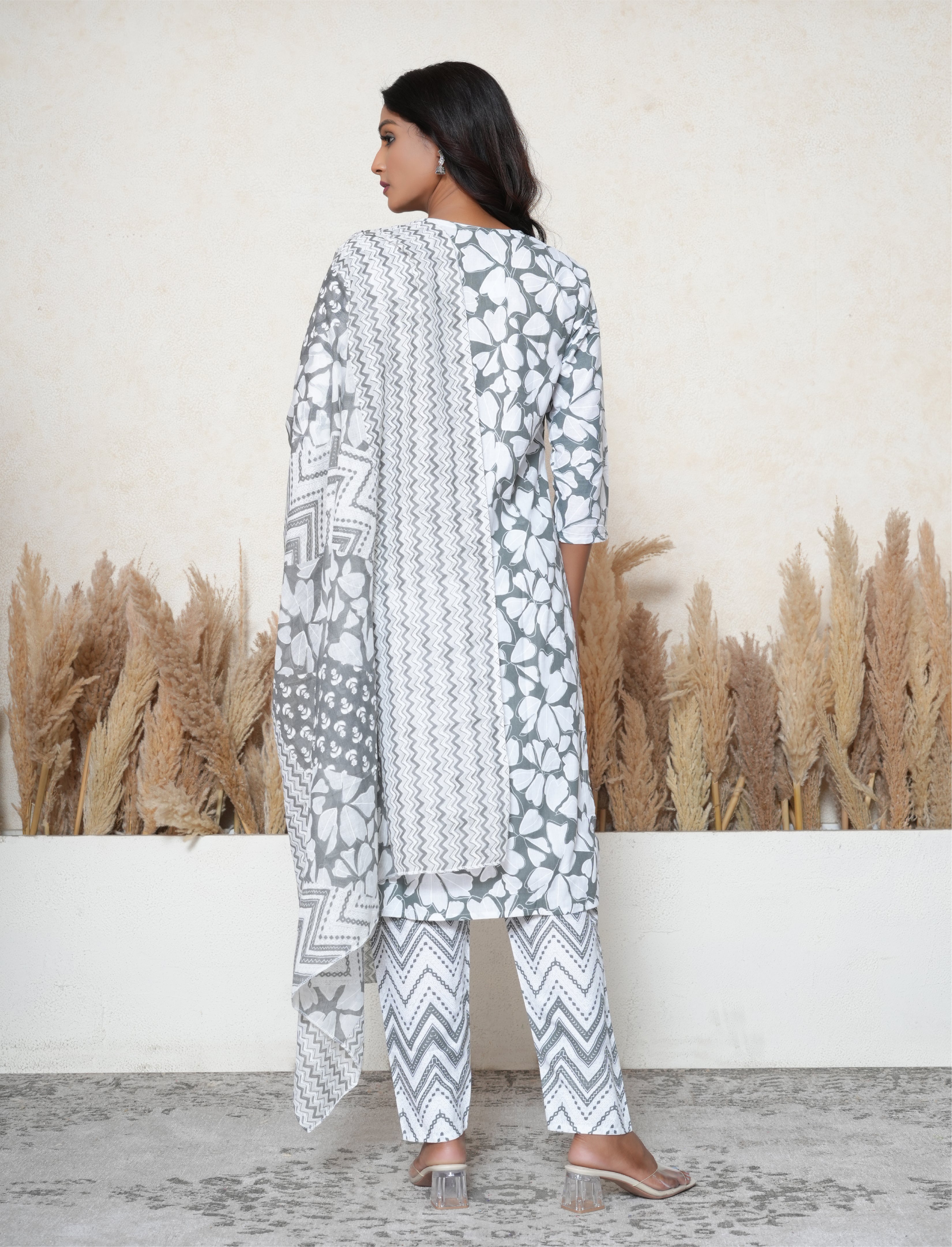 Elevate your ethnic wardrobe with this elegant Lava Grey and White cotton stitched suit set, a timeless blend of traditional charm and contemporary style. Crafted from soft, breathable fabric, this cotton kurta features a graceful floral print that adds a touch of freshness to the classic color palette. The V-neckline is beautifully adorned with intricate thread embroidery, delicate mirror detailing, sequins, and lacework, creating a stunning focal point that captures attention. The matching cotton pants continue the refined look, while the lightweight cotton dupatta offers effortless draping and completes the ensemble with understated elegance.