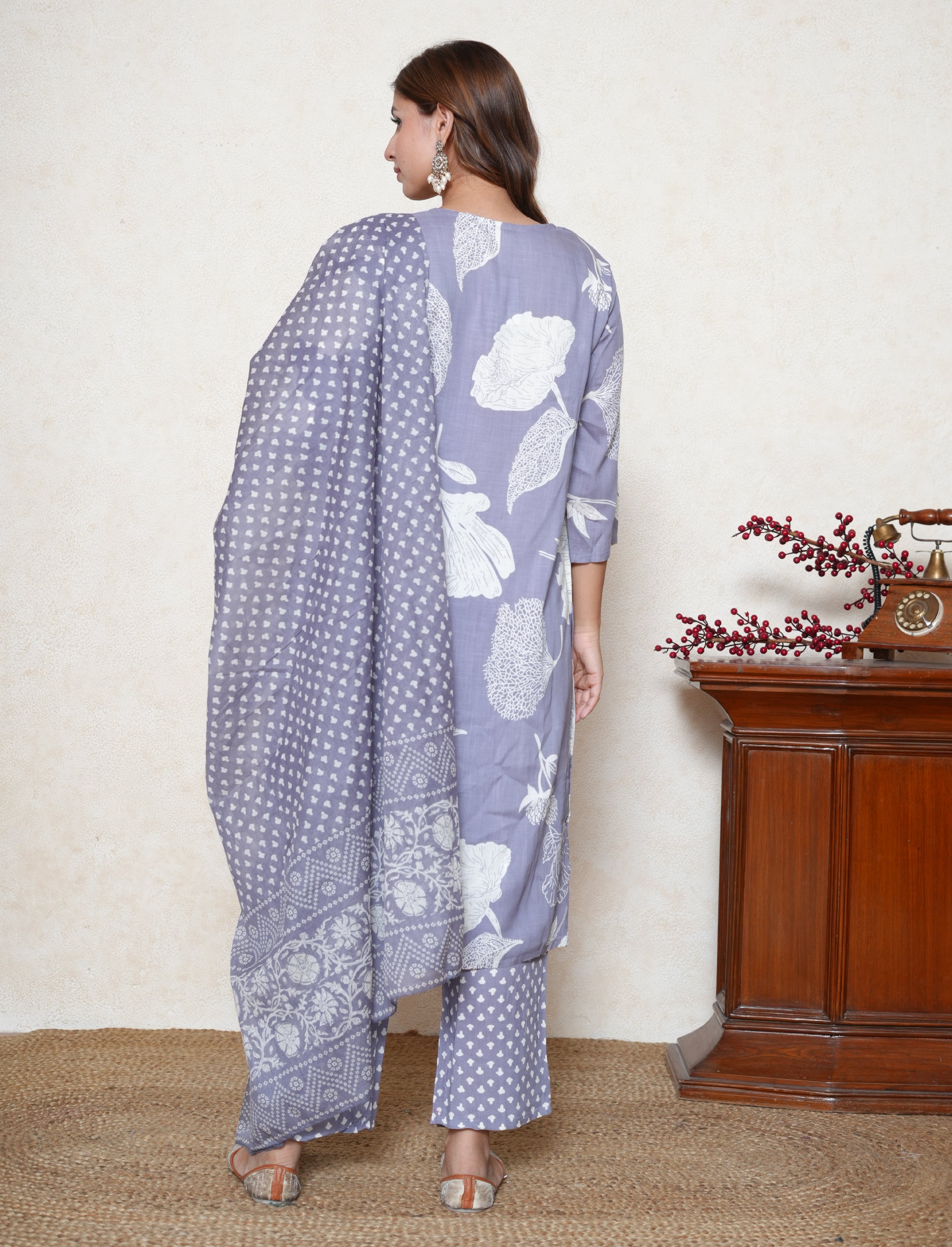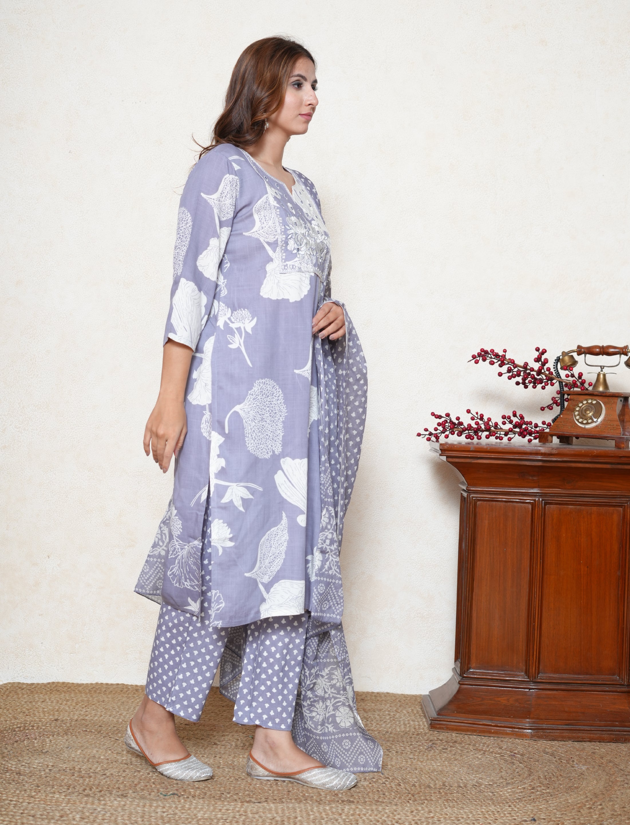 All you need to look gorgeous is this lavender blue kurta, pant, and dupatta set. This fine rayon kurta features a notch neckline with a statement embroidered yoke adorned with mirror detailing. The look is completed with printed cotton pants and a matching printed cotton dupatta, offering a perfect blend of comfort and charm.