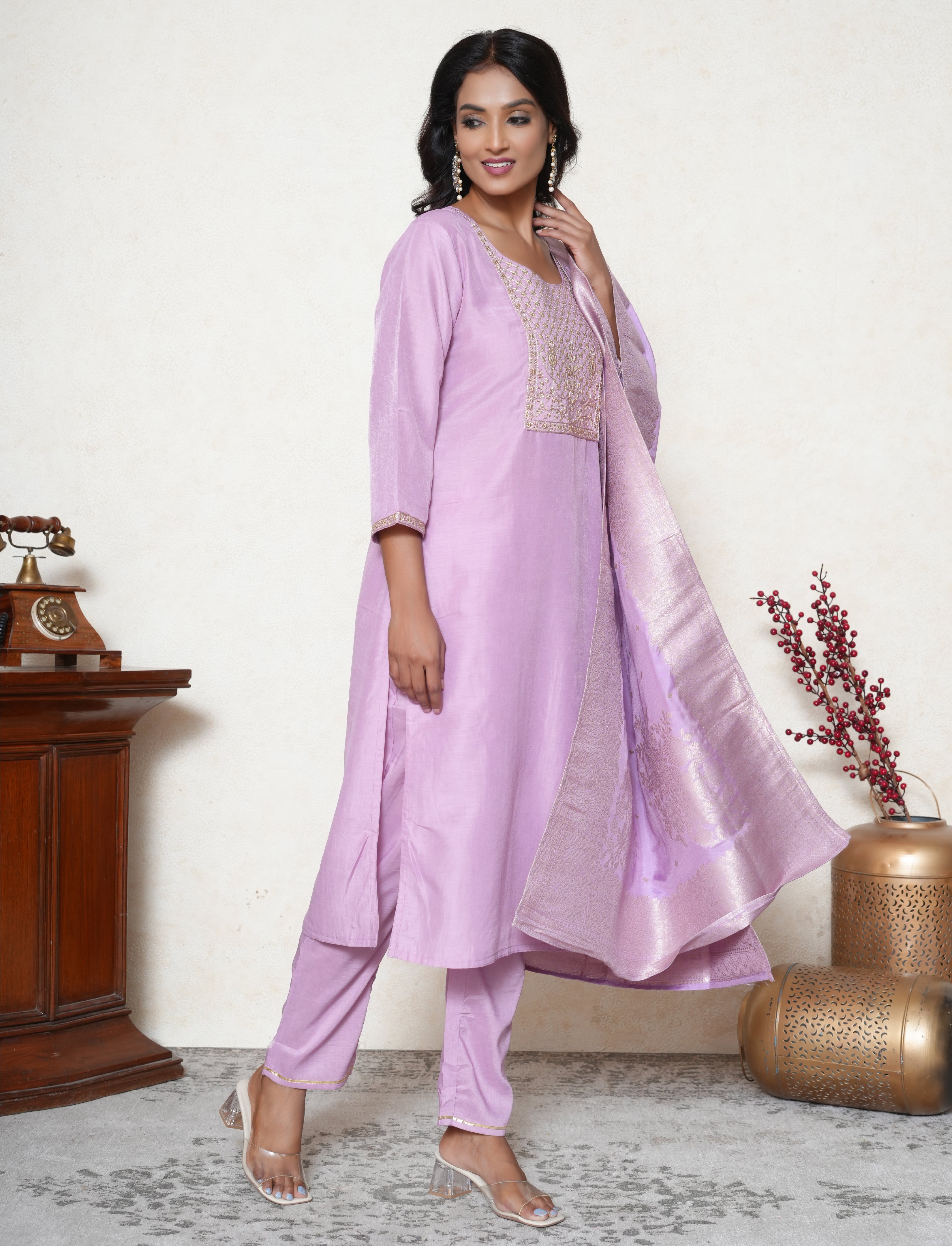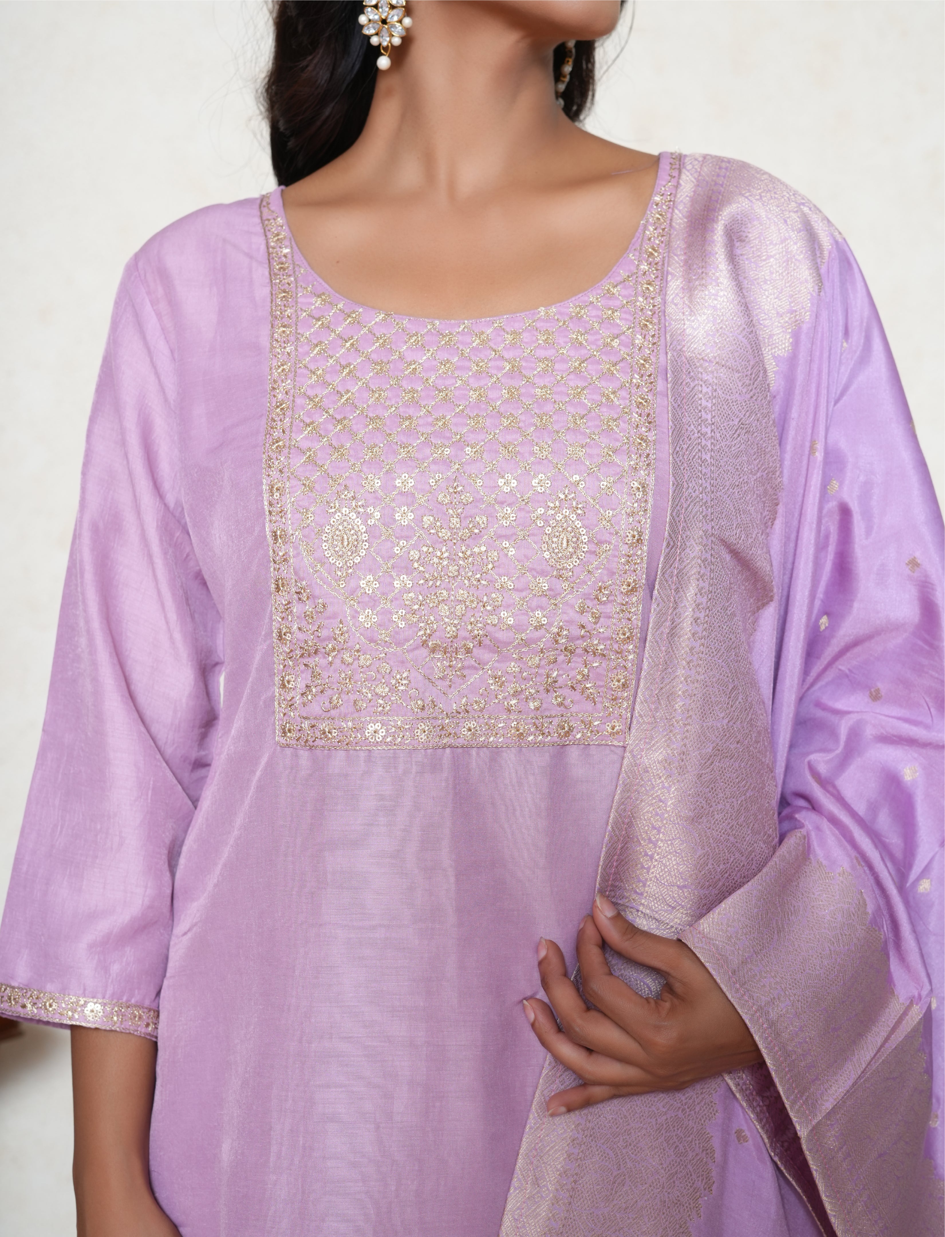 This 3-piece silk blend suit set features a straight-fit silhouette with a round embroidered neckline. It has quarter sleeves with delicate embroidery along the hem. Paired with silk blend pants and a silk blend Banarasi dupatta, this ensemble offers a refined and graceful look, perfect for special occasions.