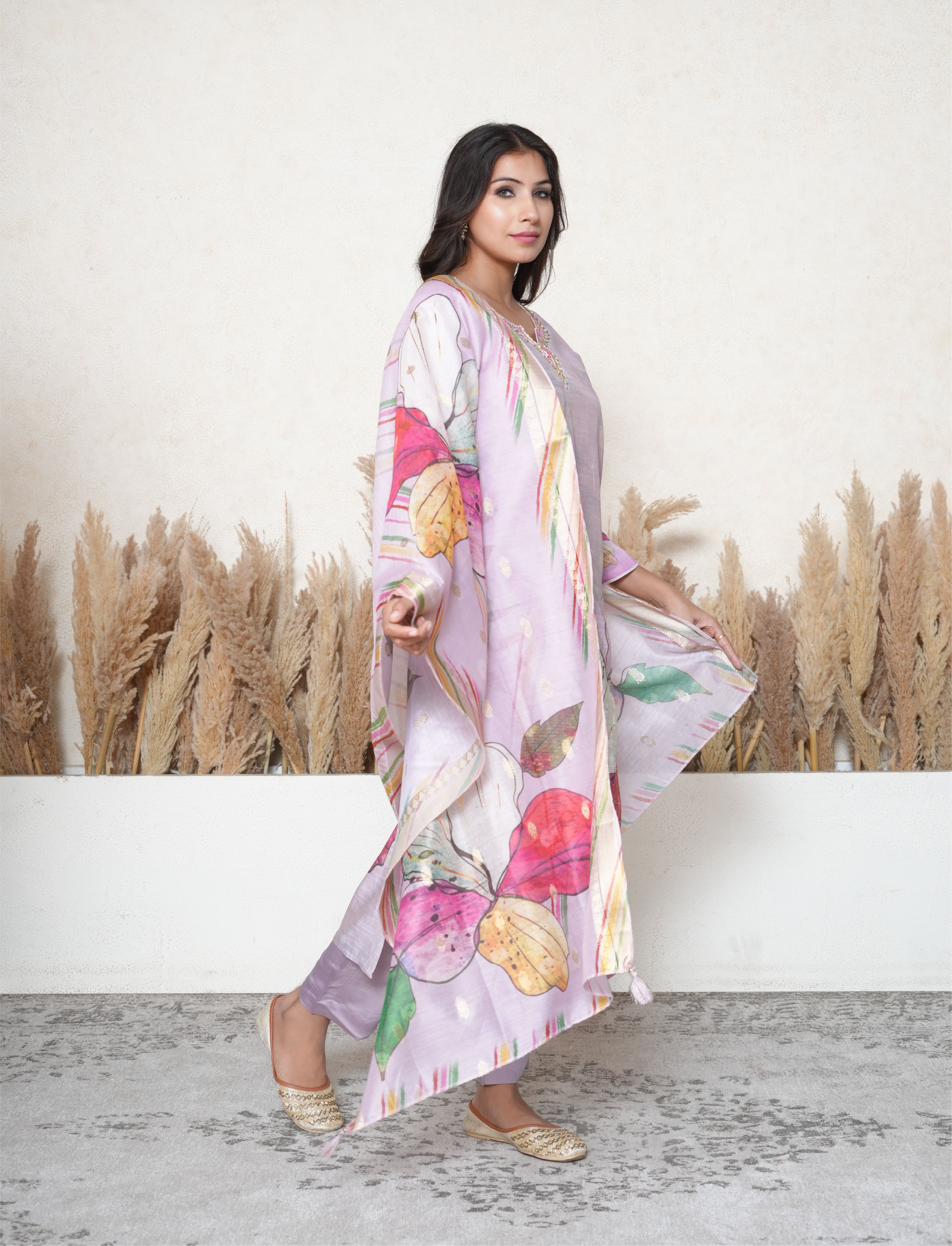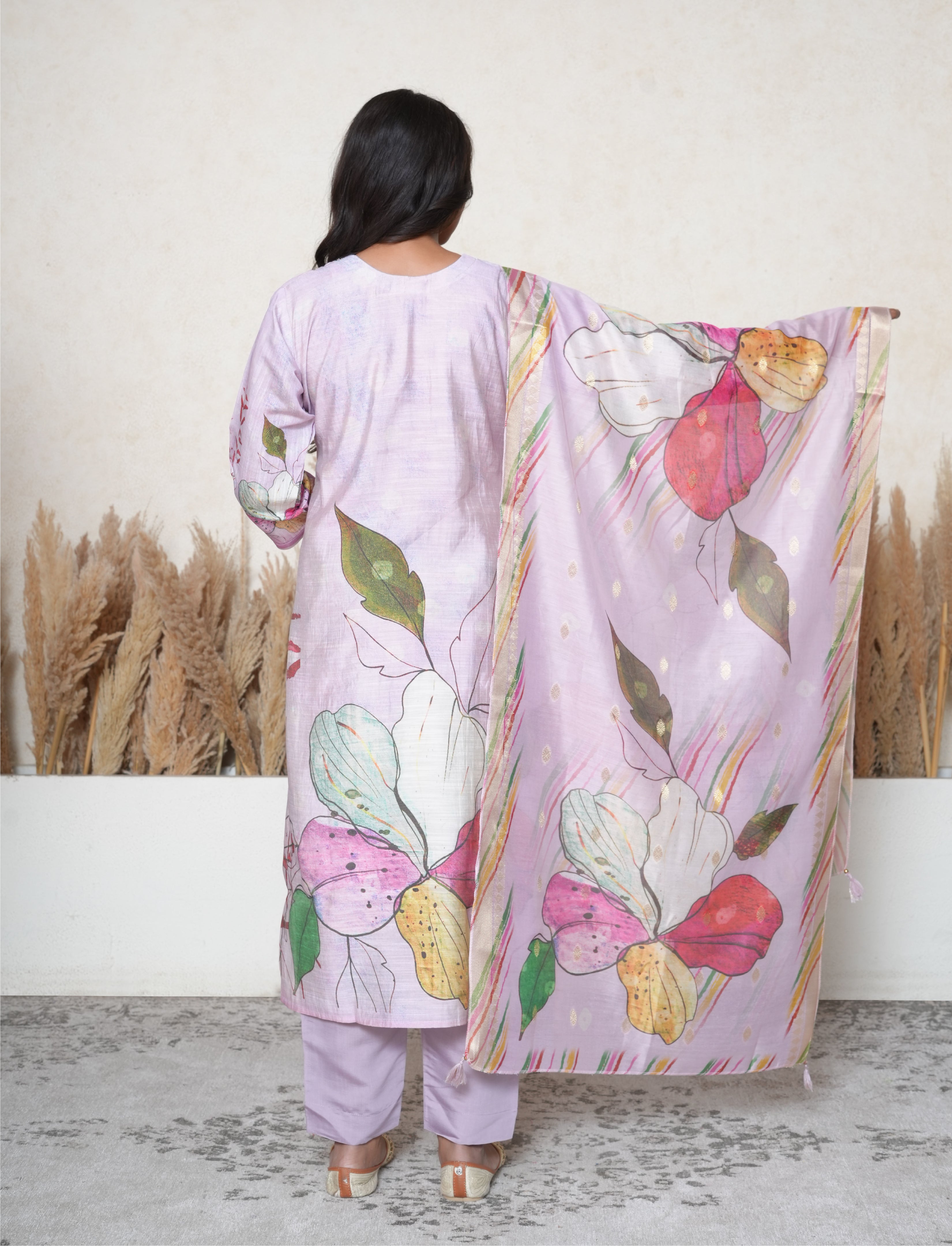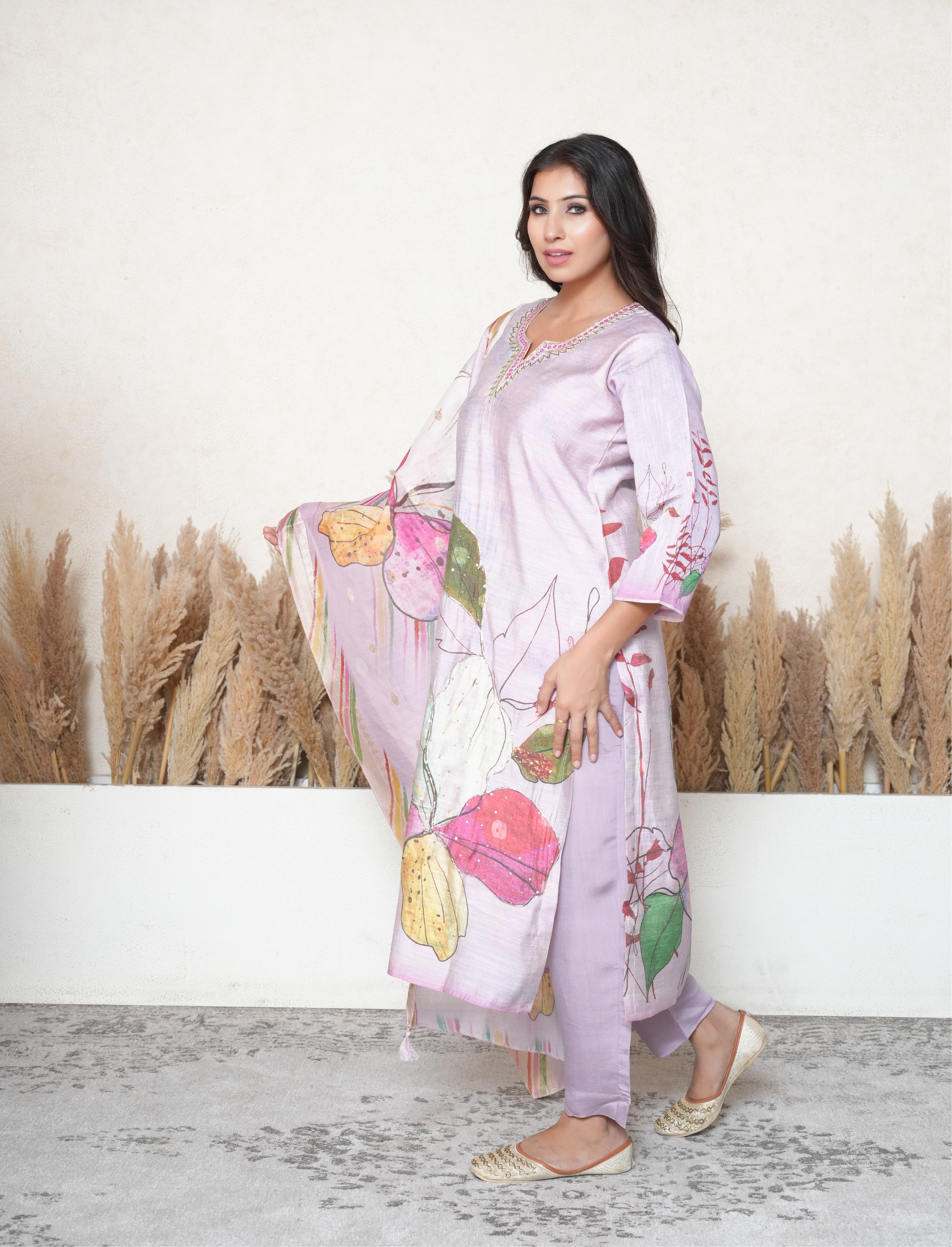 Let your wardrobe bloom with sophistication with this finely tailored suit. It features an artistically crafted silk blend kurta with a digital printed floral design, complemented with pita and sequins work. The notch neckline is intricately embroidered with contrast-colored thread, cutdana, and mirror work. It comes with matching straight-fit silk blend pants and a digital printed silk blend dupatta with a banarasi border and zari motifs throughout.