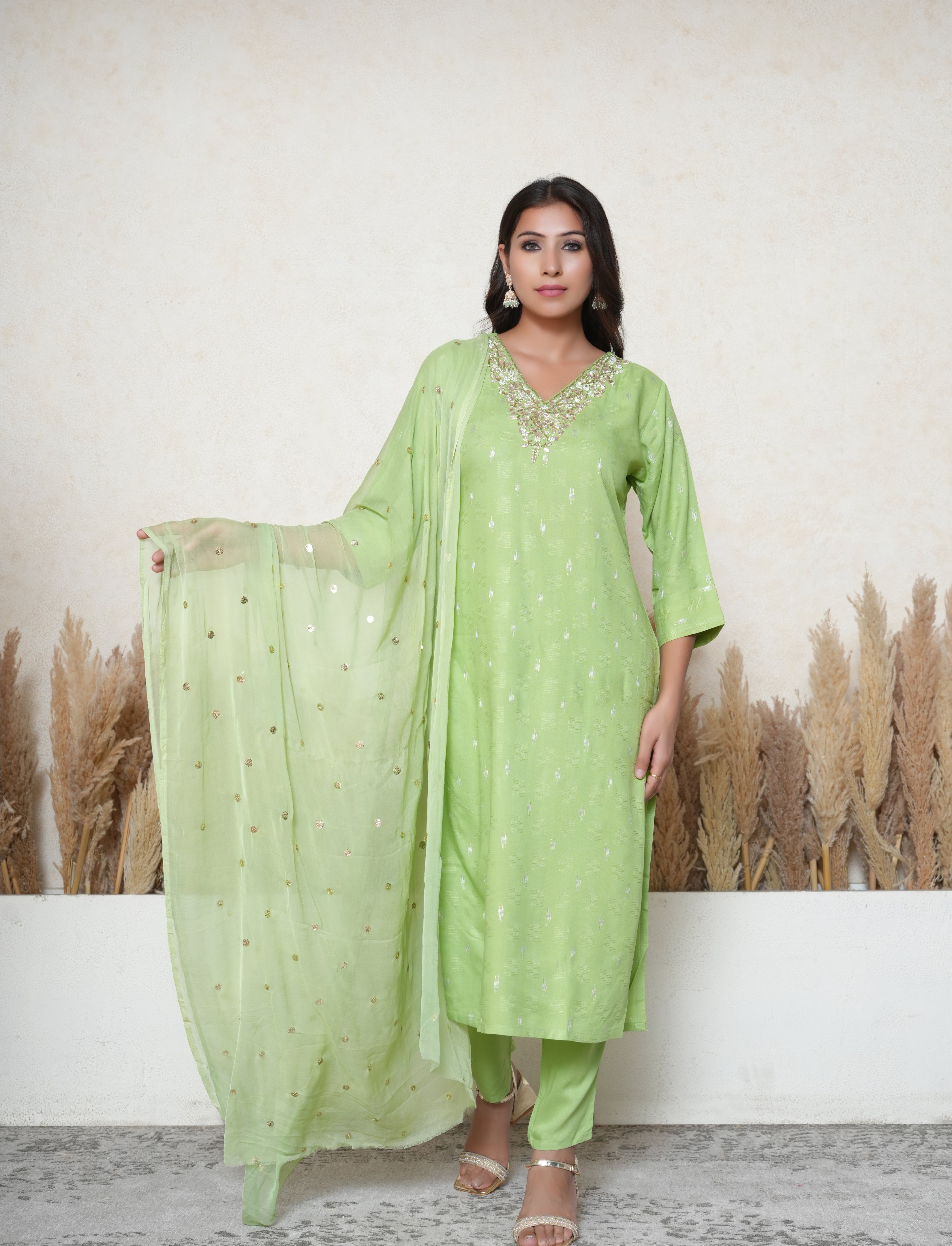 Step into the spotlight with this stunning lime green suit set, designed to add elegance to any occasion. The viscose kurta combines comfort and style, featuring intricate V-neck detailing adorned with delicate pearls, gotapatti, dabka, sequins, and cutdana work, creating a dazzling effect from every angle.