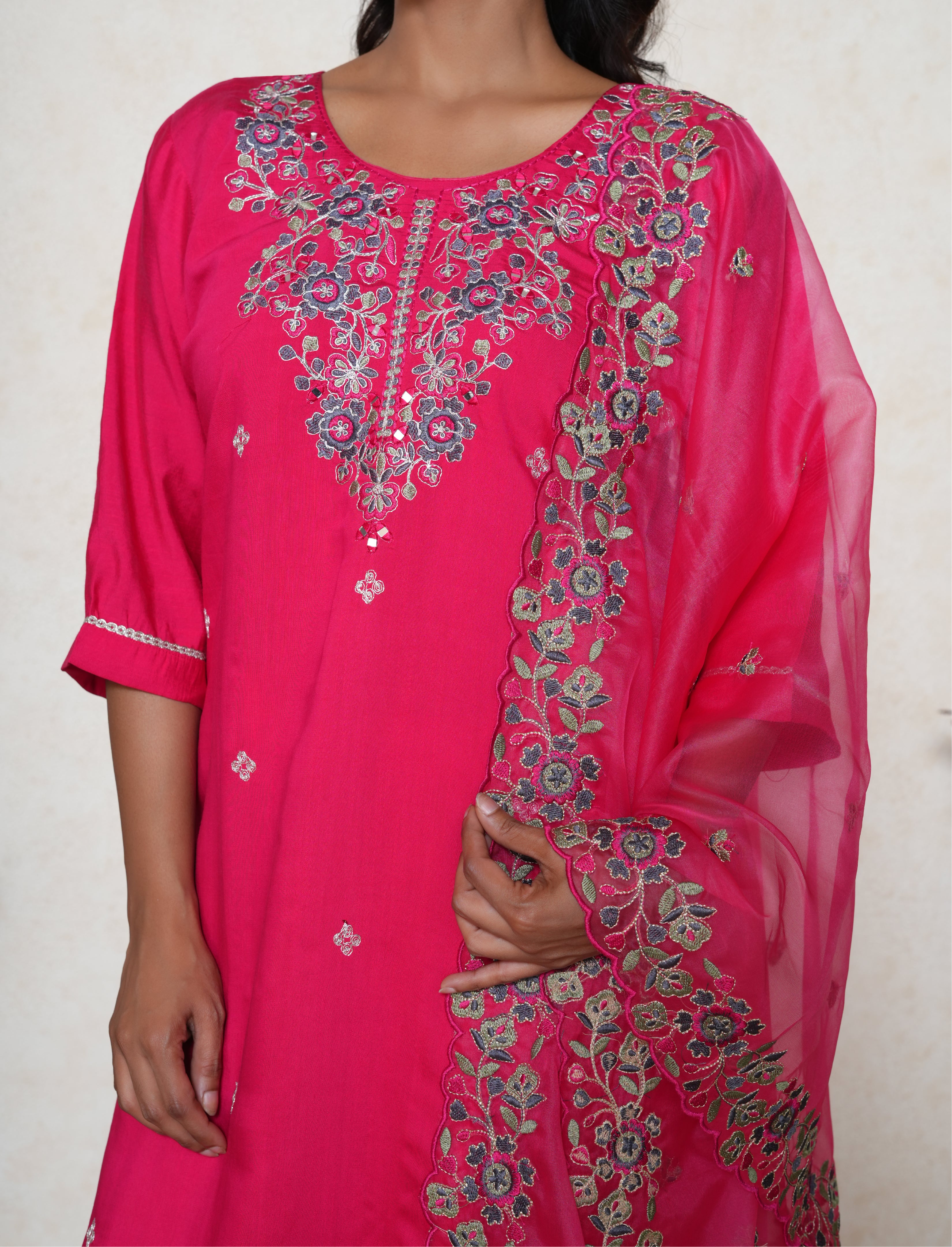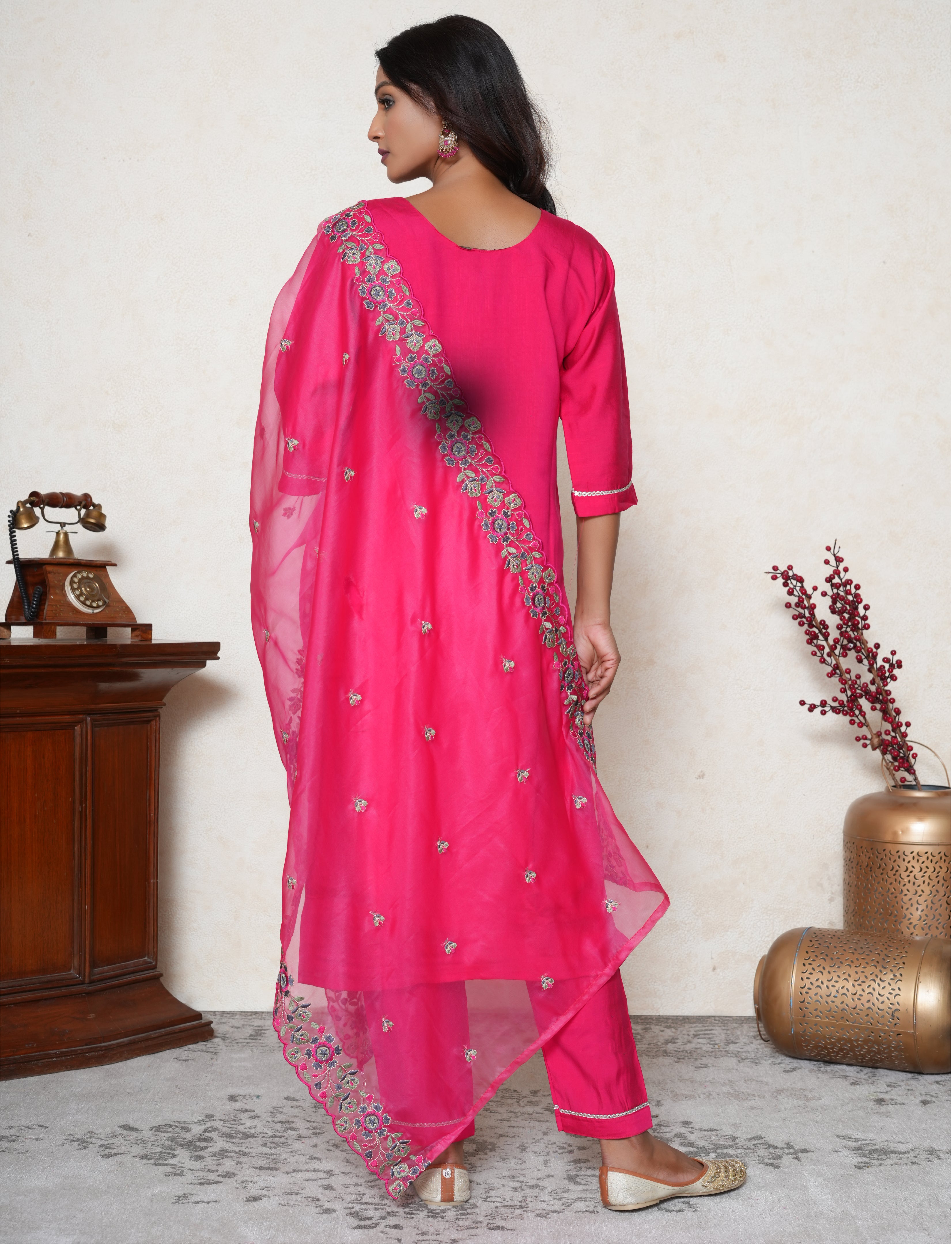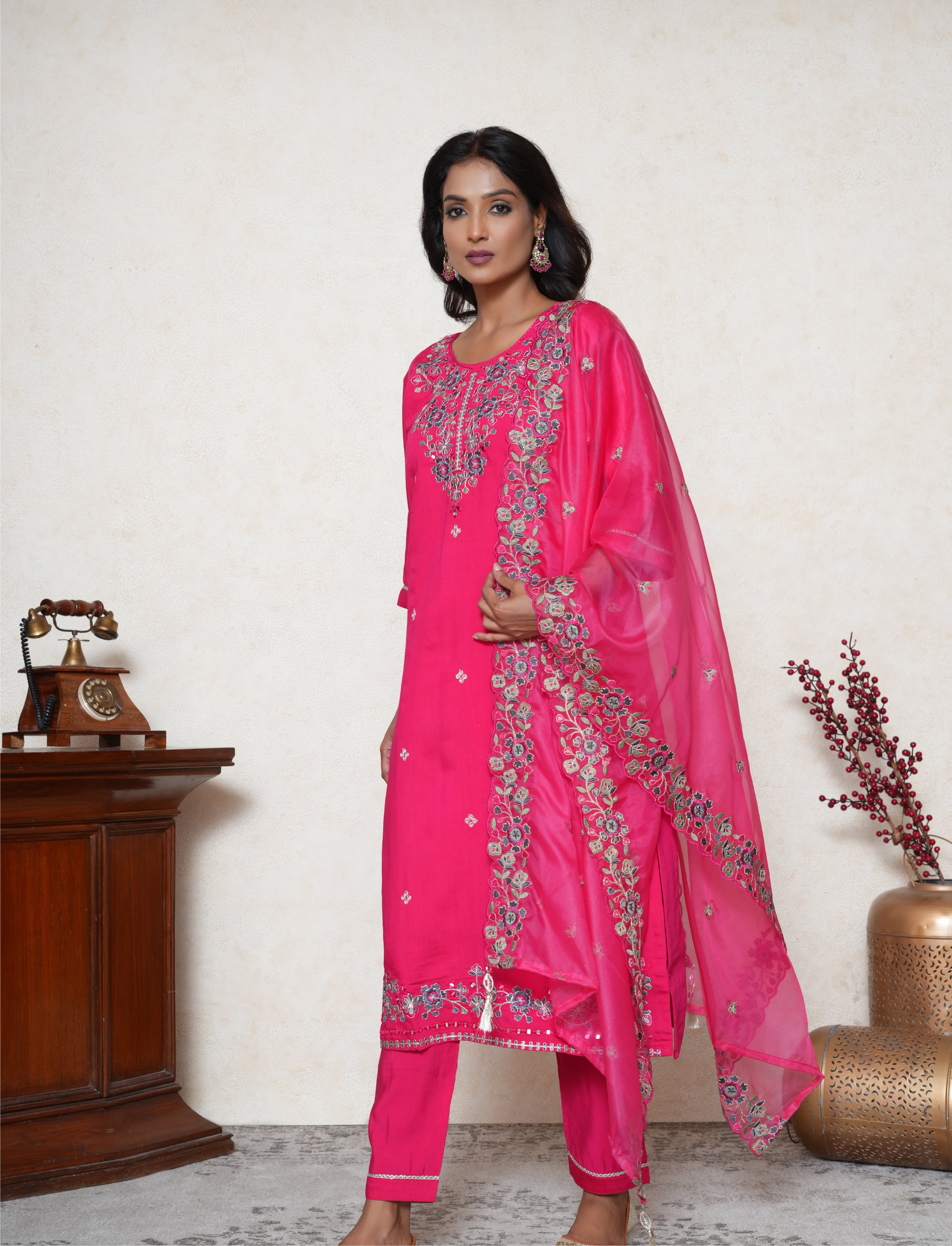 Make a bold yet elegant impression with this beautifully crafted Magenta silk blend Stitched Suit Set, designed to bring timeless craftsmanship to your contemporary wardrobe. The silk blend kurta features a round neckline enhanced with intricate embroidery, combining zari and multicolored threadwork, accented with delicate mirror detailing that adds a festive sparkle. Silver lace borders the sleeves, hem of the kurta, and pants, creating a refined, coordinated finish. The hemline also showcases detailed embroidery, giving the silhouette depth and richness. Paired with matching silk blend magenta pants, this ensemble is both striking and sophisticated. Completing the look is a sheer organza dupatta adorned with small floral embroidered motifs, offering a graceful and lightweight drape—perfect for festive gatherings, celebrations, or elegant daywear.