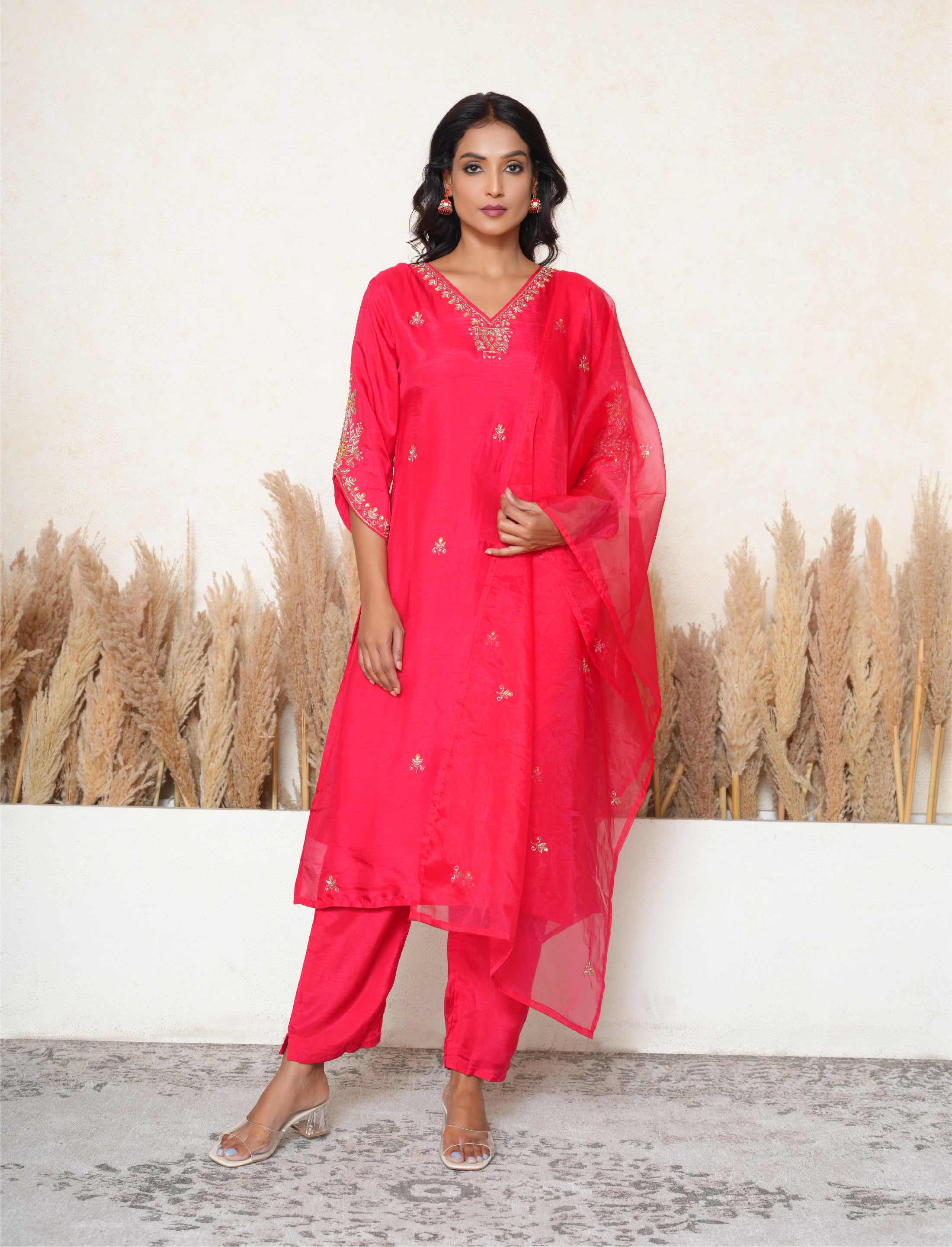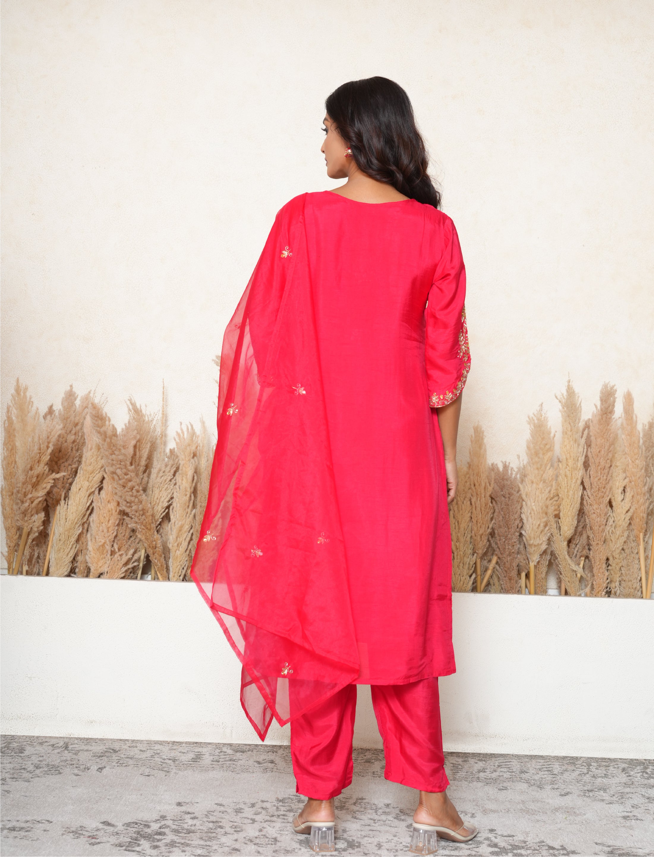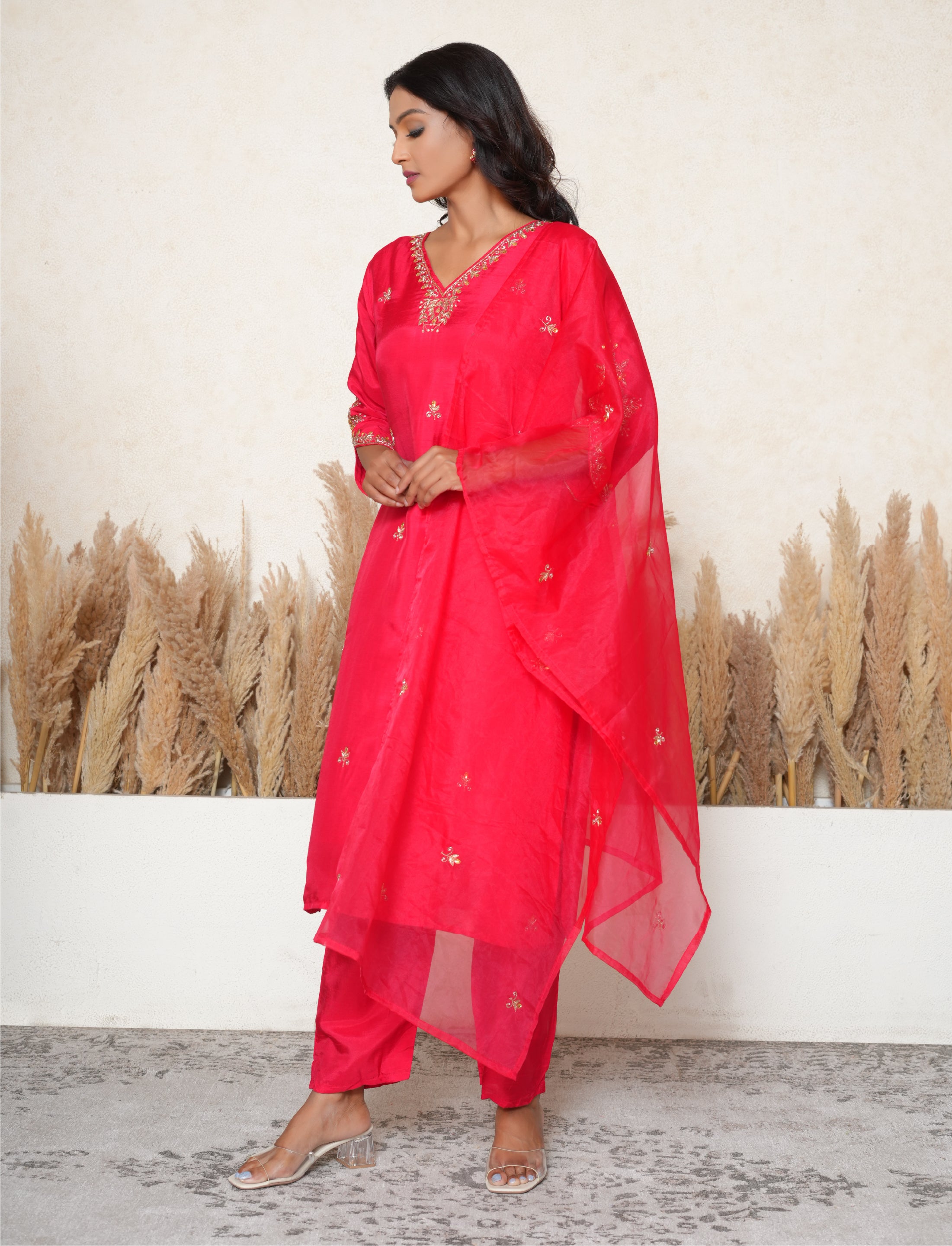 This magenta suit features a silk blend straight-fit kurta with a V-neckline embroidered with gota patti, dabka, cutdana, and pearl work. The kurta is adorned with small bootis all over and showcases elaborate embroidery on the 3/4 sleeves. It comes with a pair of matching silk blend pants and an organza dupatta embellished with small bootis throughout.