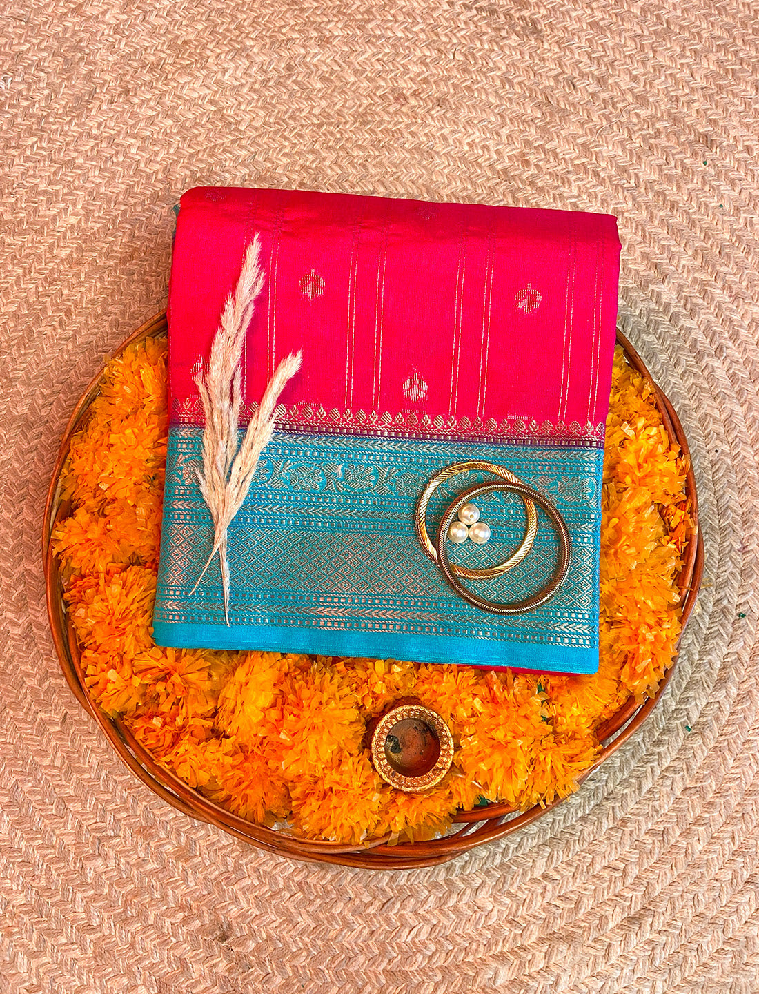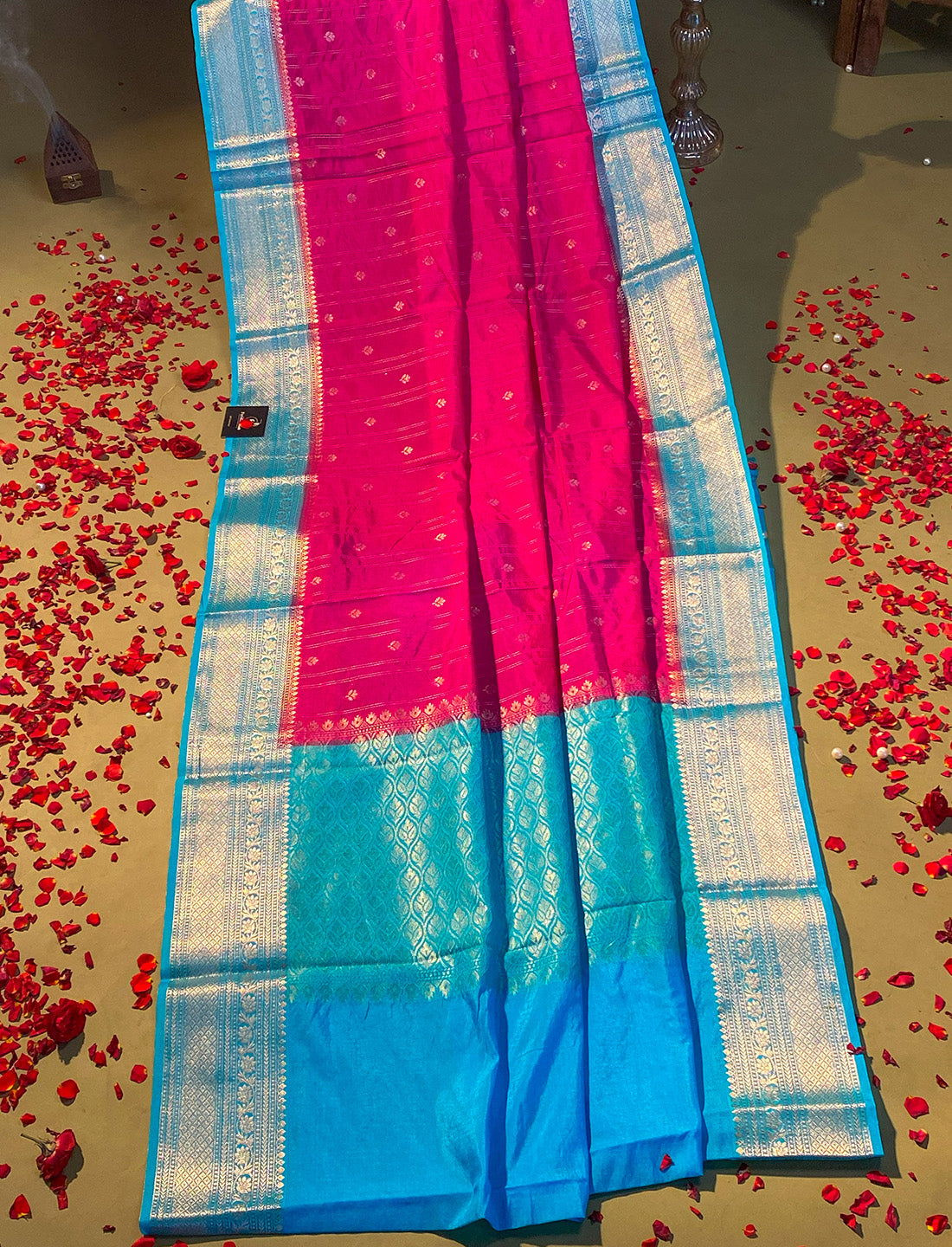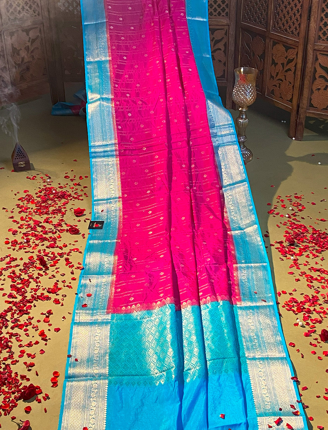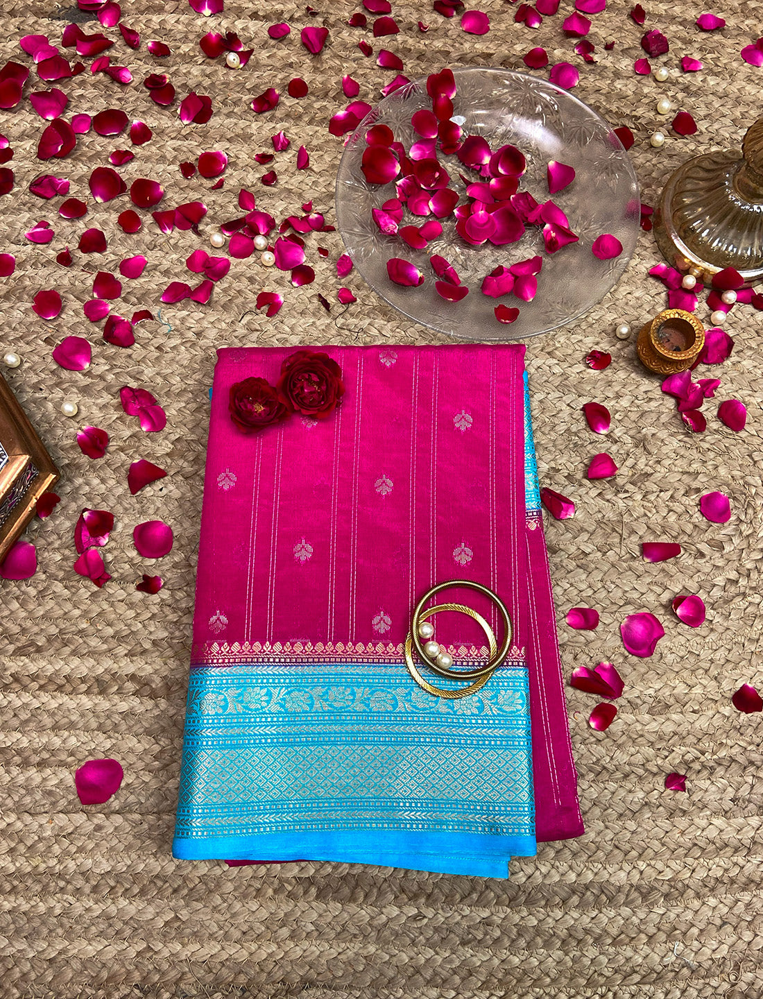 Magenta Pink banarasi crepe silk saree with small zari motifs all over drape, comes with blue contrast celebrated border and pallu.