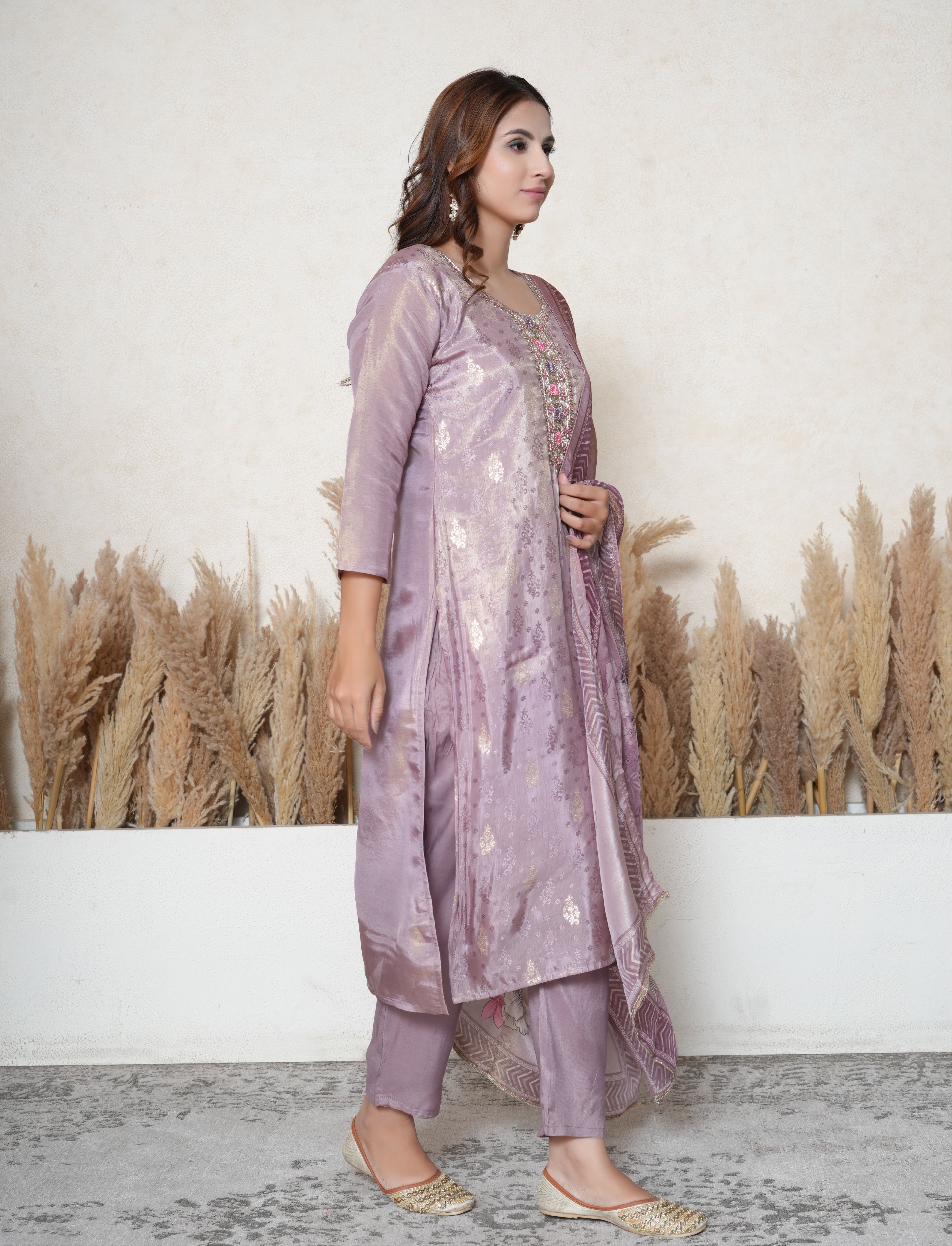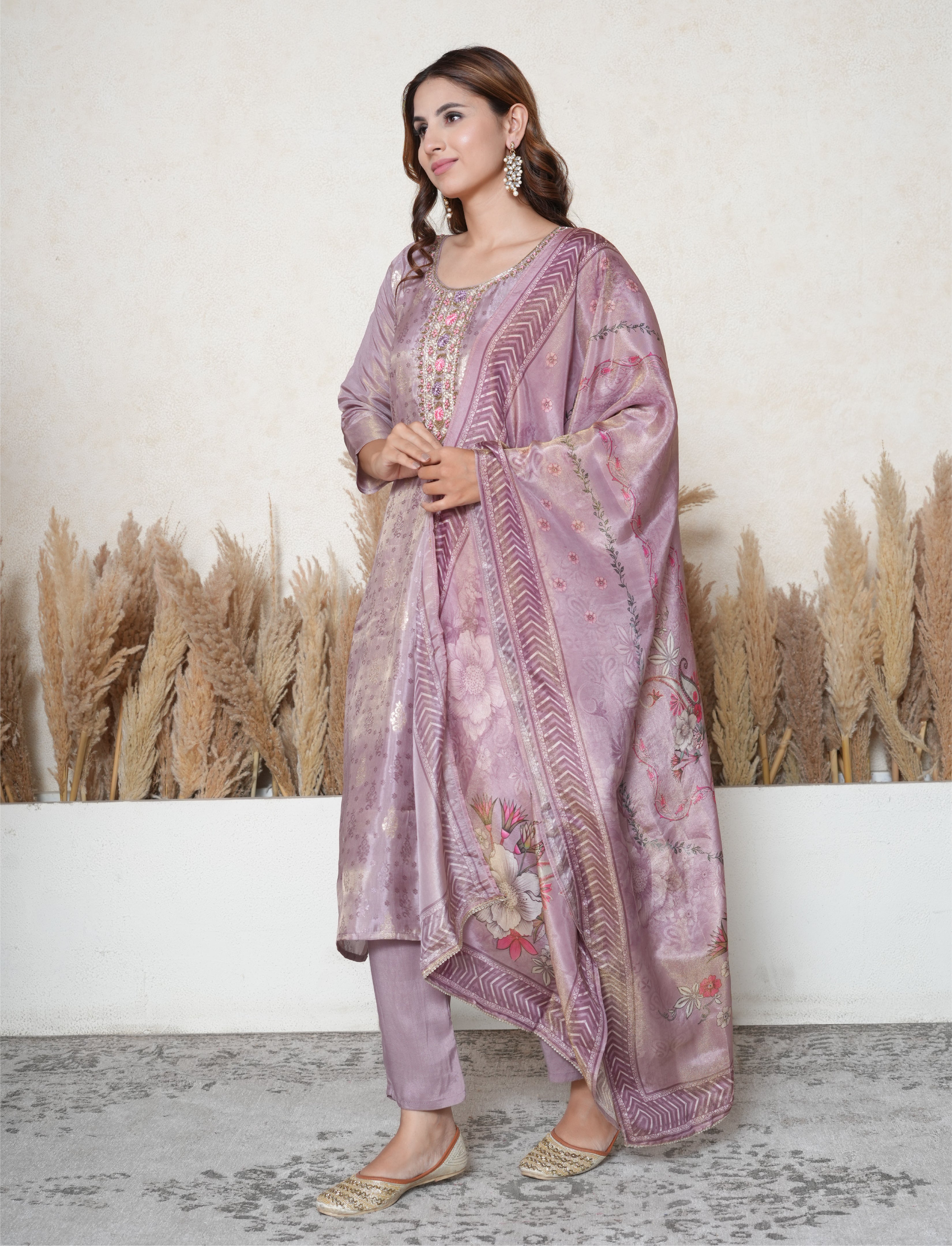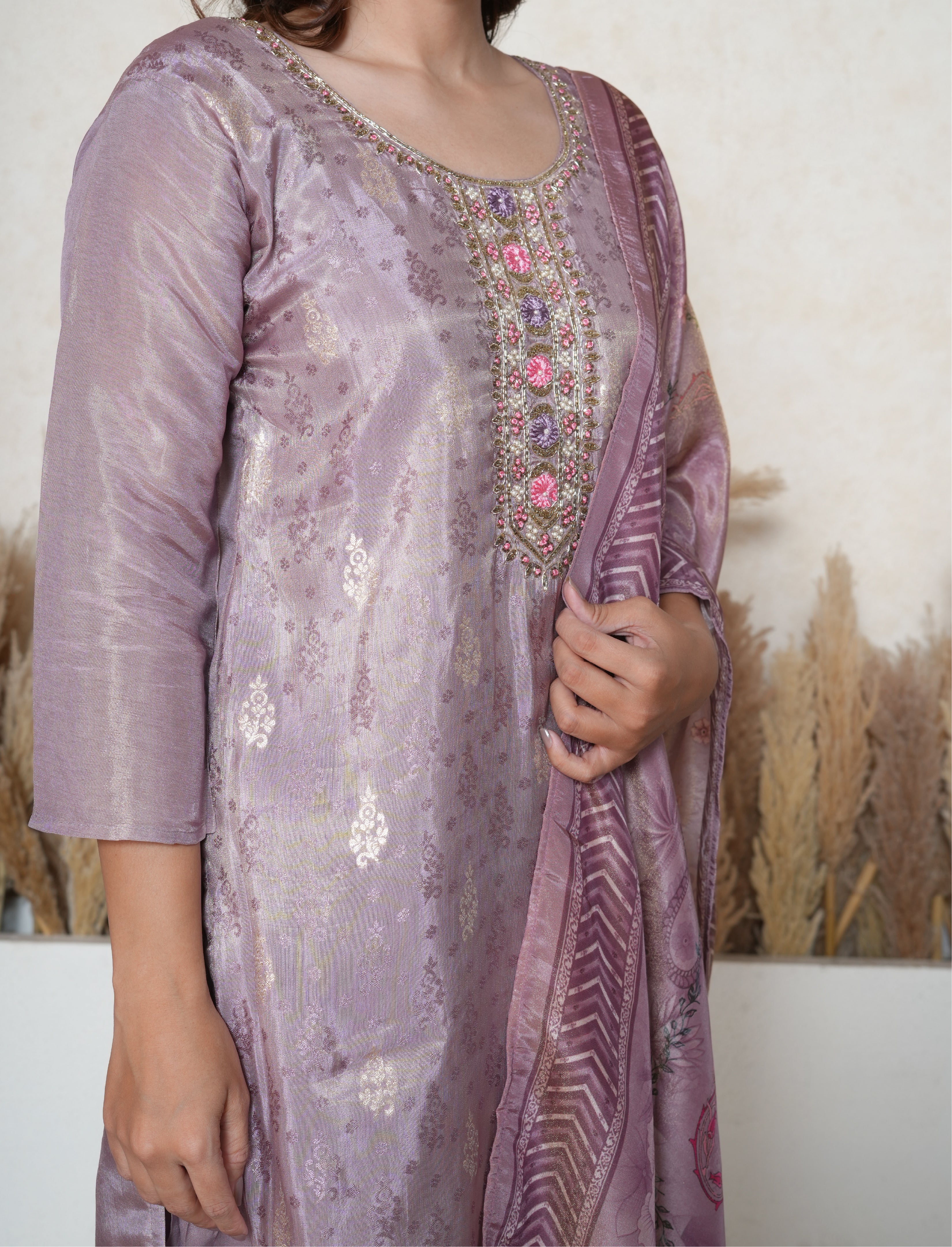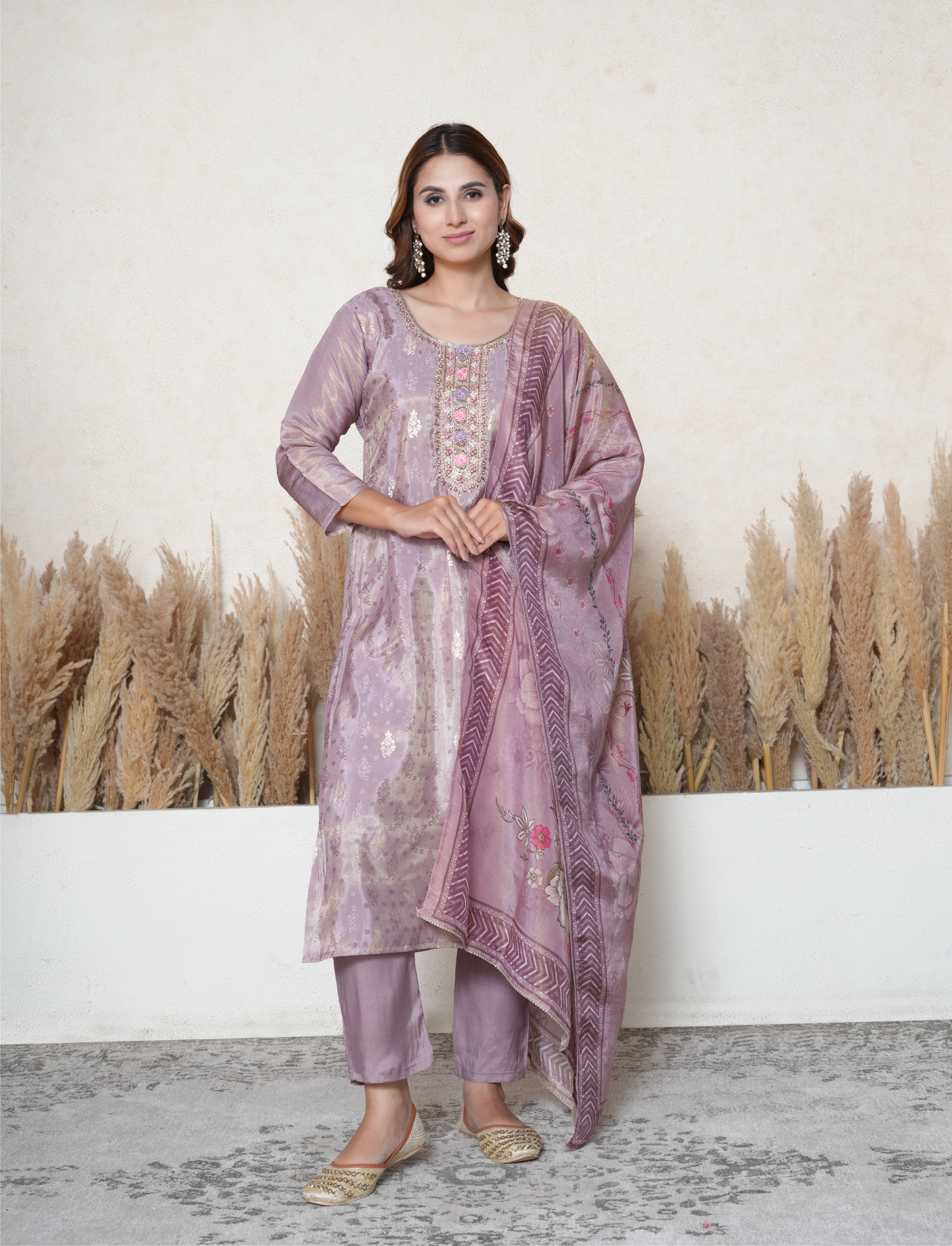 Elevate your style with this tissue shimmer straight kurta paired with silk blend pants and a printed tissue shimmer dupatta. This exquisite ensemble combines timeless elegance with modern sophistication. The kurta showcases intricate embroidery featuring French knot, cutdana, and pearl work. Completing the look is a stunning printed dupatta that blends traditional prints with contemporary flair.