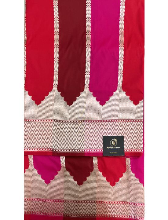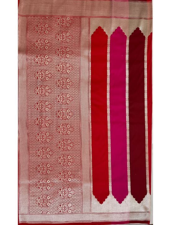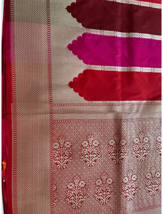 Raangkaat is exquisite and time intensive technique which can be identified by sharp change in base colours of the fabric. These three colours are handwoven together along with silver and golden zari in a vertical leaf border layout is a work of art in itself.