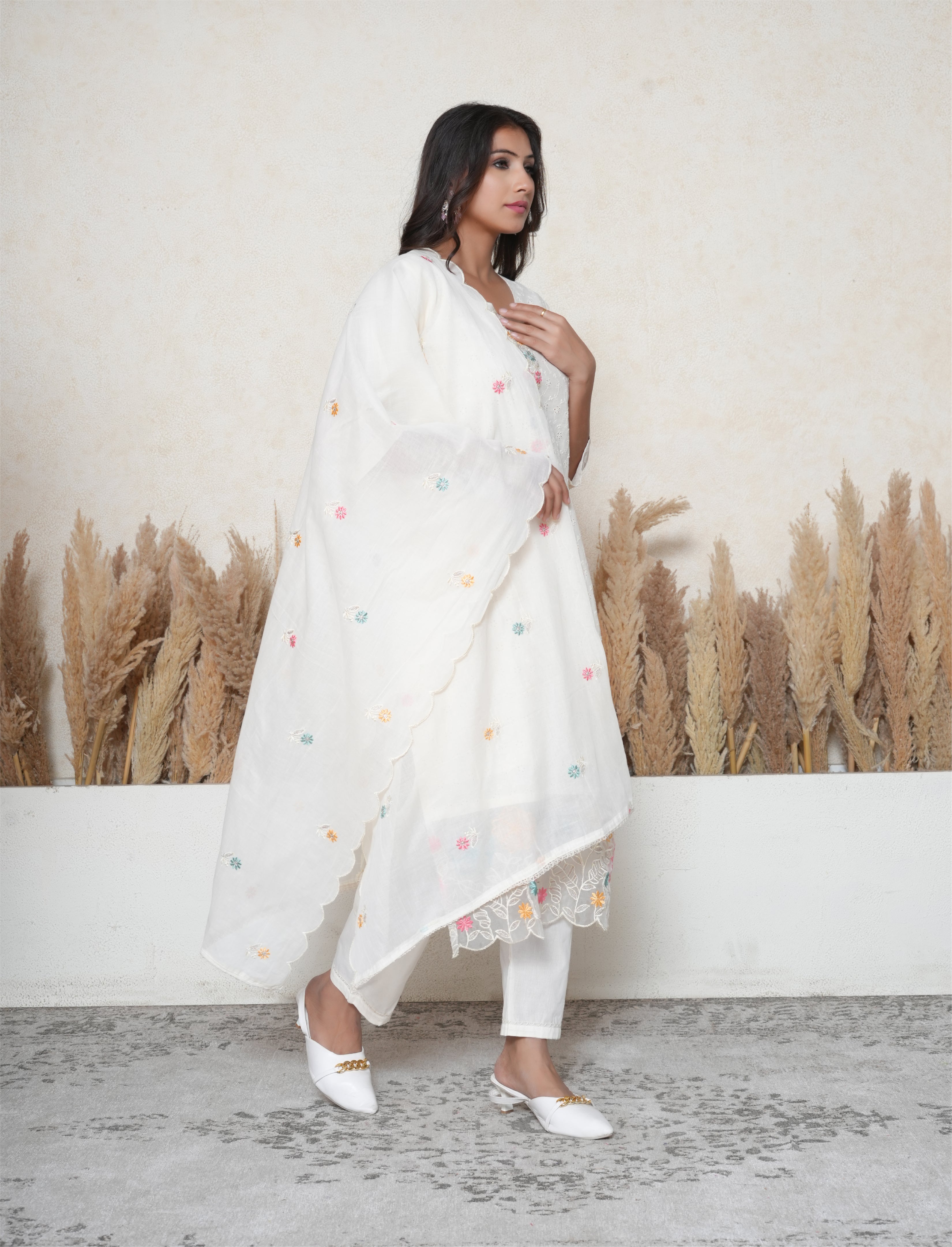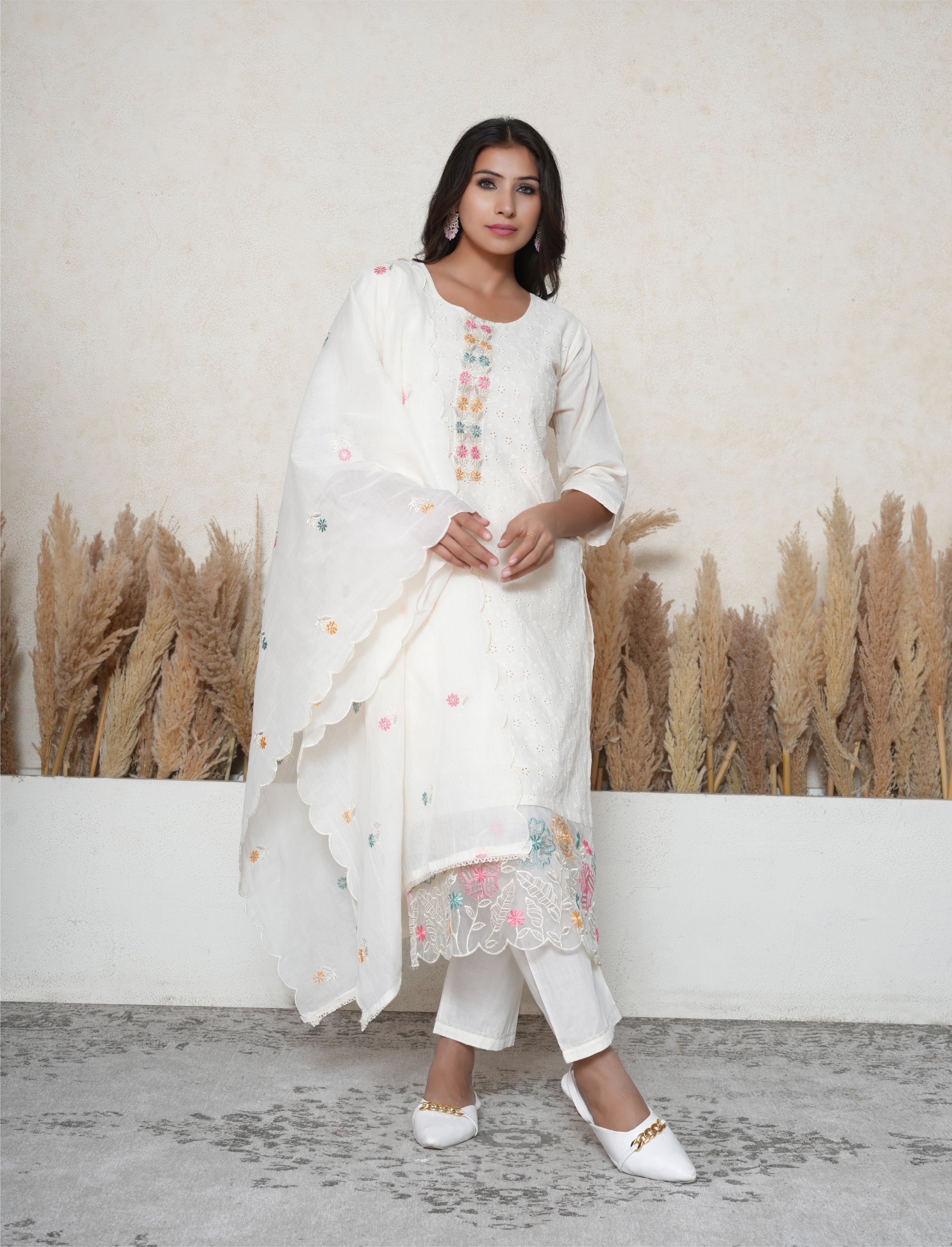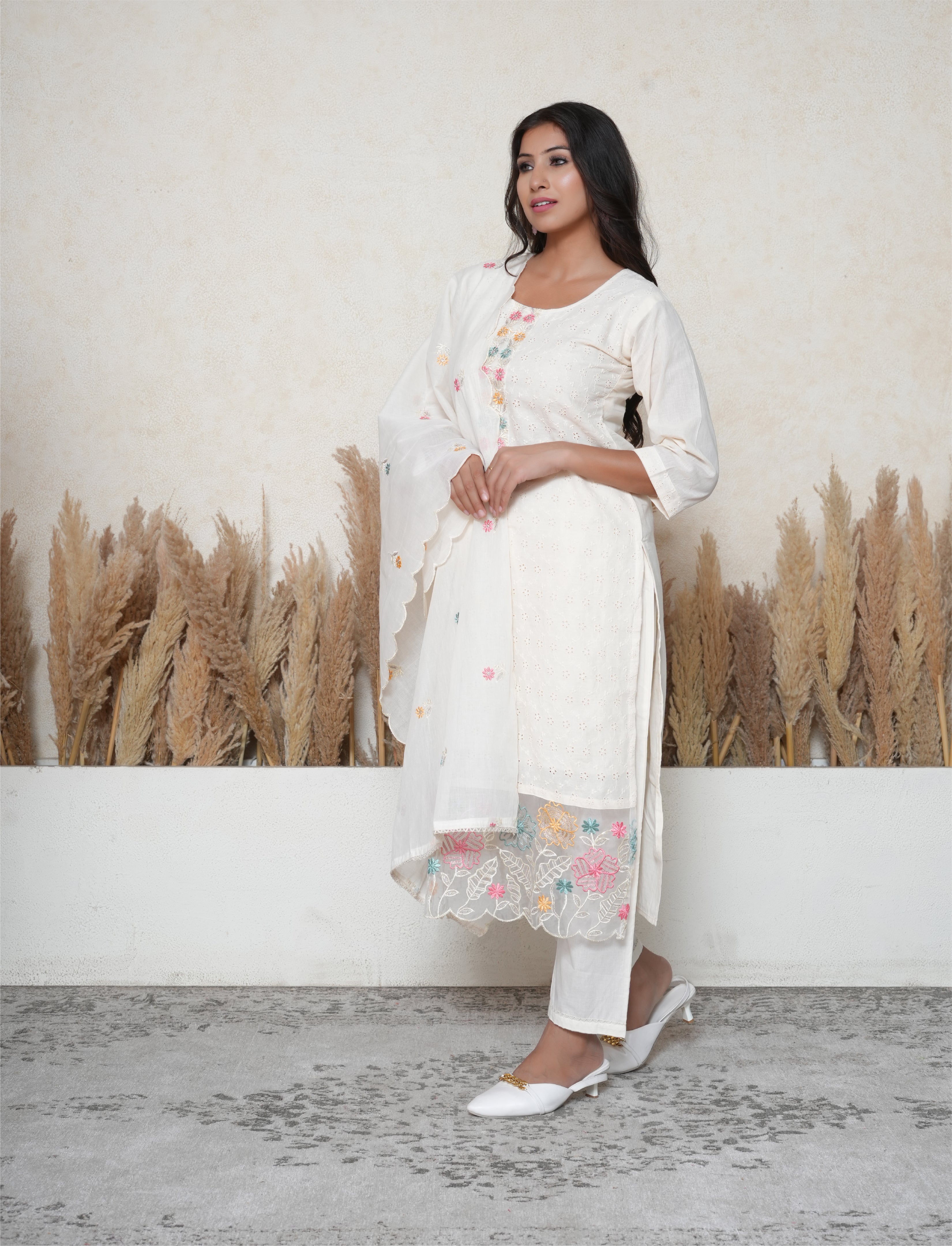 Delicate, airy, and effortlessly graceful — this Off-White Cotton Suit Set is a celebration of traditional craftsmanship and subtle elegance. The cotton kurta features a round neckline and is exquisitely embroidered with multicolored thread and zari, creating a rich, artisanal texture. At the heart of the design is its intricate floral-pattern cutwork chikankari, beautifully placed across the kurta for a light yet detailed look. A lace net border with floral thread embroidery and a scalloped hem add softness and finesse to the silhouette. The look is completed with plain off-white cotton pants and a matching cotton dupatta adorned with small multicolor embroidered floral motifs, offering a perfect blend of tradition and light elegance.