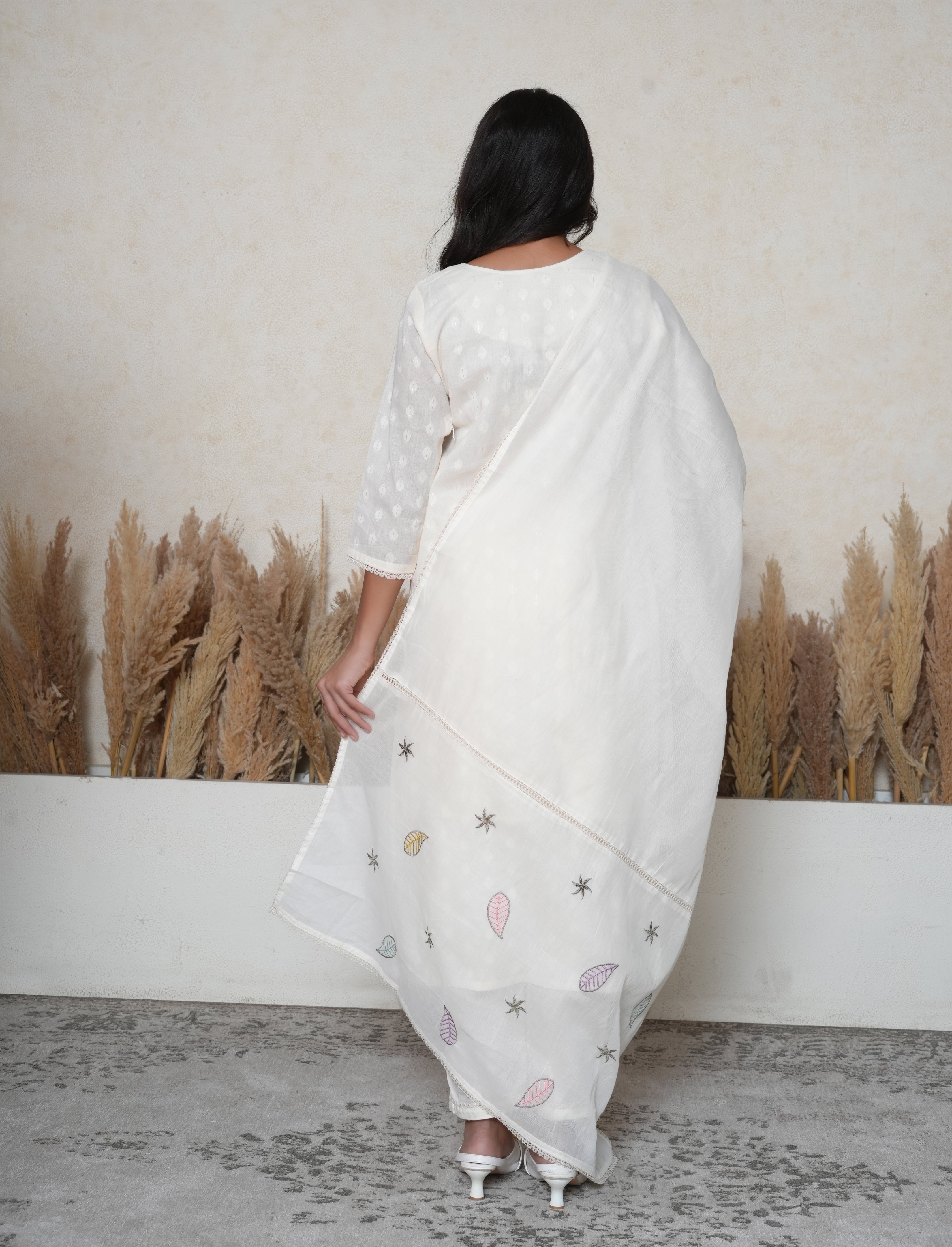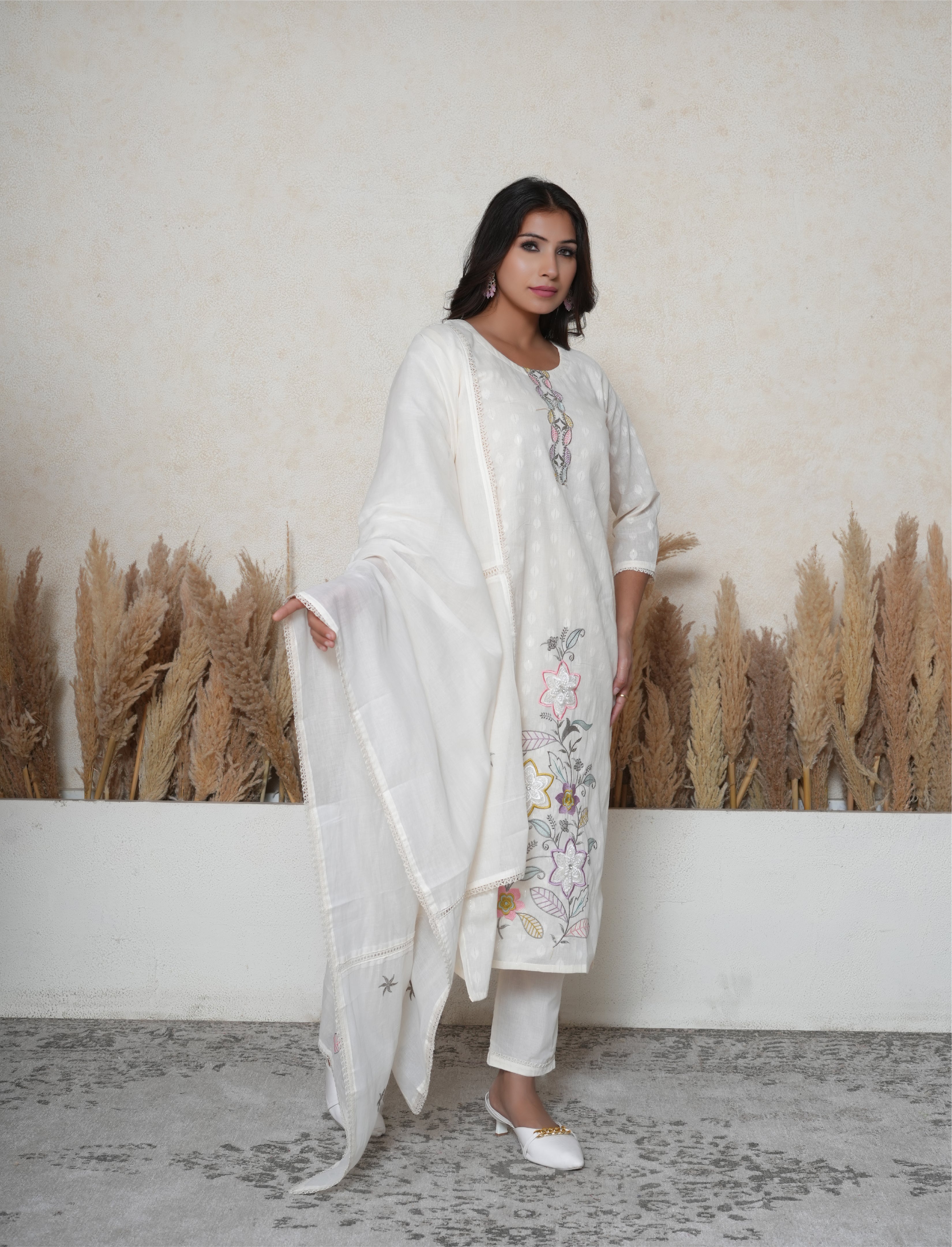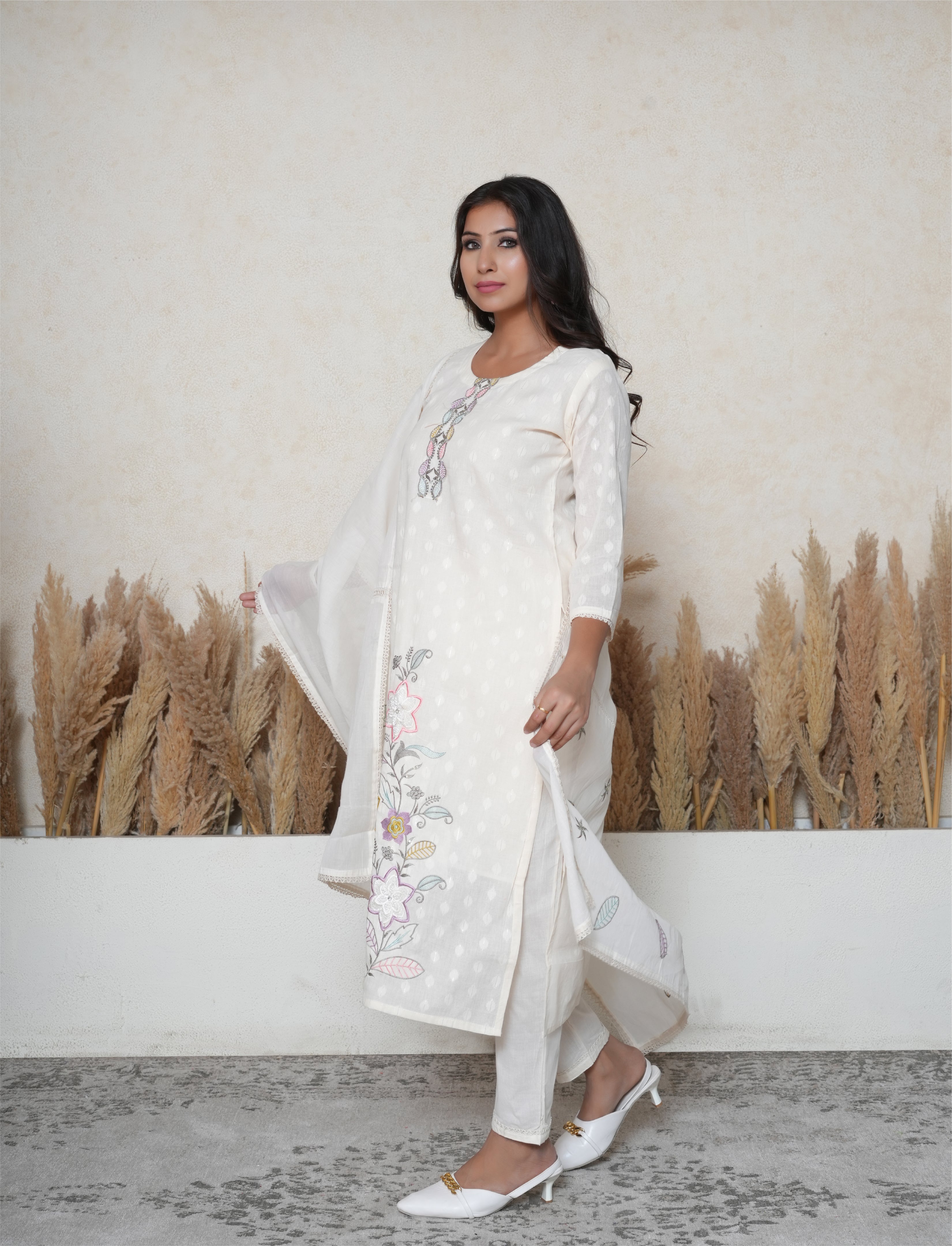 Bring timeless elegance to your wardrobe with this Off-White Khadi Cotton Suit Set, crafted from breathable, textured khadi cotton that blends traditional charm with modern simplicity. The khadi cotton kurta features a classic round neckline, beautifully adorned with colored thread floral embroidery, along with subtle sequins detailing that add just the right amount of shimmer. Delicate lace detailing along the sleeves enhances the silhouette with a soft, feminine touch. The look is completed with matching cotton pants and a cotton dupatta with an embroidered hemline, finished with a lace-trimmed border for an effortlessly graceful drape. Perfect for summer occasions, casual gatherings, or elegant daytime outings, this suit is a celebration of fine craftsmanship and refined style.
