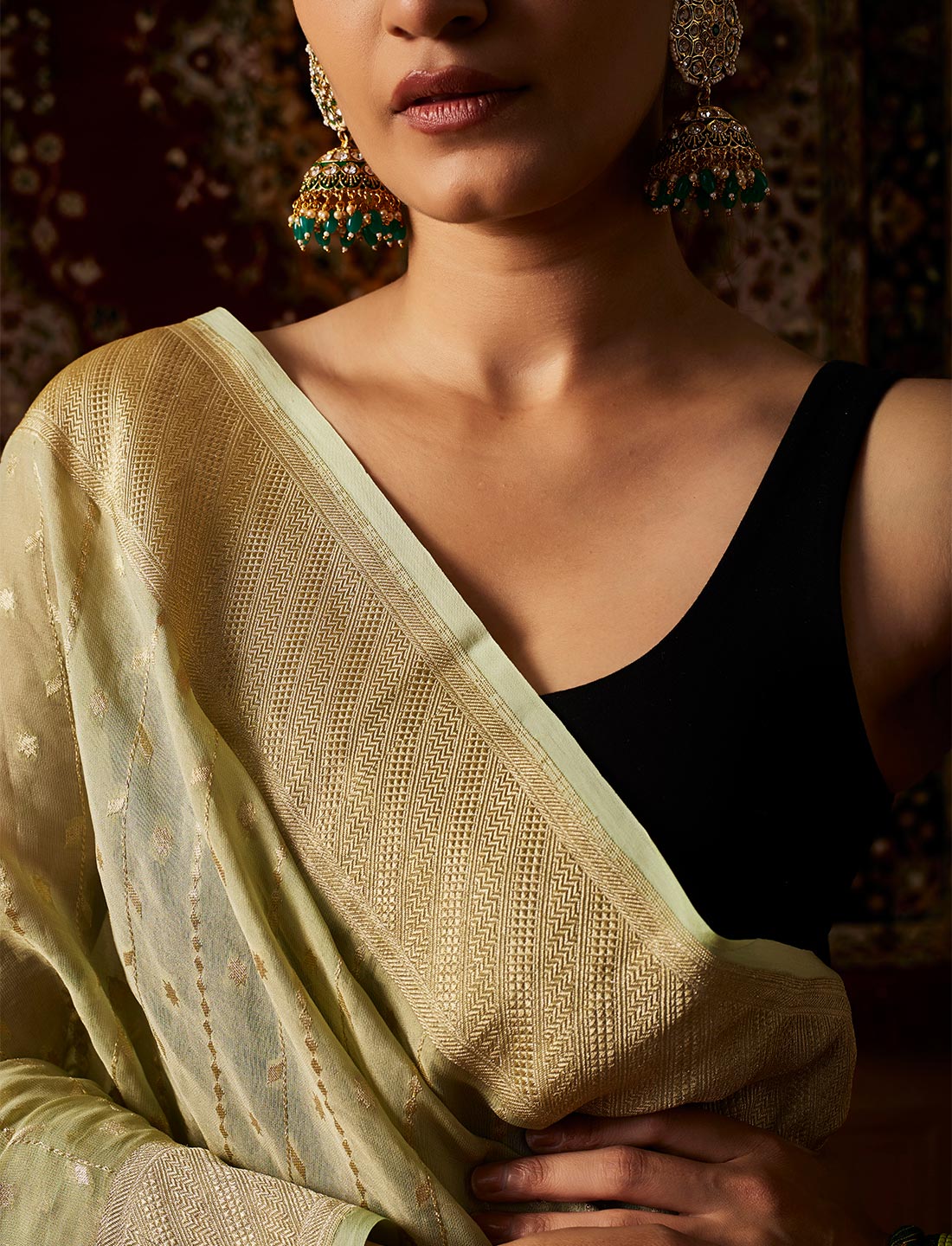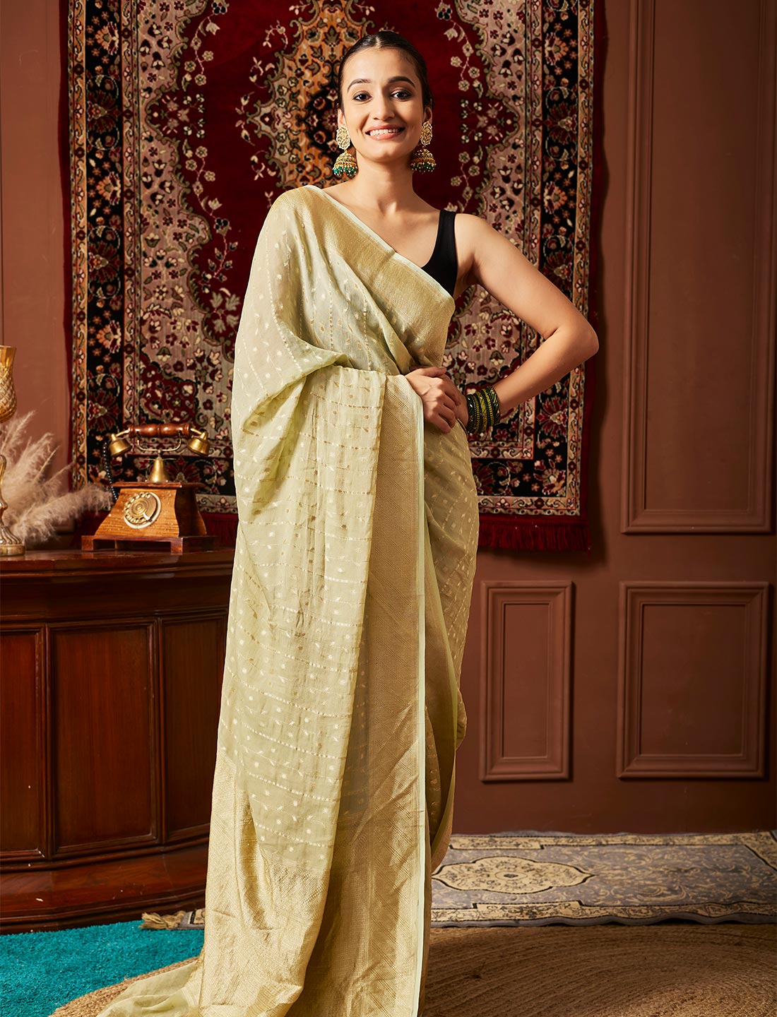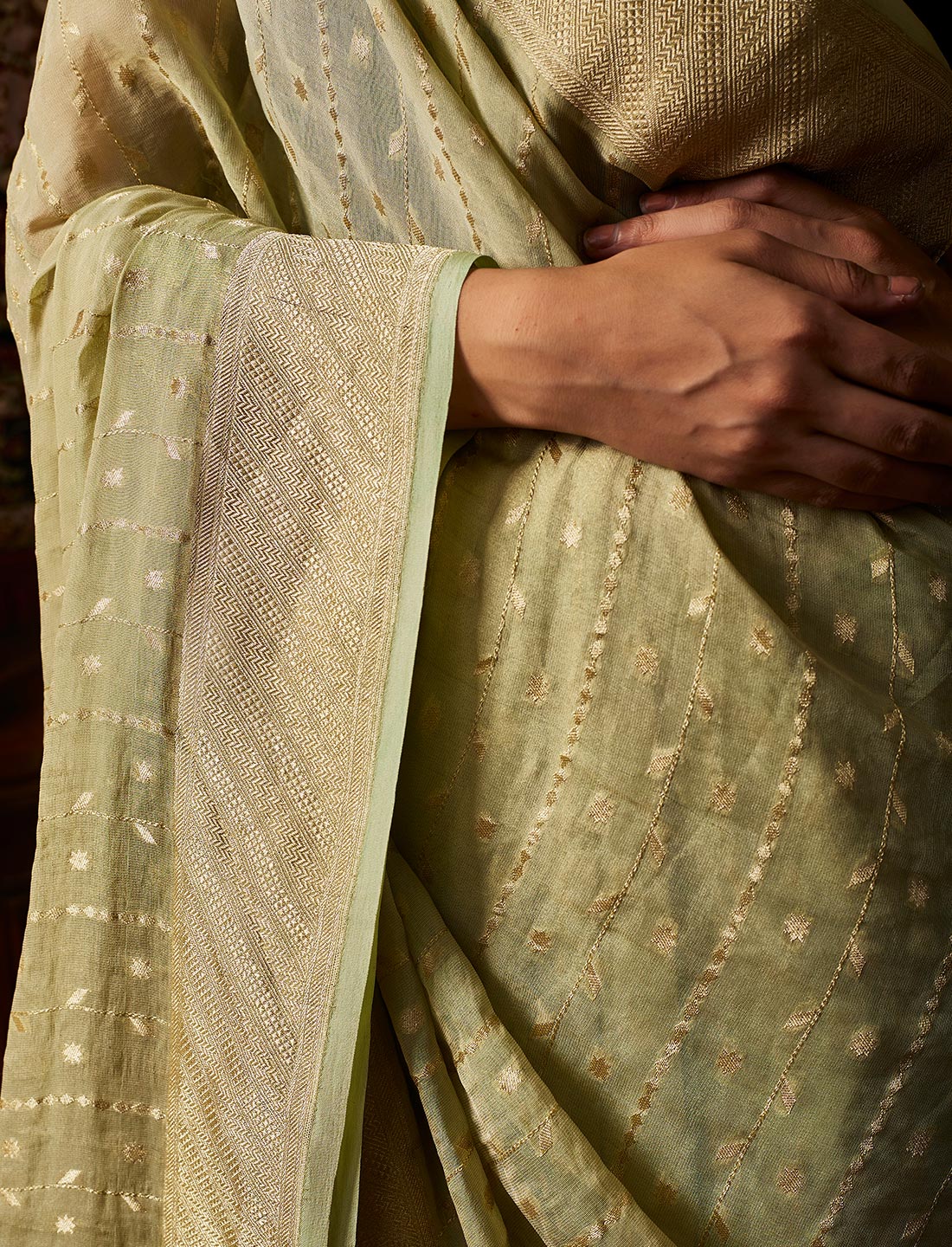 Pure Handloom Khaddi Tissue Silk saree Tissue silk is fine sheer silk well known for its uniform structure, strength and flexibility. This fabric is interlaced with gold and silk threads. Tissue silk fabric is created by by metallic threads are woven in one direction while the coloured silk threads are woven in opposite direction to give it a enthralling effect and a brilliance sheen to the fabric._x000B_Hand made saree with work all over. Fabric :- Pure Khaddi Tissue silk Length:- 6.30m (Blouse piece included.