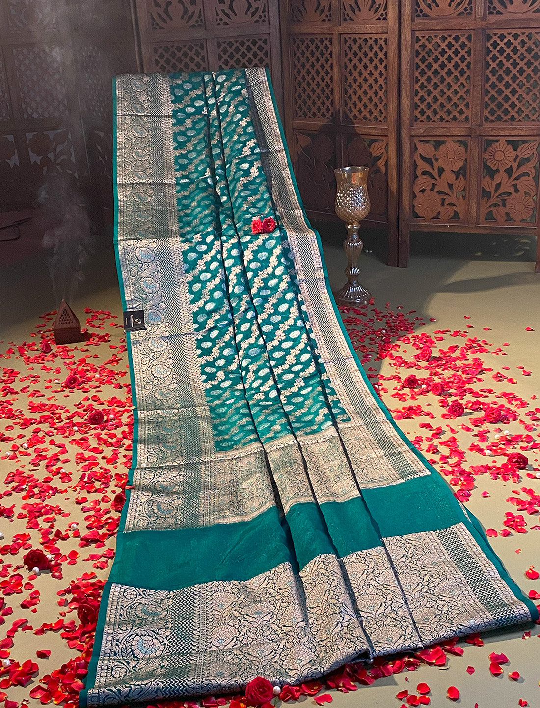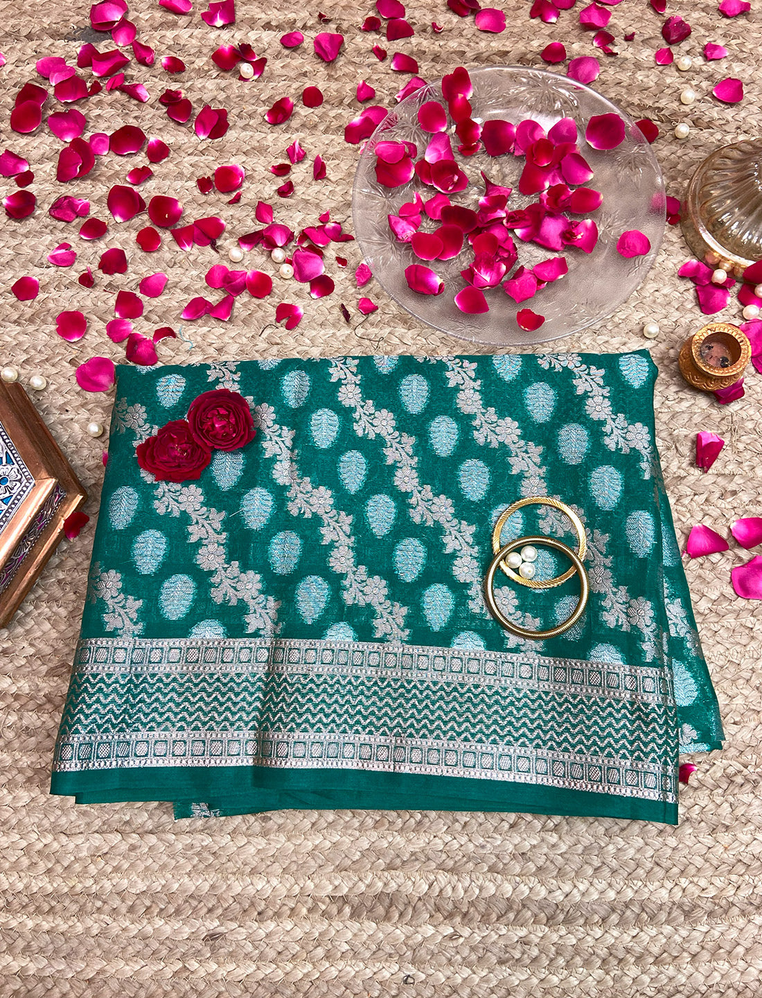 Persian Green crepe silk saree with floral leharia pattern with small motifs all over, comes with heavy blouse and celebrated border.