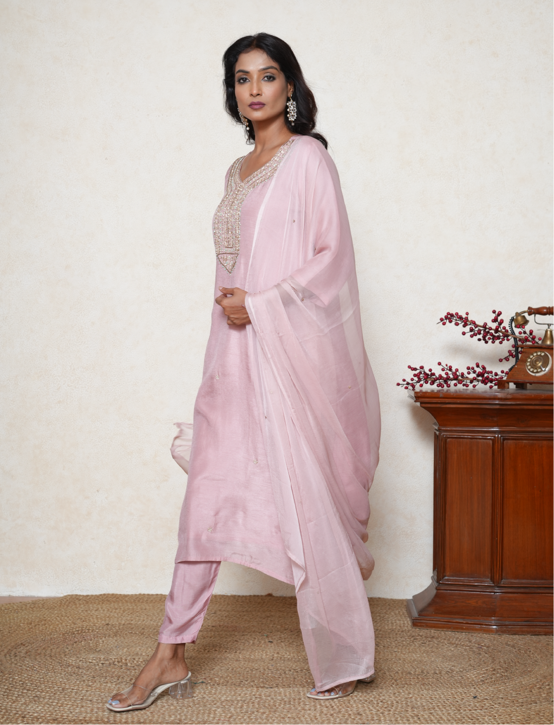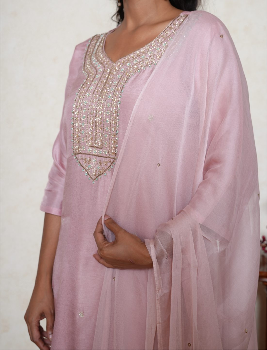 Indulge in luxurious elegance with this Tissue Shimmer Kurta, designed to make a statement. Featuring a stunning paan leaf-inspired neckline, it is meticulously embroidered with intricate Aari, Cutdana, and Pearl work. The fusion of traditional craftsmanship with shimmering fabric lends an elevated, eye-catching look—perfect for festive occasions or special celebrations.
