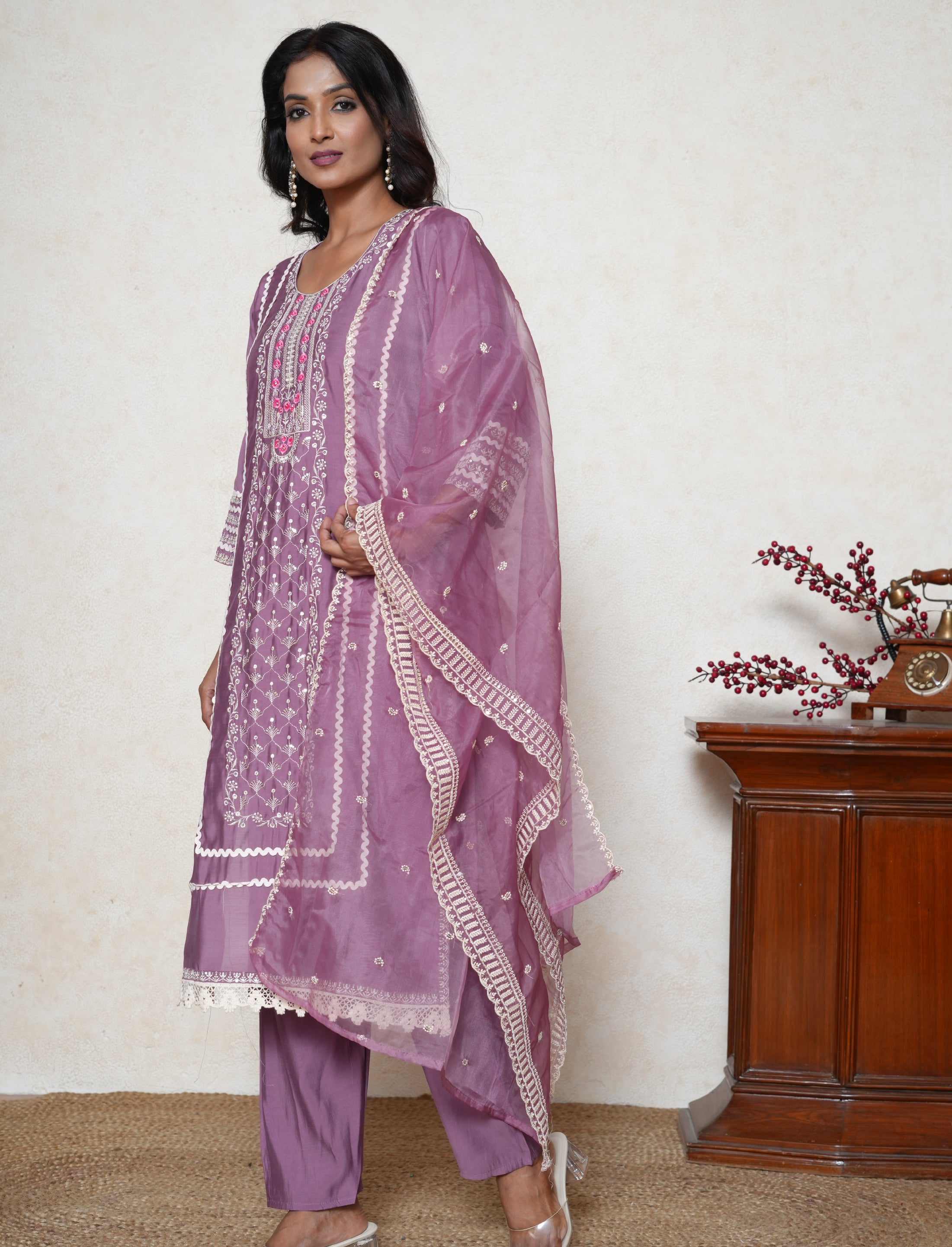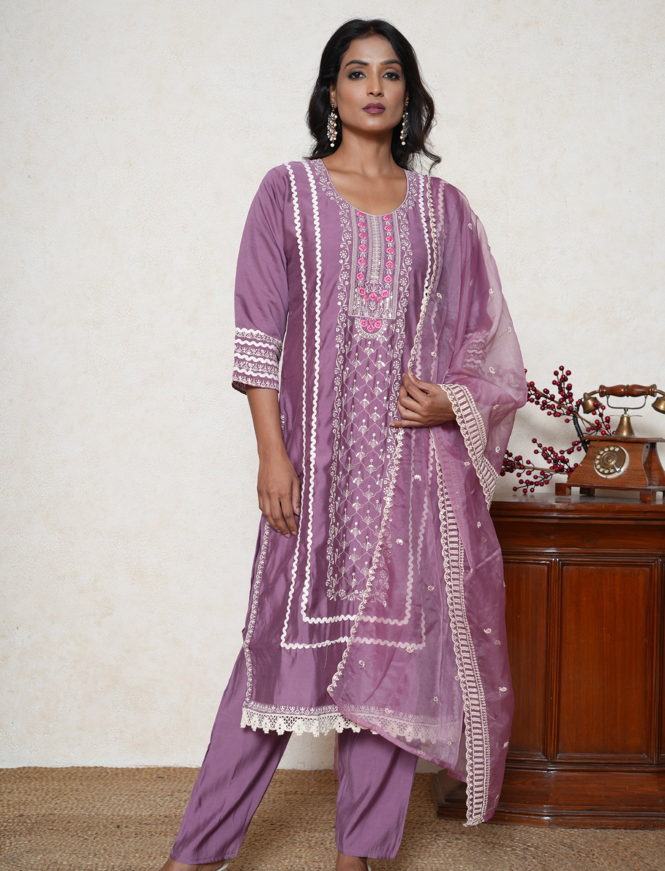 This plum straight-cut silk blend kurta set features an intricately embroidered neckline with delicate lace detailing along the kurta and sleeves. The lacework adds a touch of sophistication. Paired with silk blend pants and a scalloped hem organza dupatta, this ensemble exudes feminine charm.