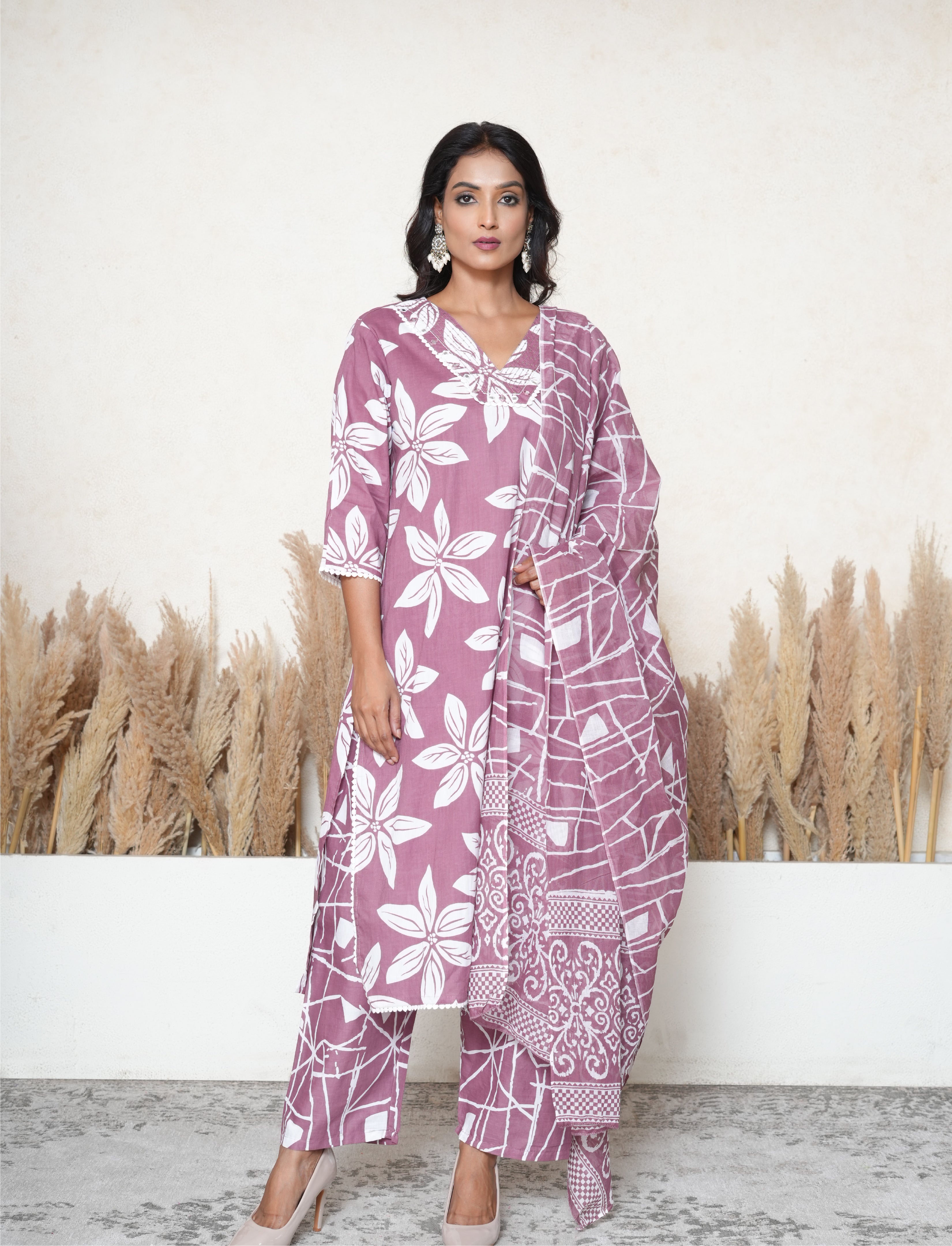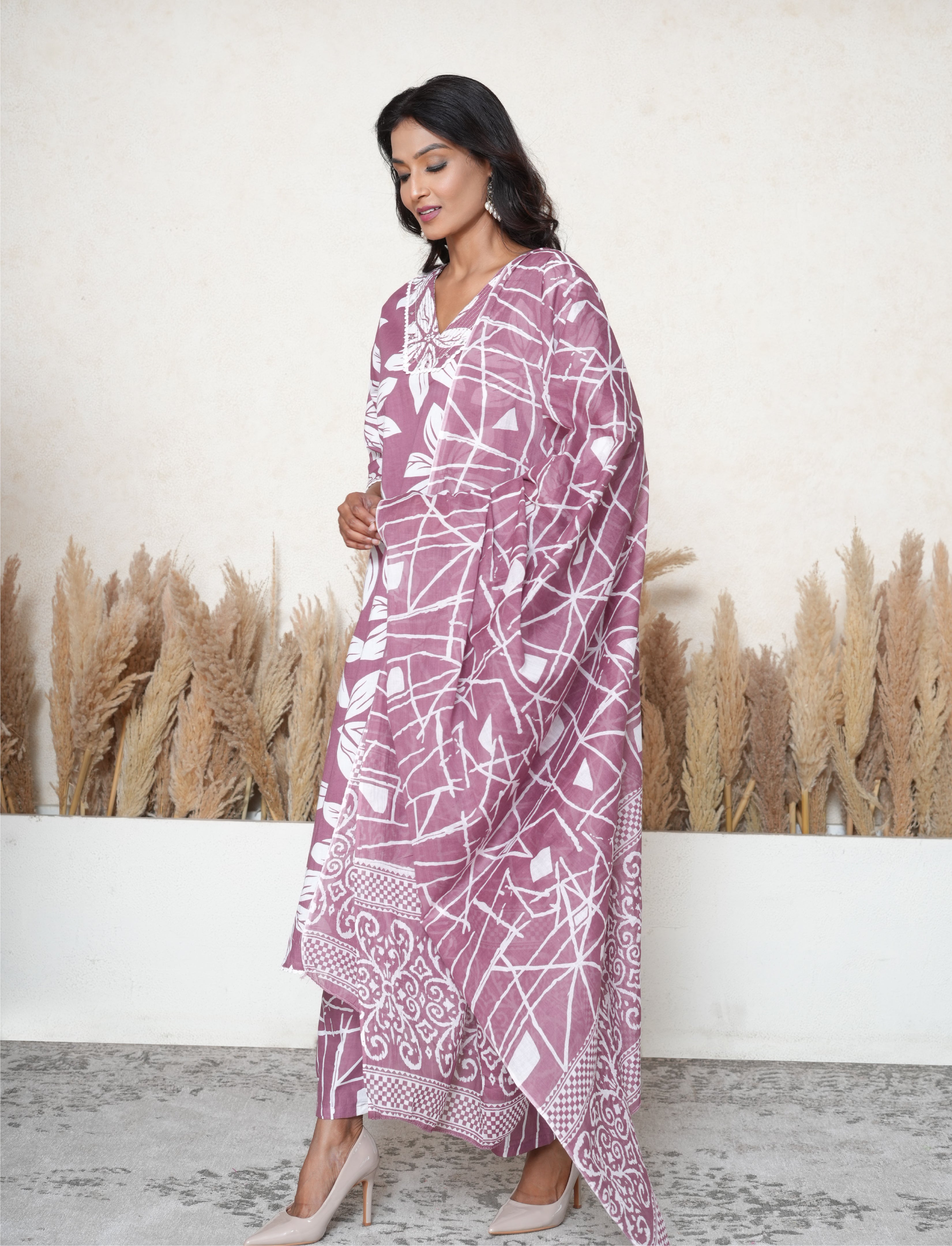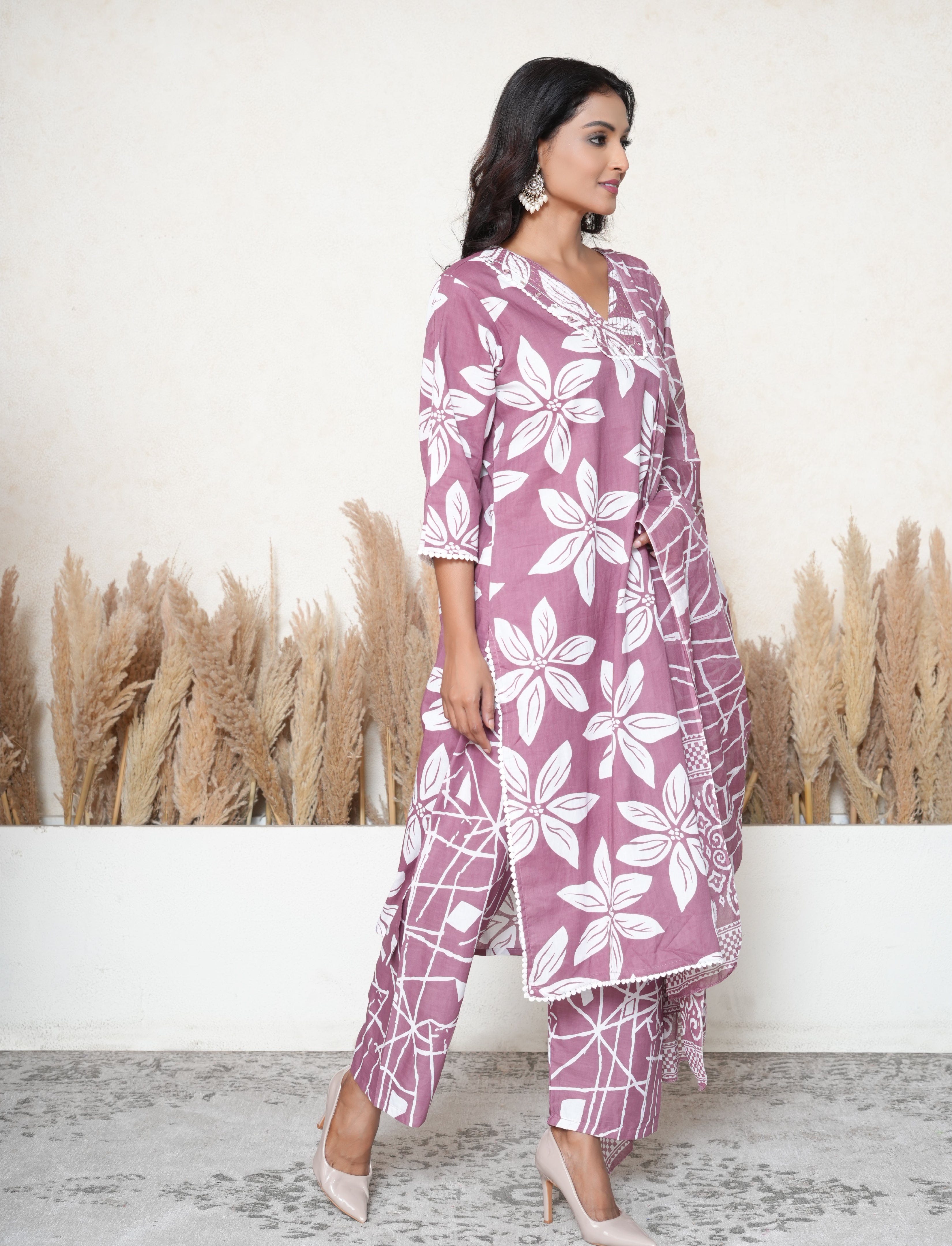 Indulge in refined beauty with our cotton floral print V-neck Antique Fuschia suit set with dupatta. This cotton kurta features a V-neckline adorned with intricate sequins detailing and a delicate lace border. Lace detailing along the hem of the sleeves and kurta adds a touch of grace to the outfit. Completing the ensemble are abstract printed elasticated cotton pants and a matching cotton dupatta, ensuring both comfort and style. This suit allows you to showcase your grace and charm effortlessly.