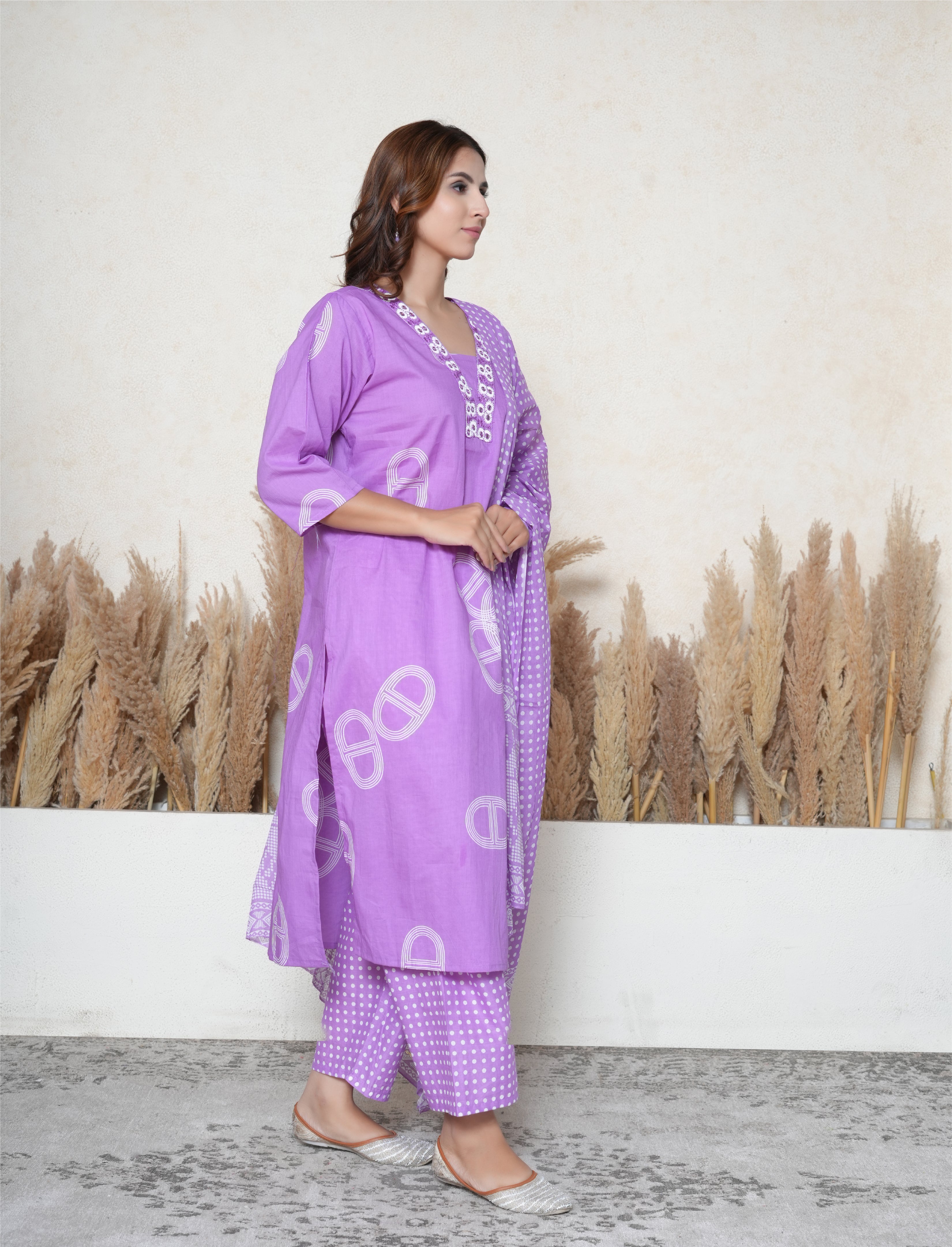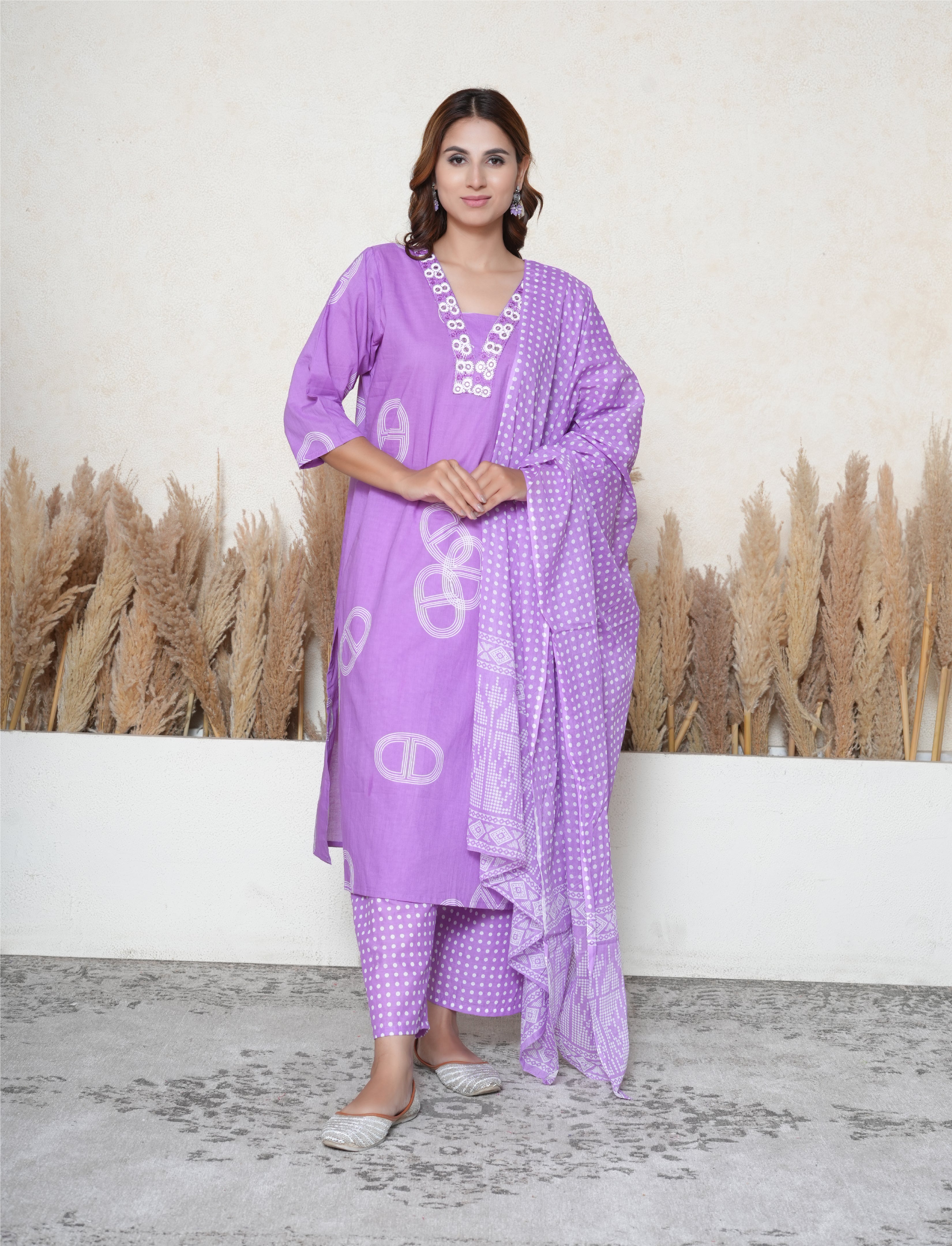 Discover the essence of casual elegance with our deep Lilac cotton printed kurta set. Crafted for comfort and style, this ensemble exudes sophistication effortlessly. The straight kurta features a V-Neckline for timeless charm with intricate embroidery and mirror detailing. Paired with Cotton Polka dot printed pants and printed dupatta adds a touch of grace and completes the look with finesse.