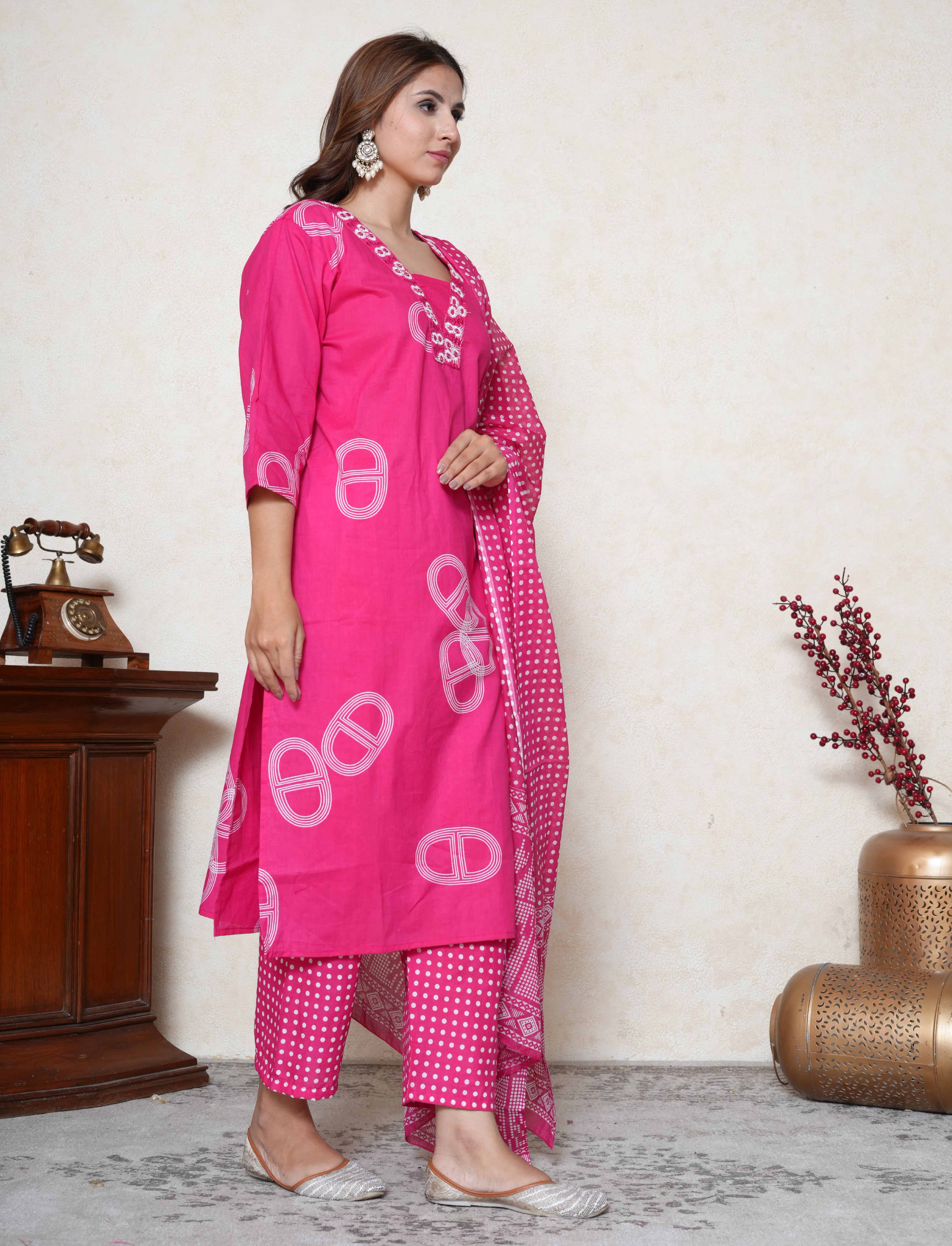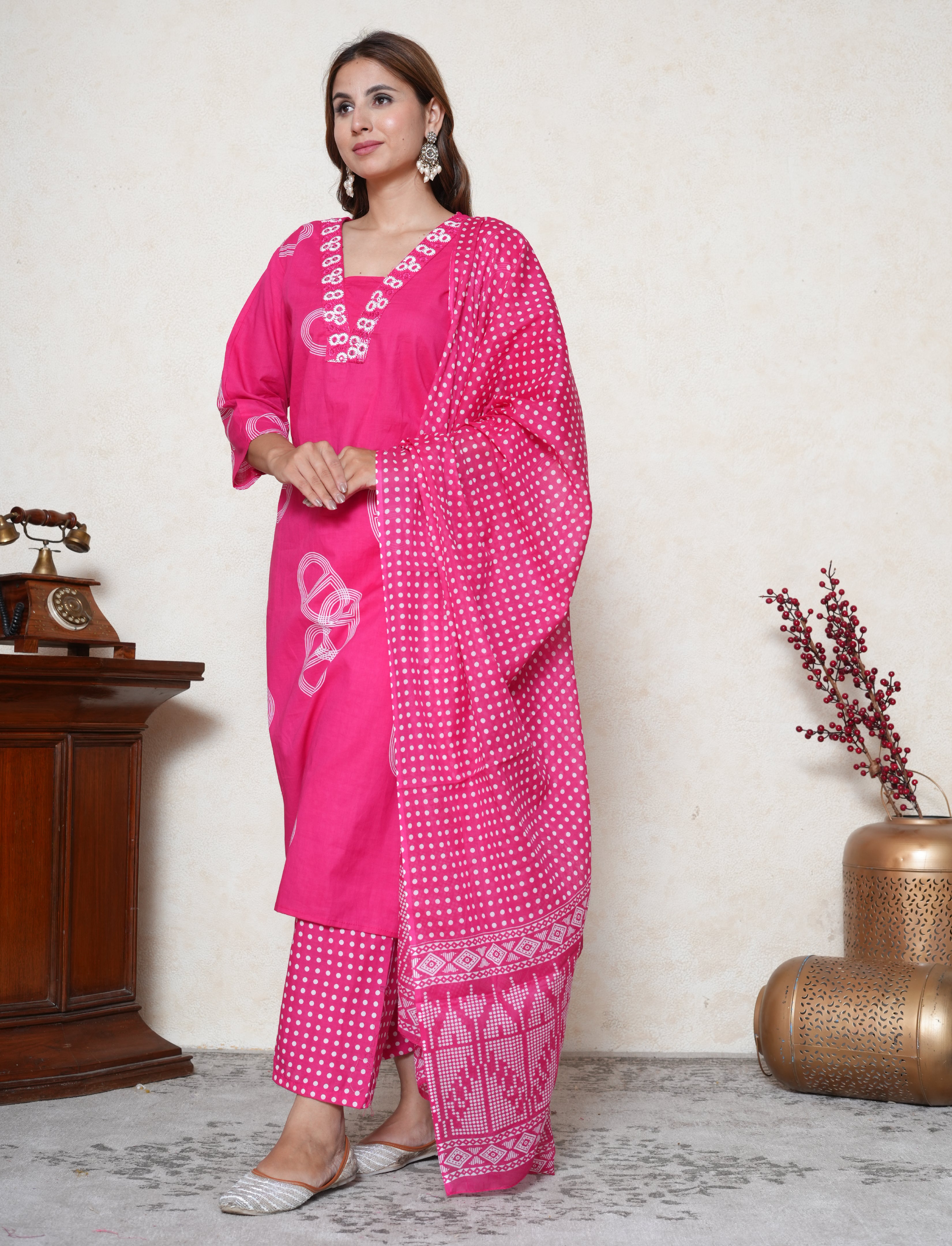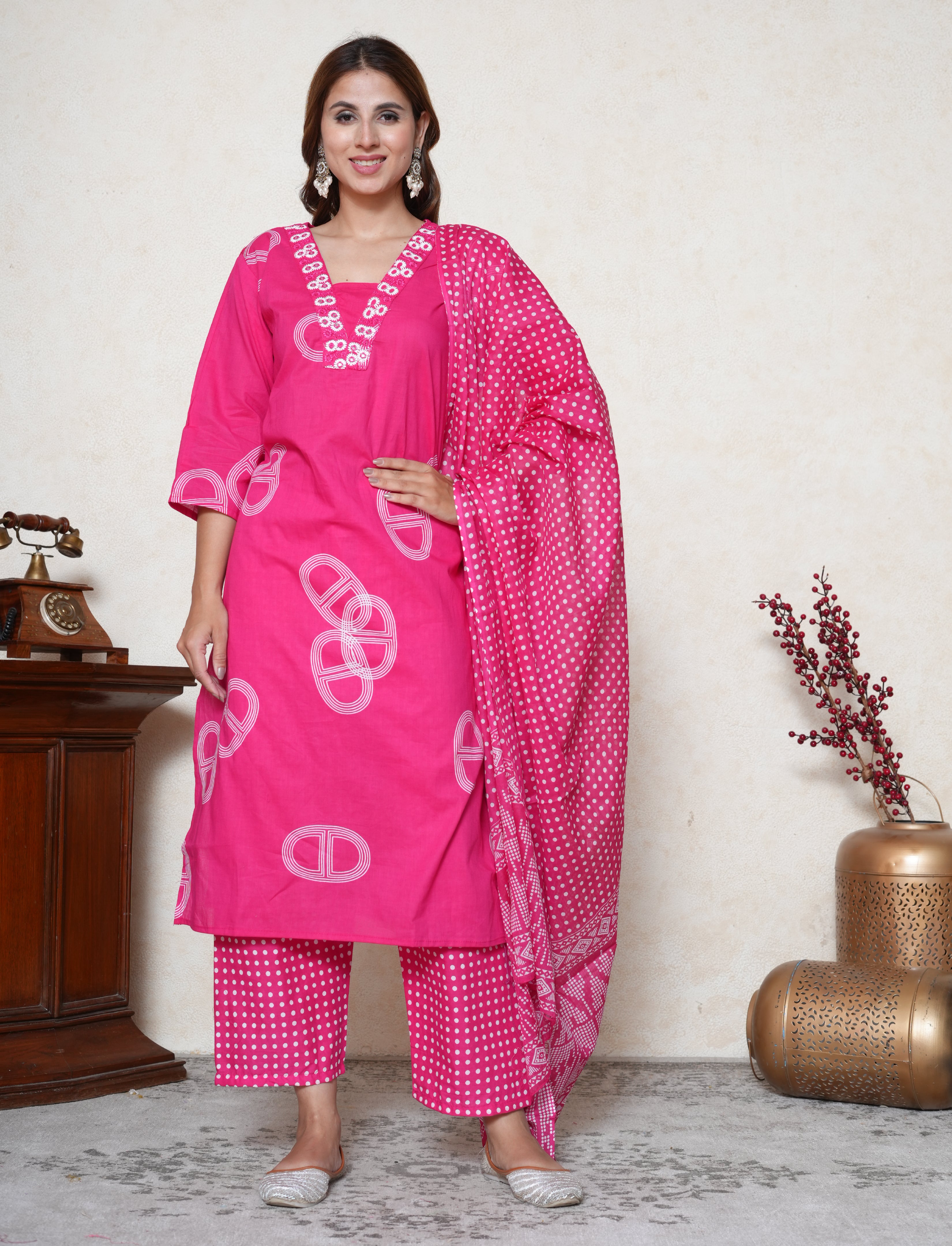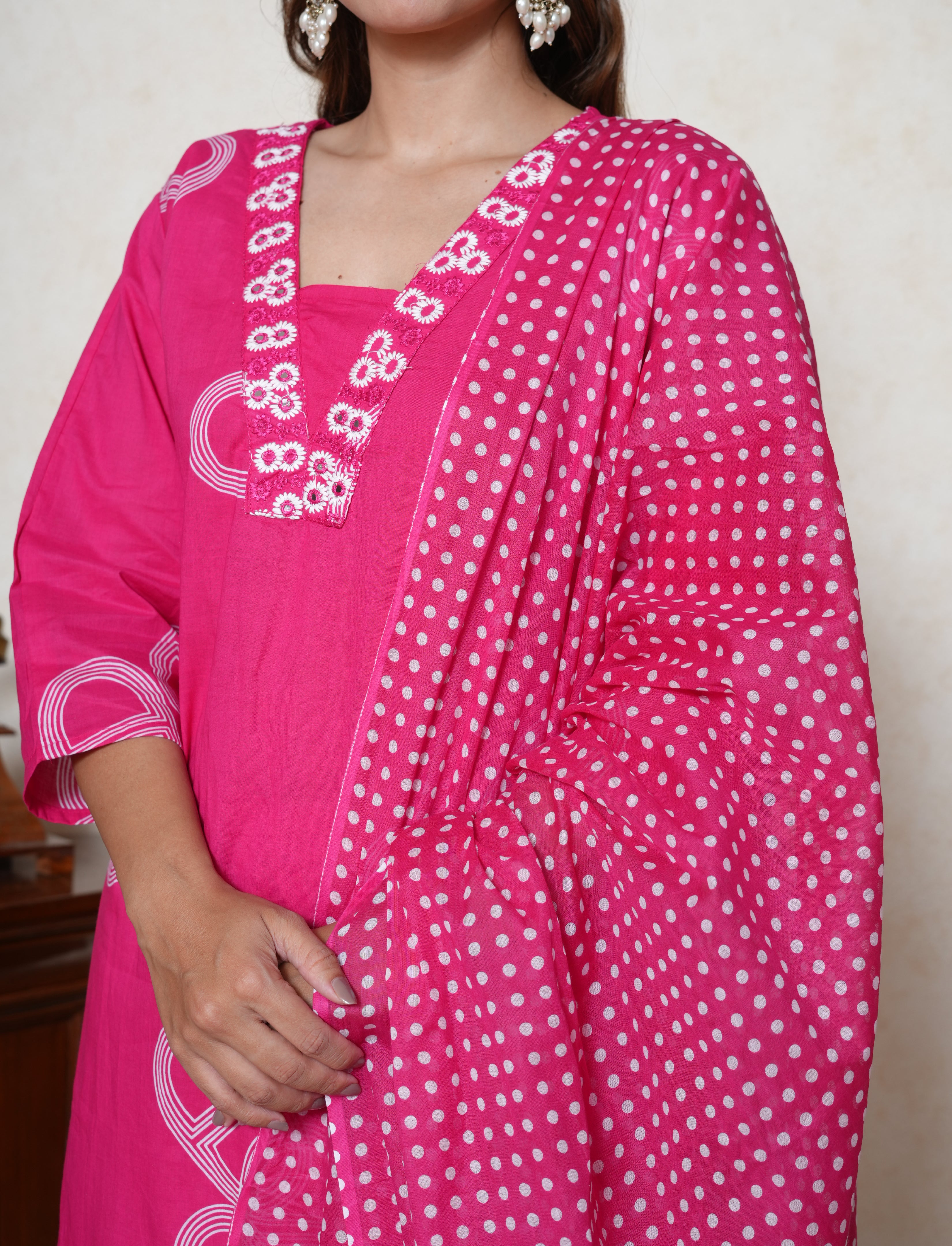 Discover the essence of casual elegance with our hot pink cotton printed kurta set. Crafted for both comfort and style, this ensemble exudes effortless sophistication. The straight cotton kurta features a flattering V-neckline adorned with intricate embroidery and mirror detailing for timeless charm. Paired with cotton polka dot printed pants and a printed cotton dupatta, it adds a touch of grace and completes the look with finesse.