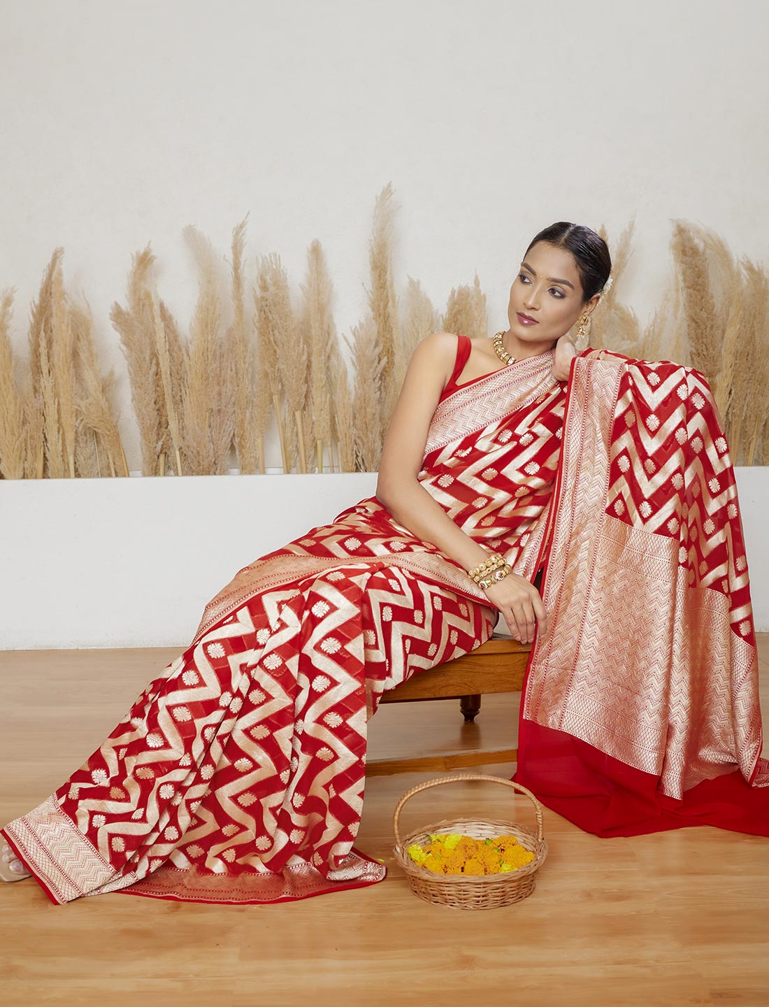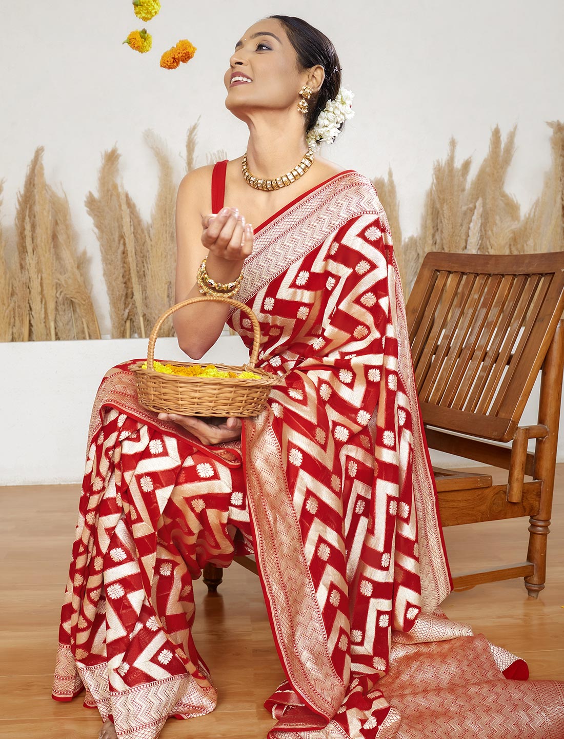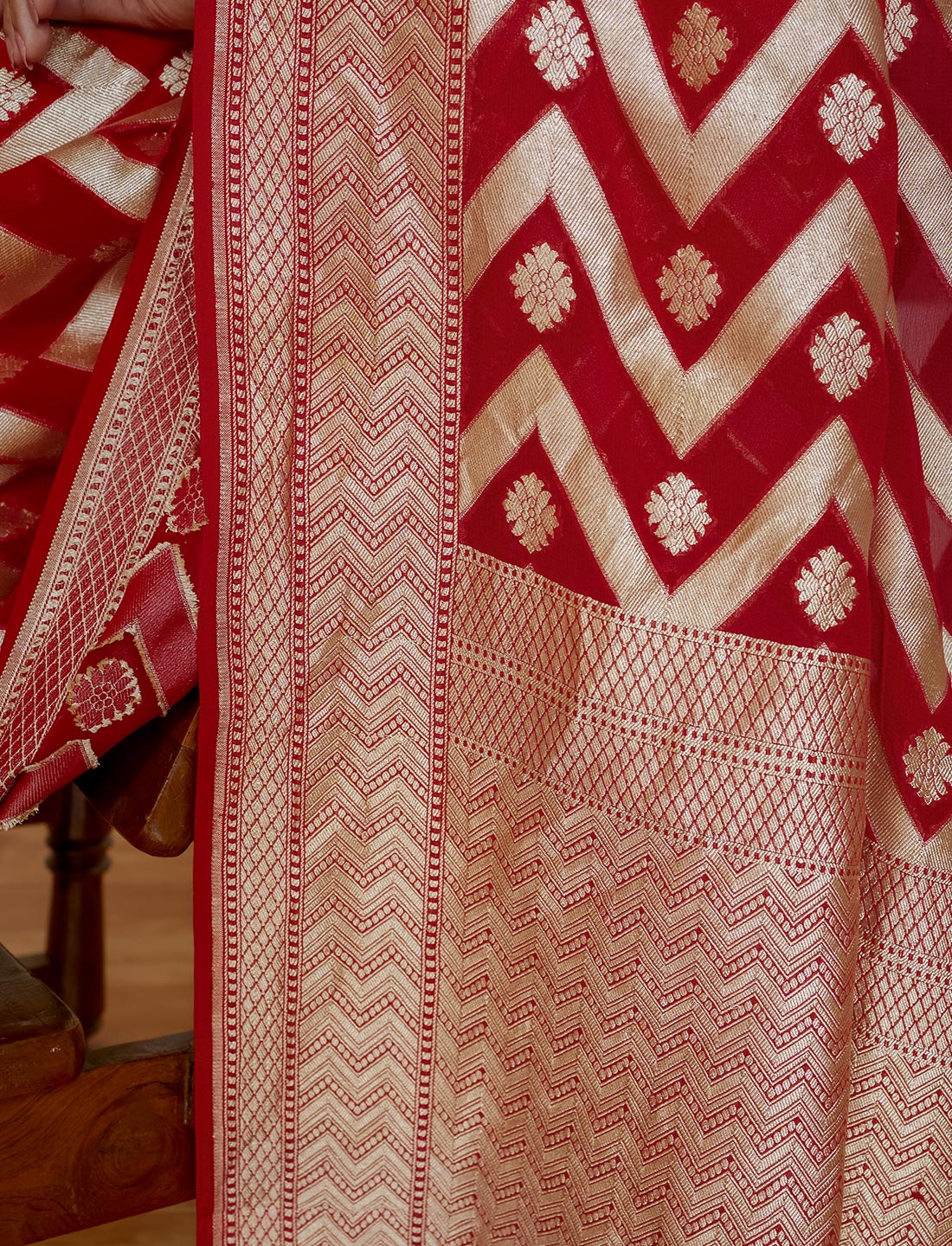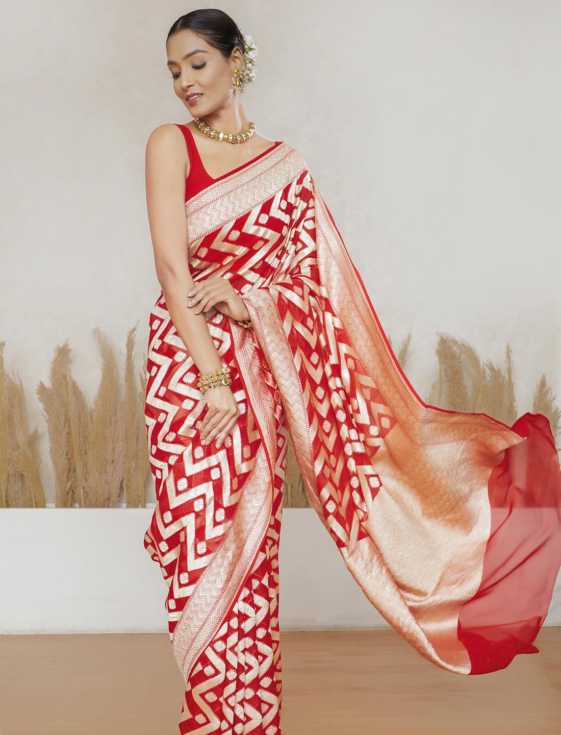 Luxurious Handloom Pure Khaddi Georgette Saree with intricate rich zari work all over drape.