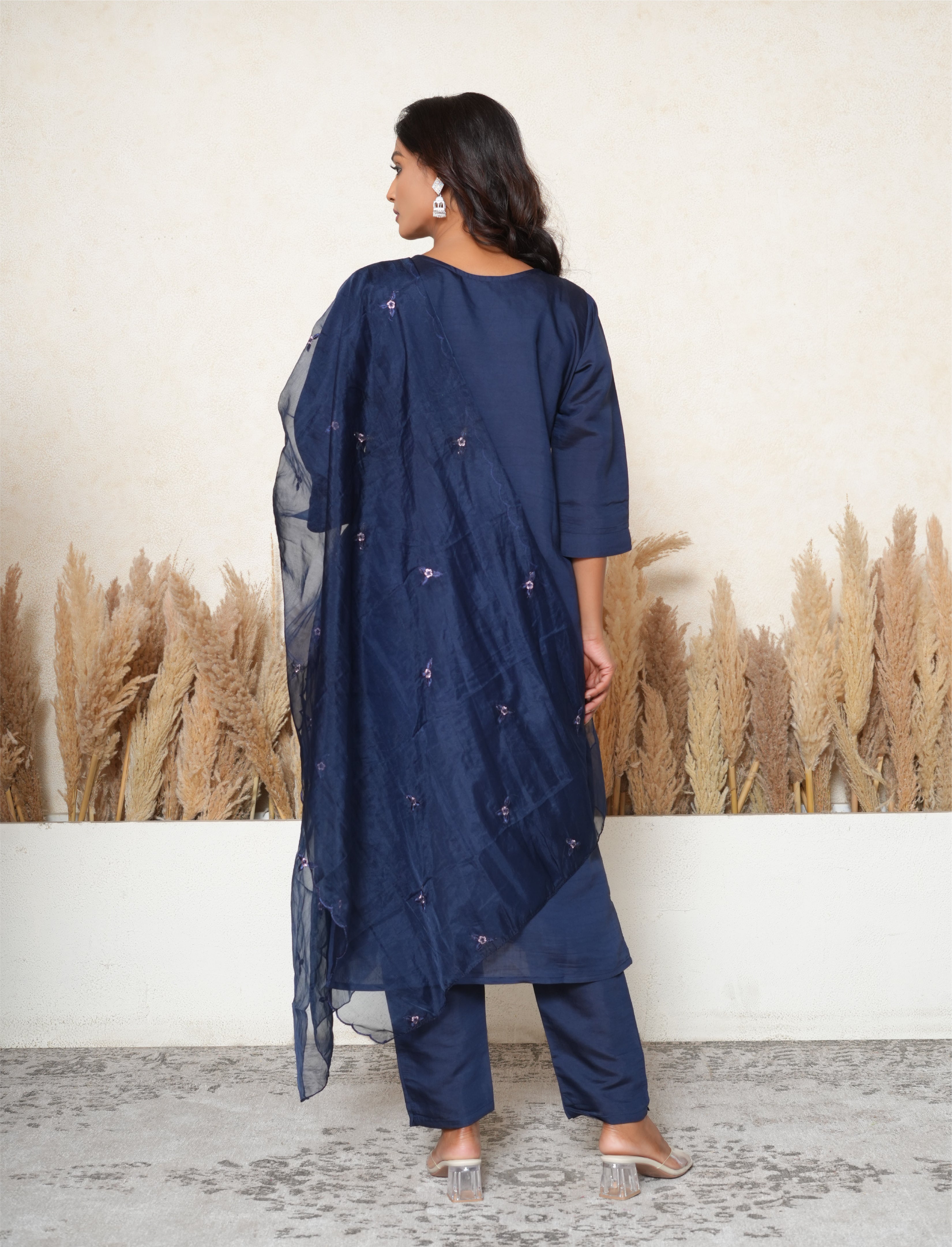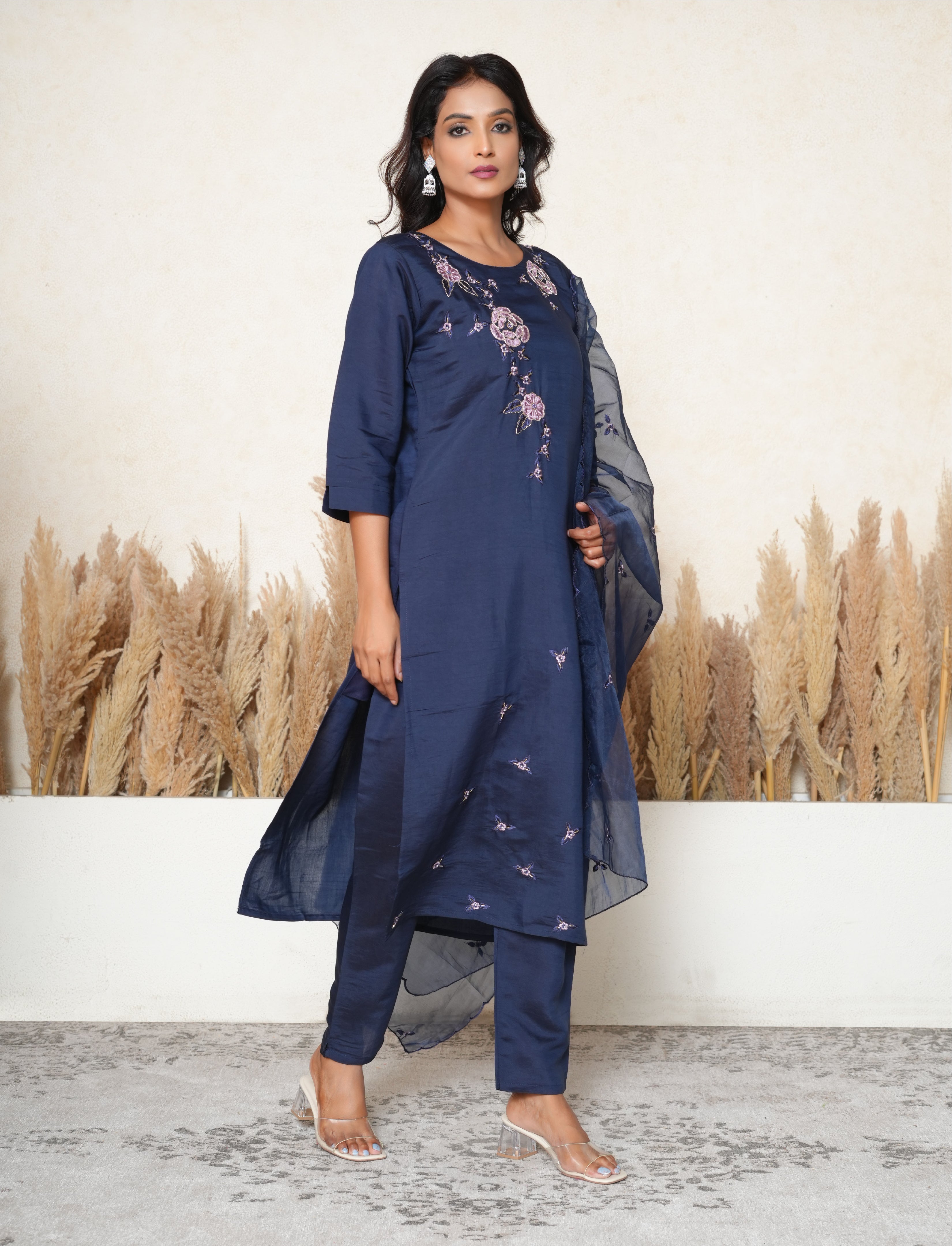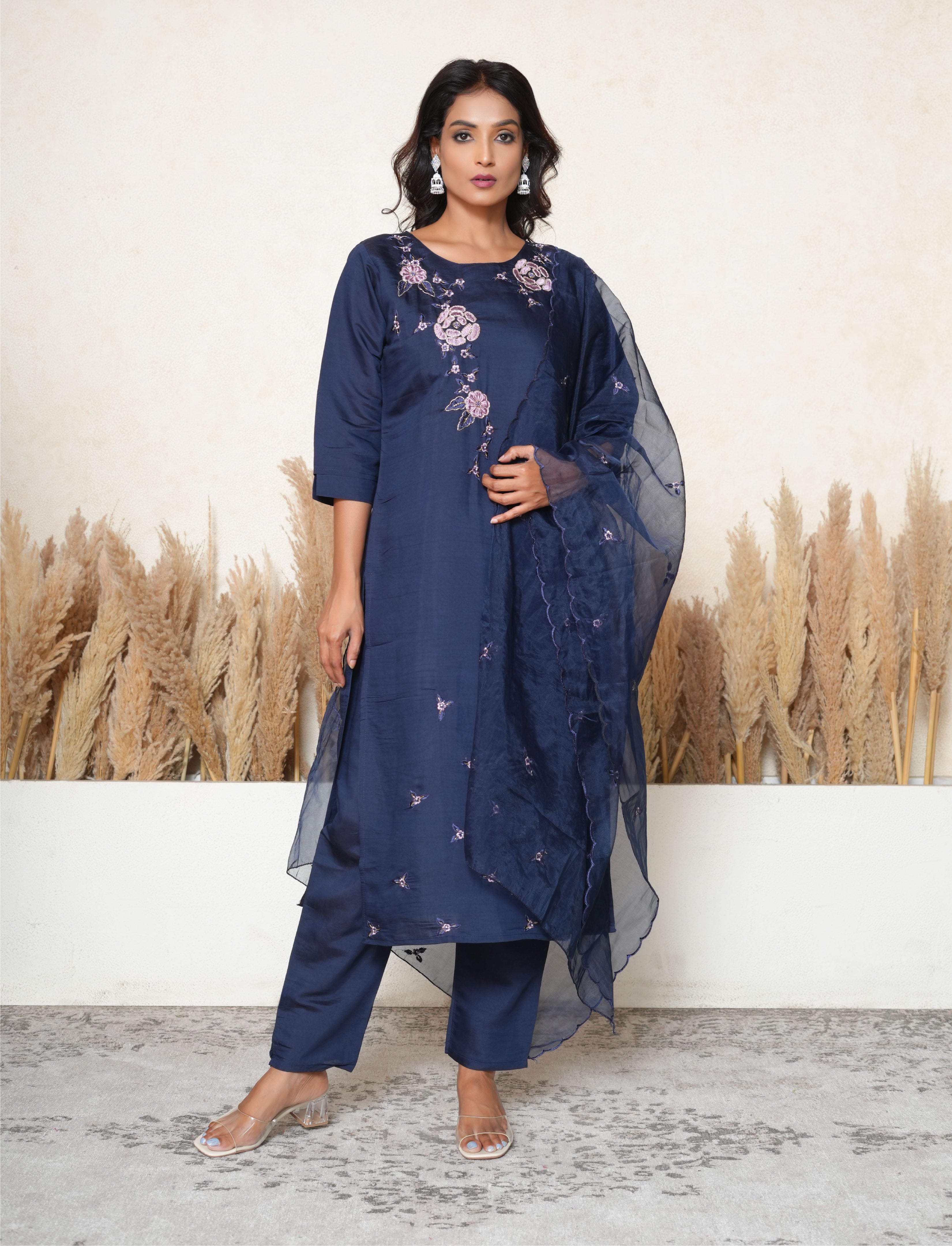 Indulge yourself in charm and elegance with this floral embroidered royal blue kurta set. This silk blend kurta features intricate floral embroidery around the neck and daaman, elegantly complemented by cutdana and pearls work. To complete the look, it comes with straight-fit silk blend pants and a semi-organza dupatta with a scalloped border and small flower booties spread across. This combination offers a stylish and culturally rich ensemble.