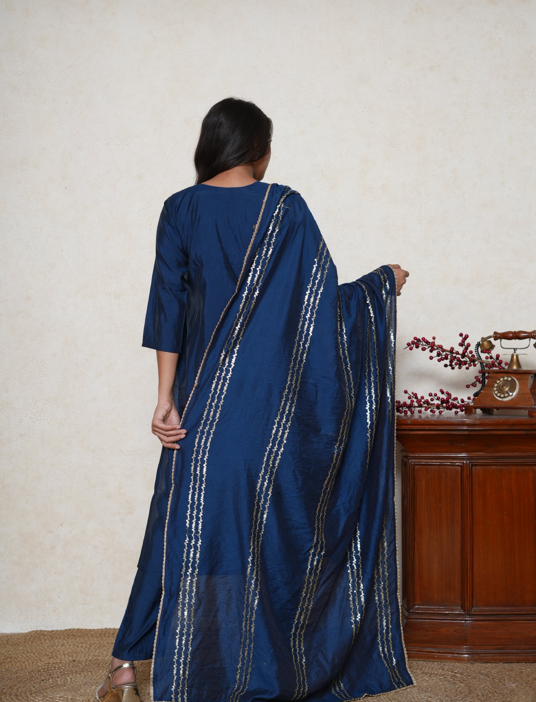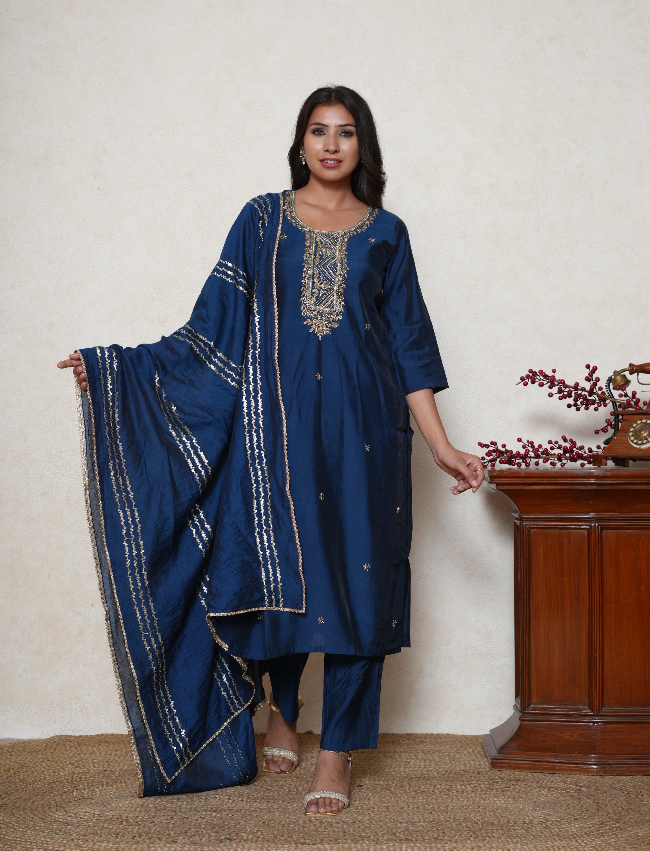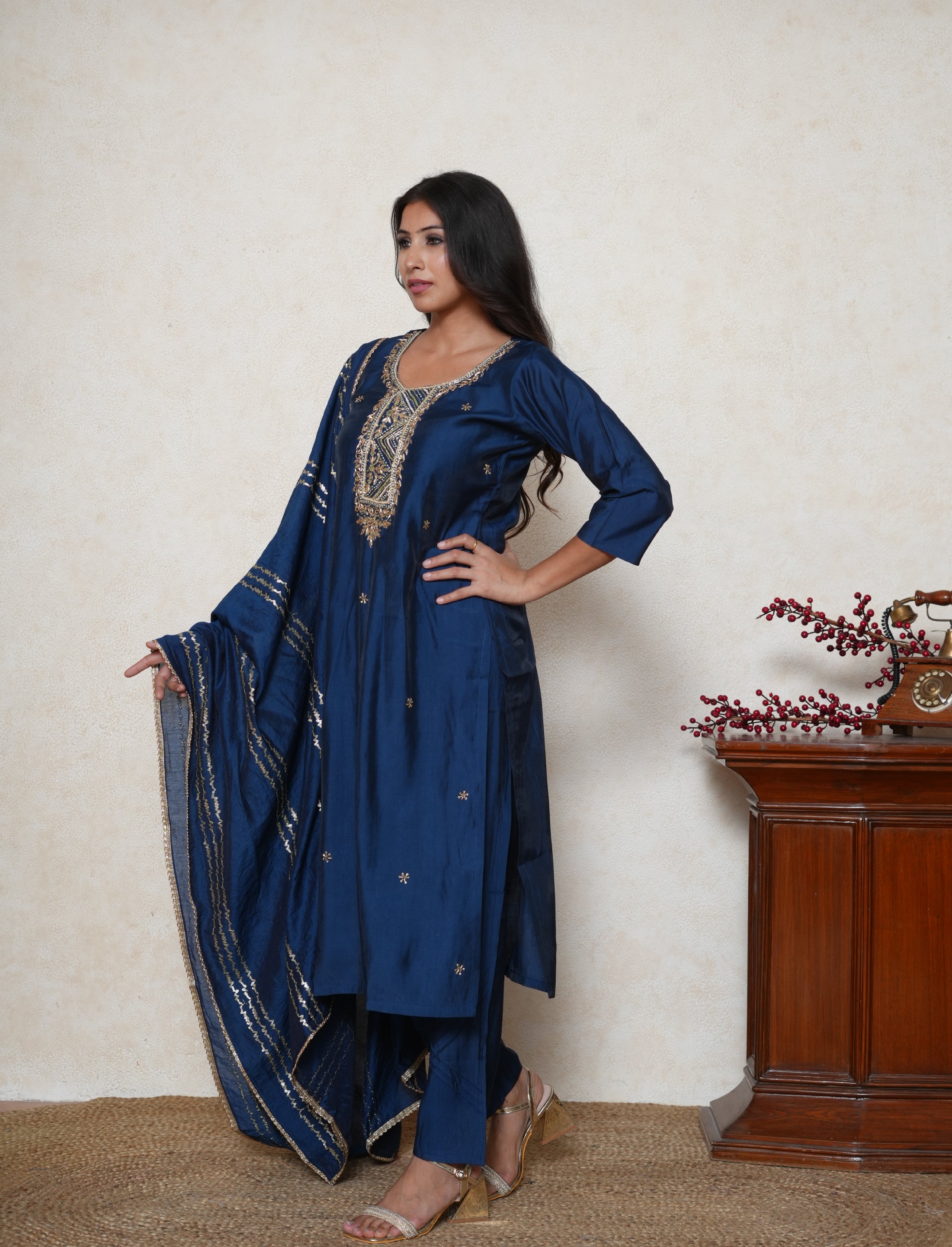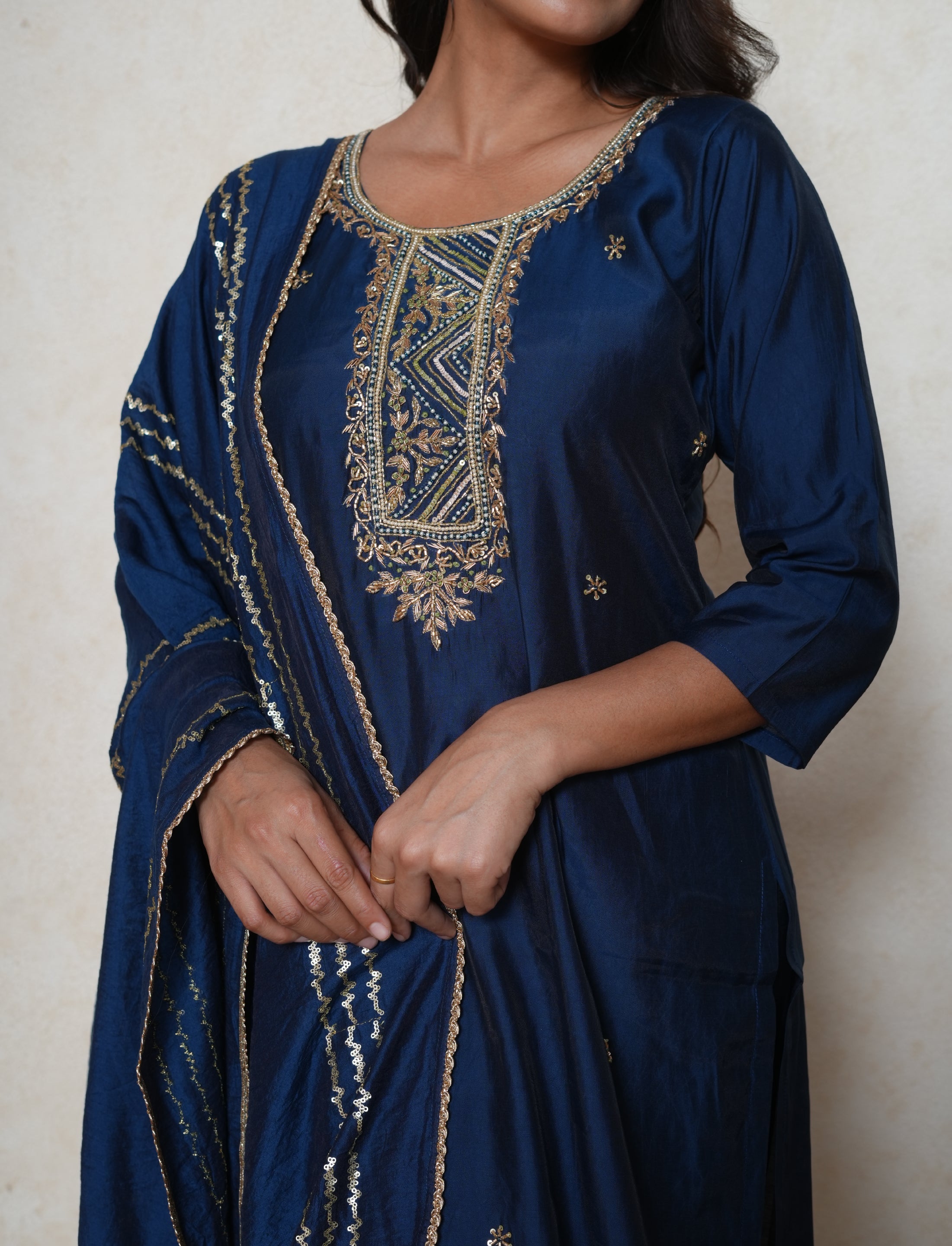 Step into festive elegance with this stunning shades-of-blue silk blend kurta. Featuring a round neckline adorned with intricate floral embroidery, the design dances along the neckline with pearl, sequin, cutdana, and dabka work, exuding timeless charm. It comes with silk blend pants and a sequin work dupatta.