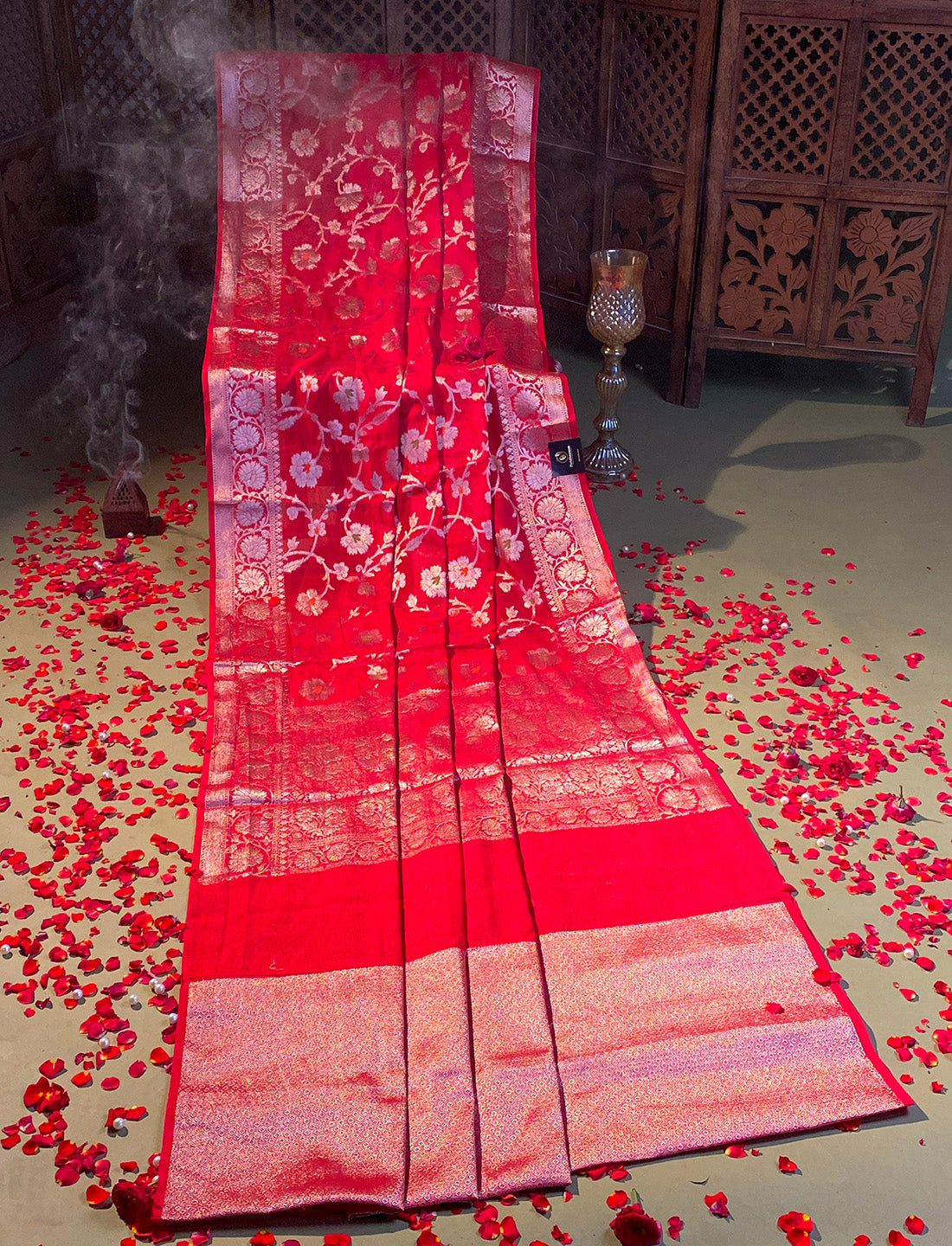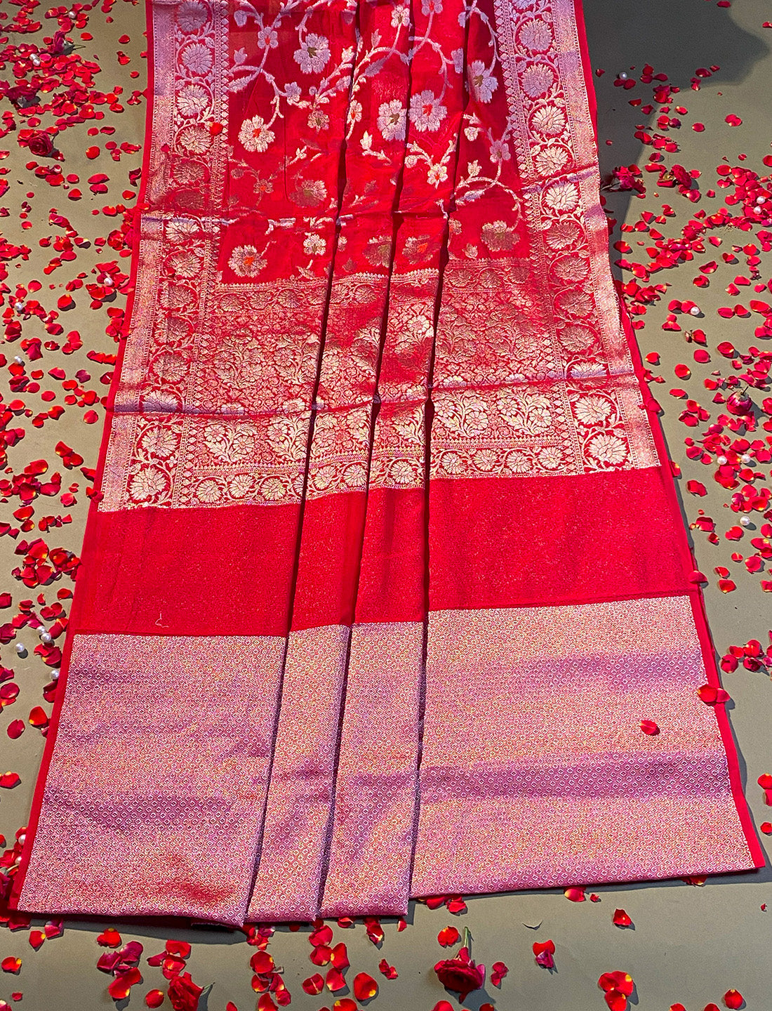 Scarlett Red crepe Silk saree, all over floral jaal with minakari work , Heavy blouse.