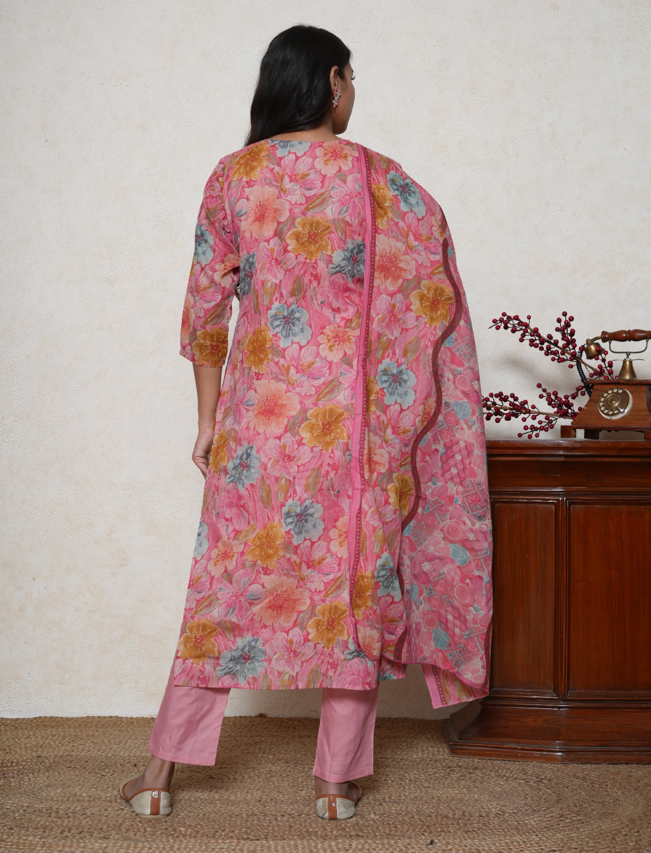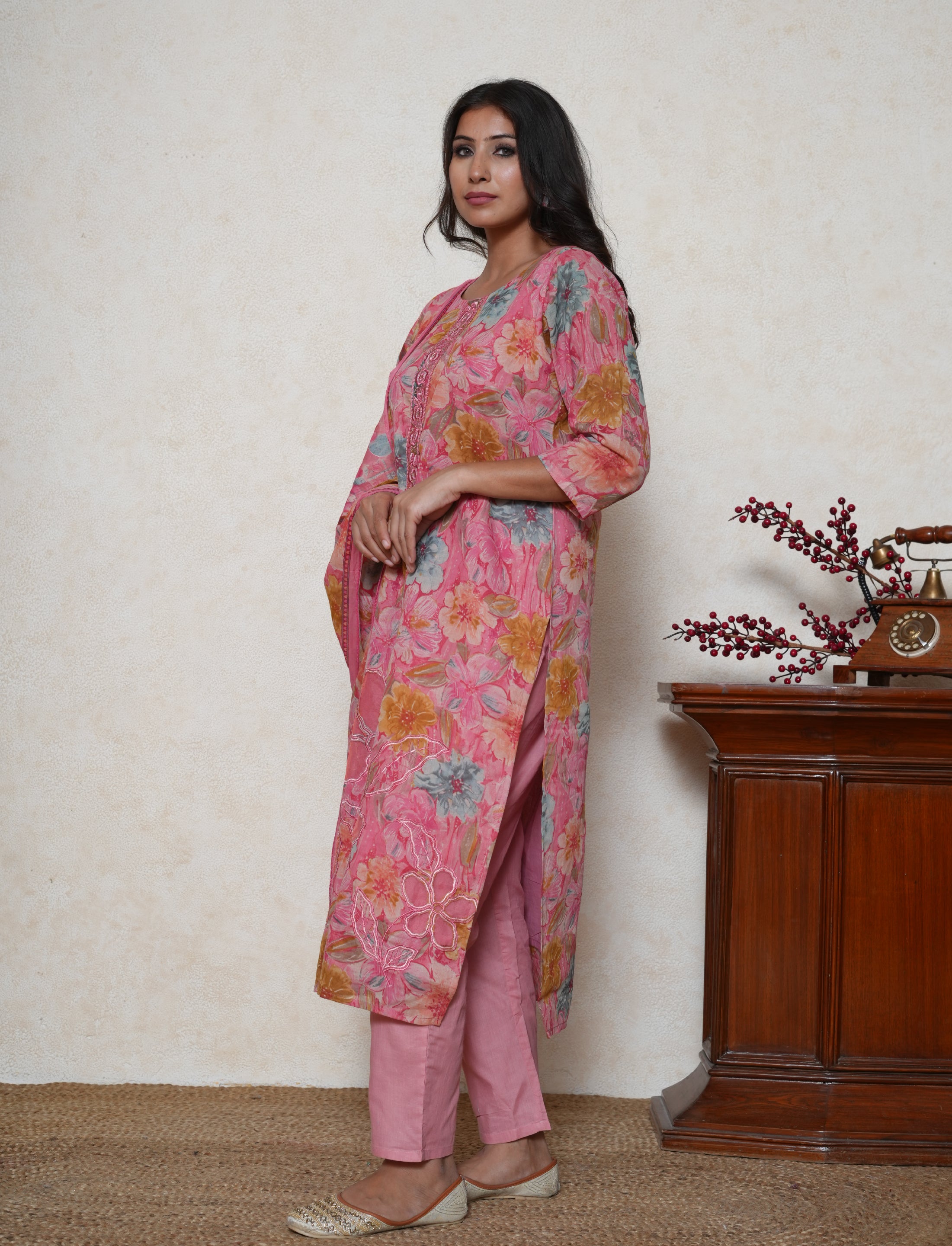 Bask in effortless charm with this strawberry pink cotton suit, designed to keep you cool and stylish through the seasons. The cotton kurta features a soft floral print, enhanced by delicate single-line embroidery along the neckline for a refined finish. Adding a unique touch, the kurta showcases intricate floral cutwork detailing covered with fine net, creating a subtle play of texture and elegance.