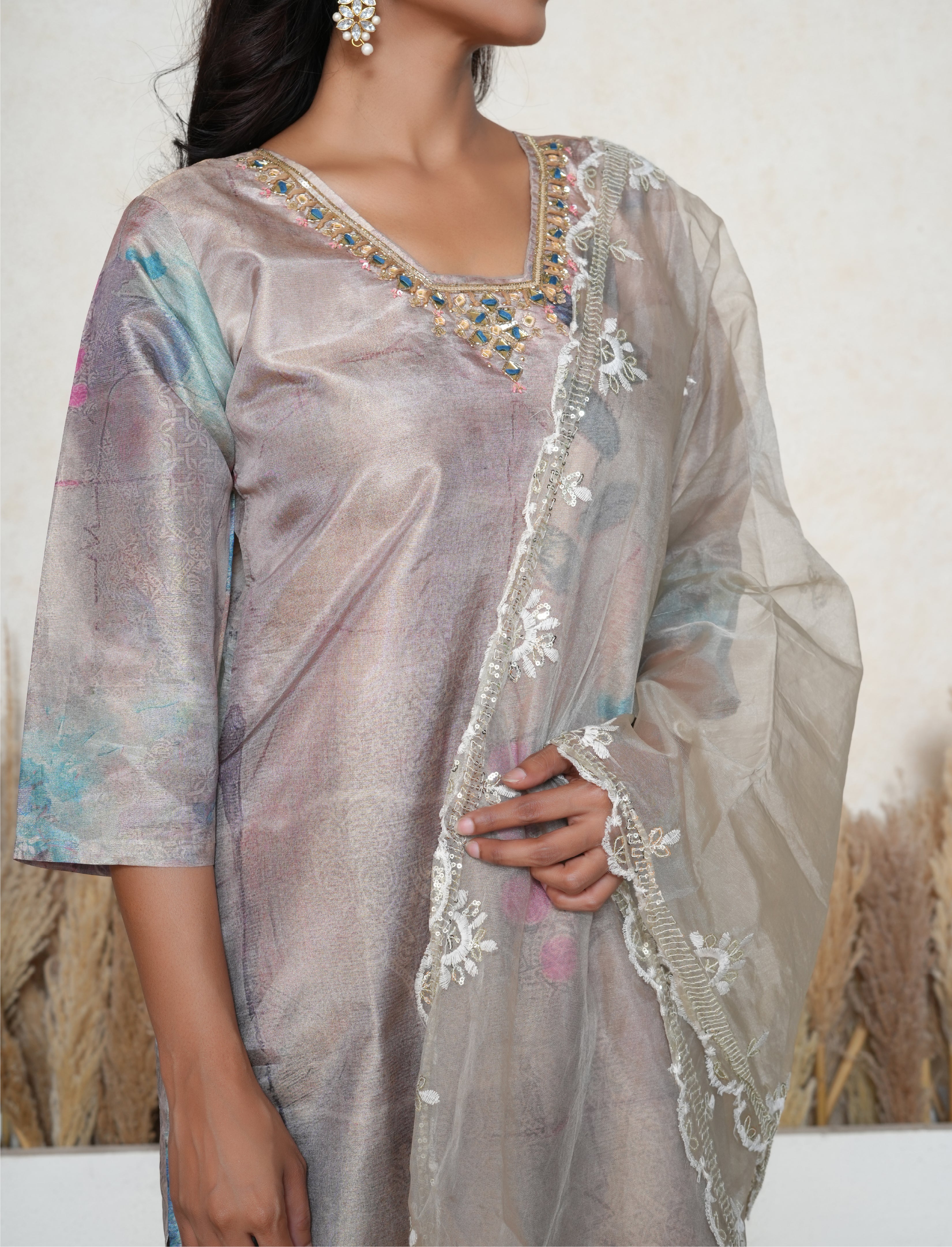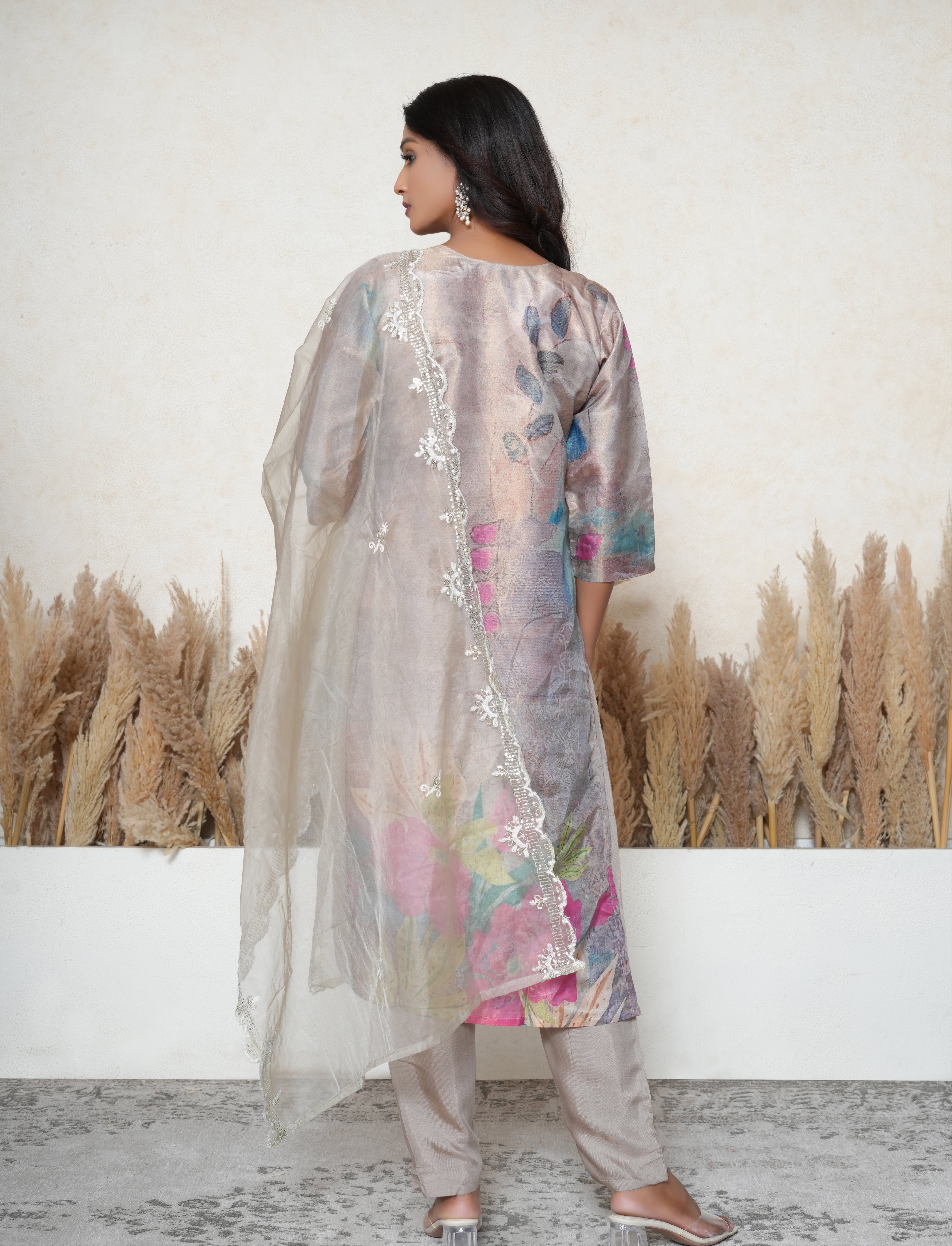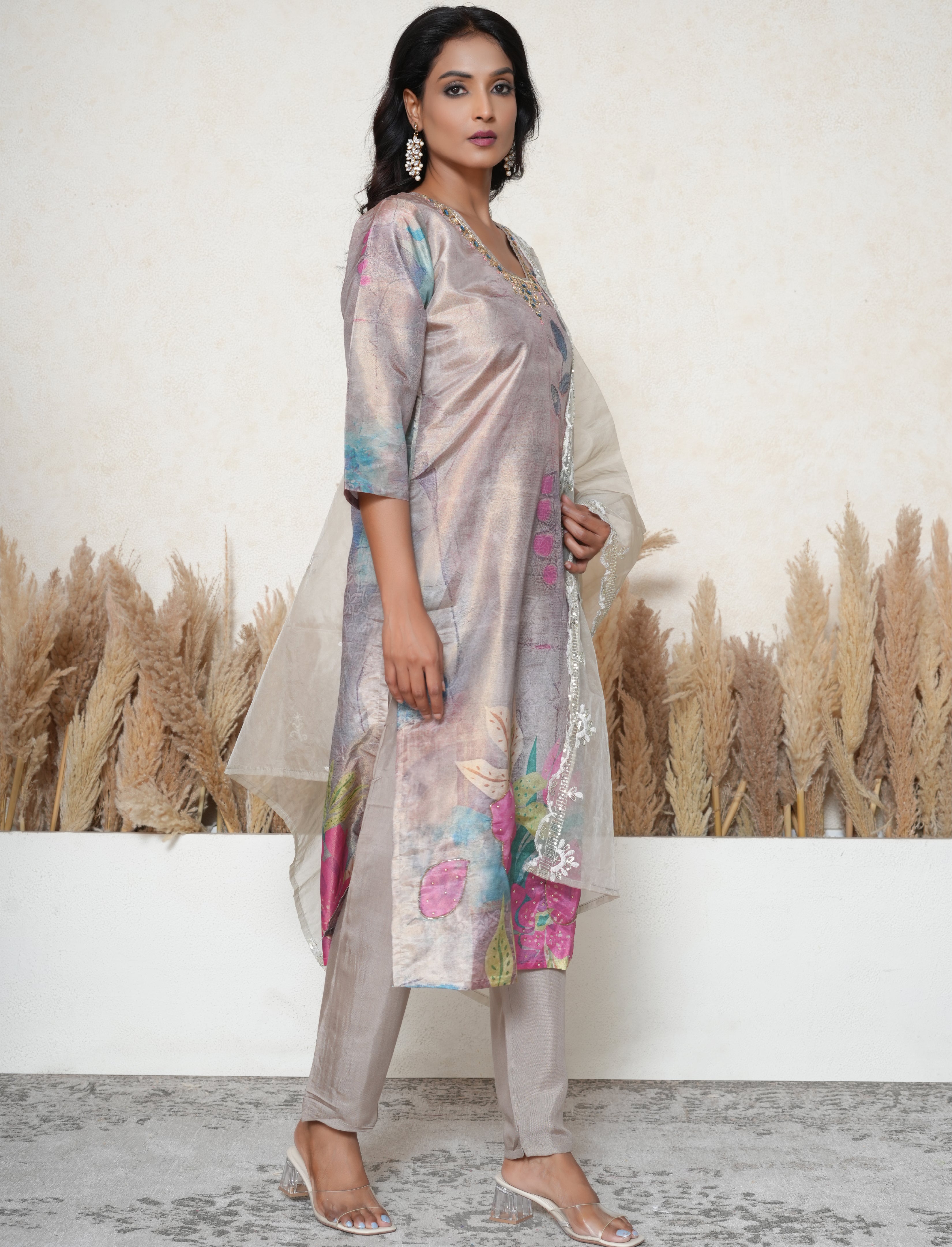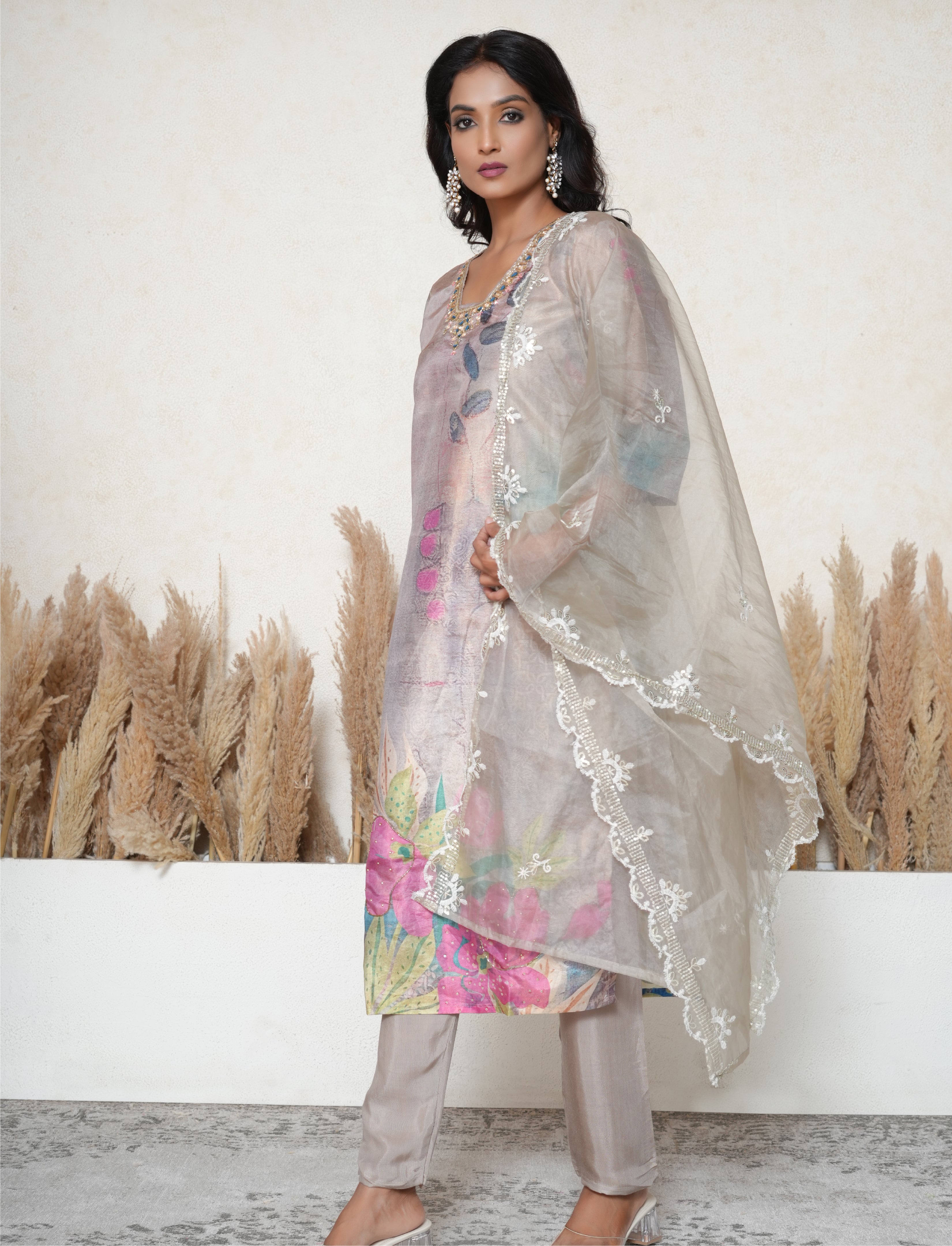 Experience understated elegance with this Stone Taupe Crepe Suit, featuring a subtle self-print base enhanced by vibrant digital floral prints that bring a refreshing burst of color. The crepe kurta is adorned with exquisite mirror, sequins, and moti (pearl) embellishments along the neckline, adding a delicate shimmer and rich texture. Crafted from soft crepe fabric, the suit offers a graceful drape and comfortable fit. Complementing the ensemble is a matching silk blend and sheer organza dupatta, beautifully finished with a scalloped border embellished with intricate embroidery and sequins, elevating the overall look. Perfect for formal gatherings or festive occasions, this suit combines modern digital artistry with traditional handwork for a truly refined statement.