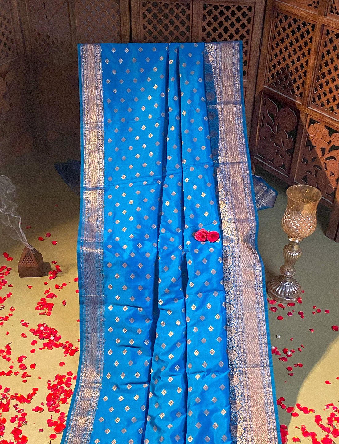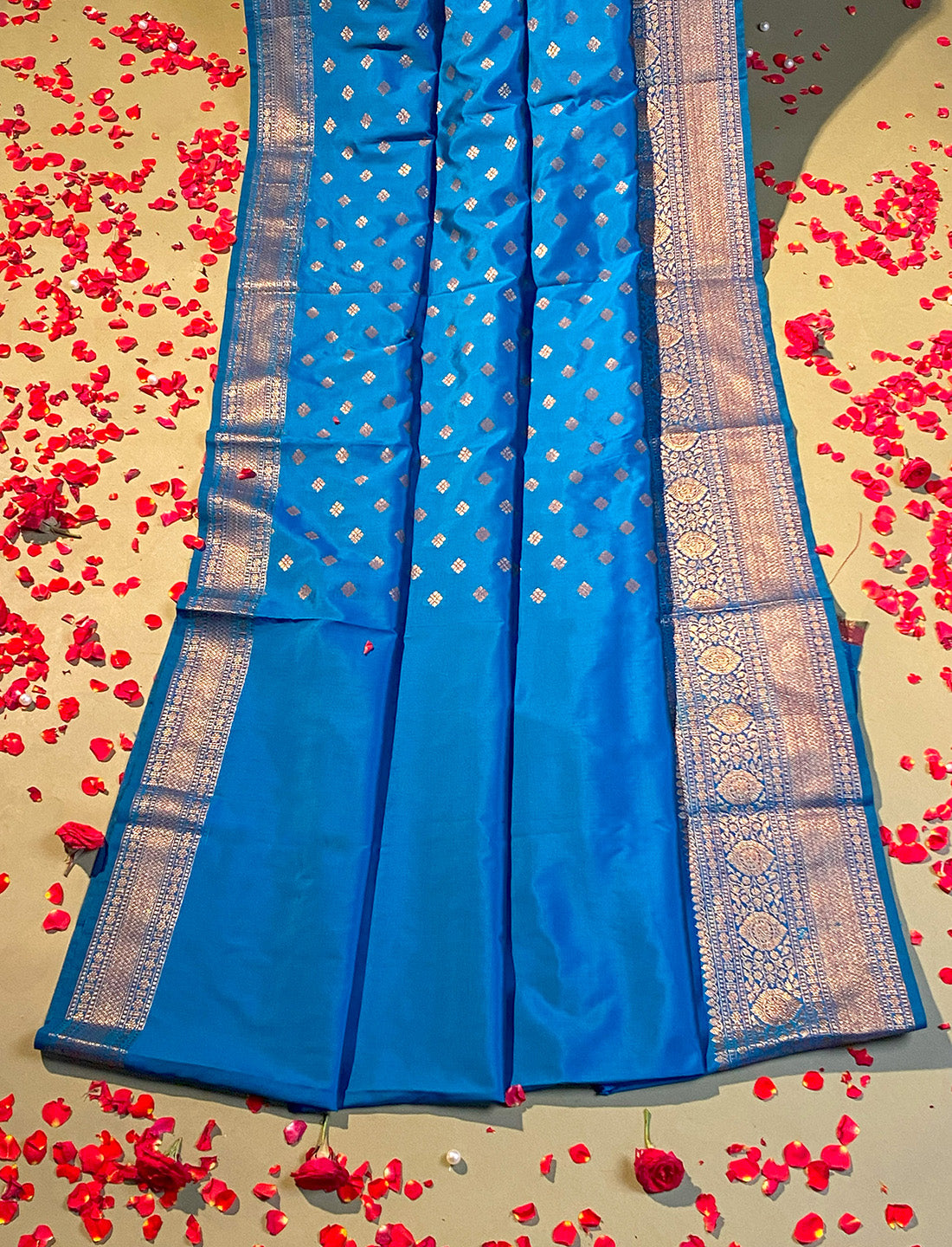 Teal blue Banarasi crepe silk saree with antique Zari small motifs all over drape with celebrated border.