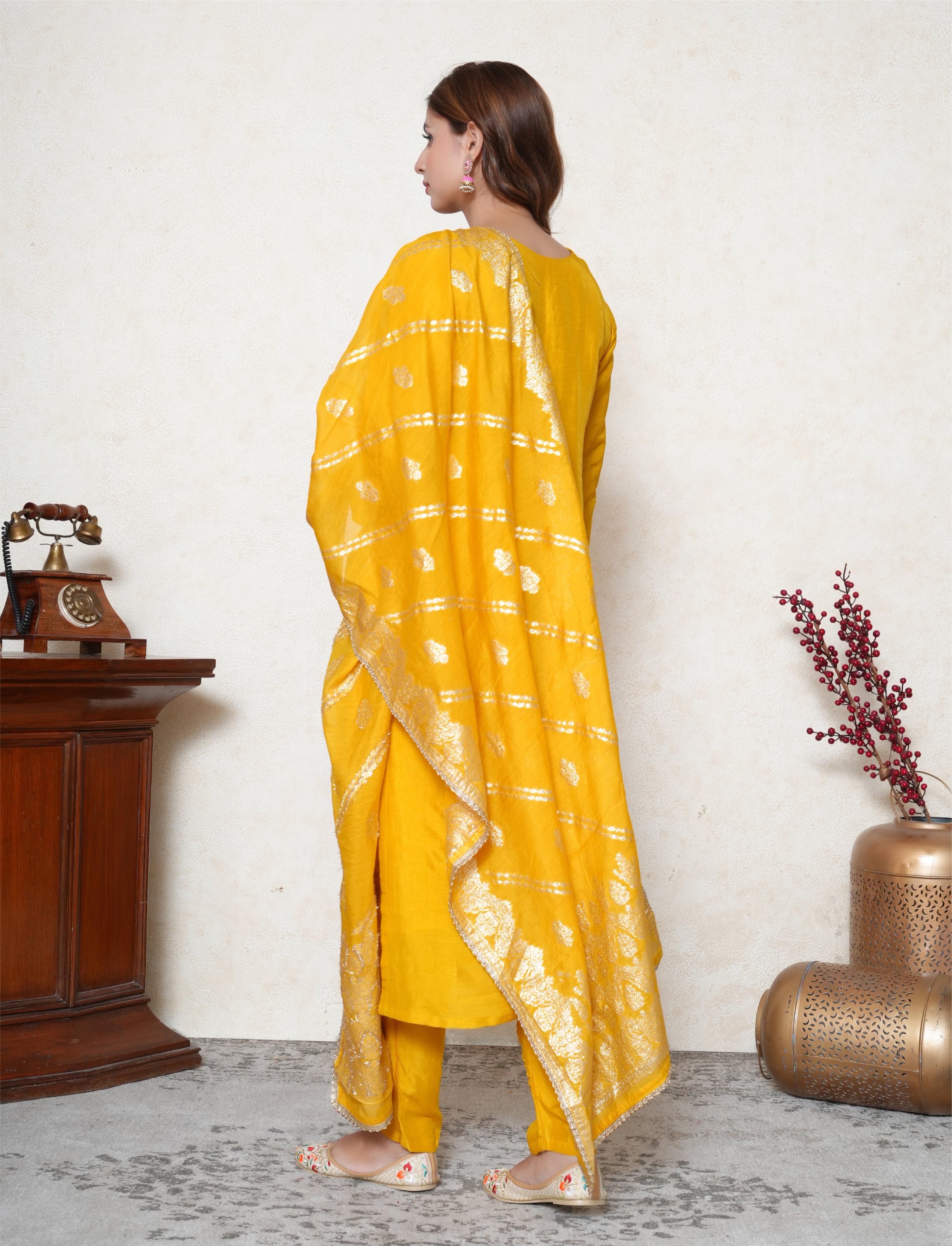 Elevating the ensemble is a luxurious silk blend Banarasi dupatta, rich with woven patterns and a subtle sheen that complements the vibrant hue of the suit.