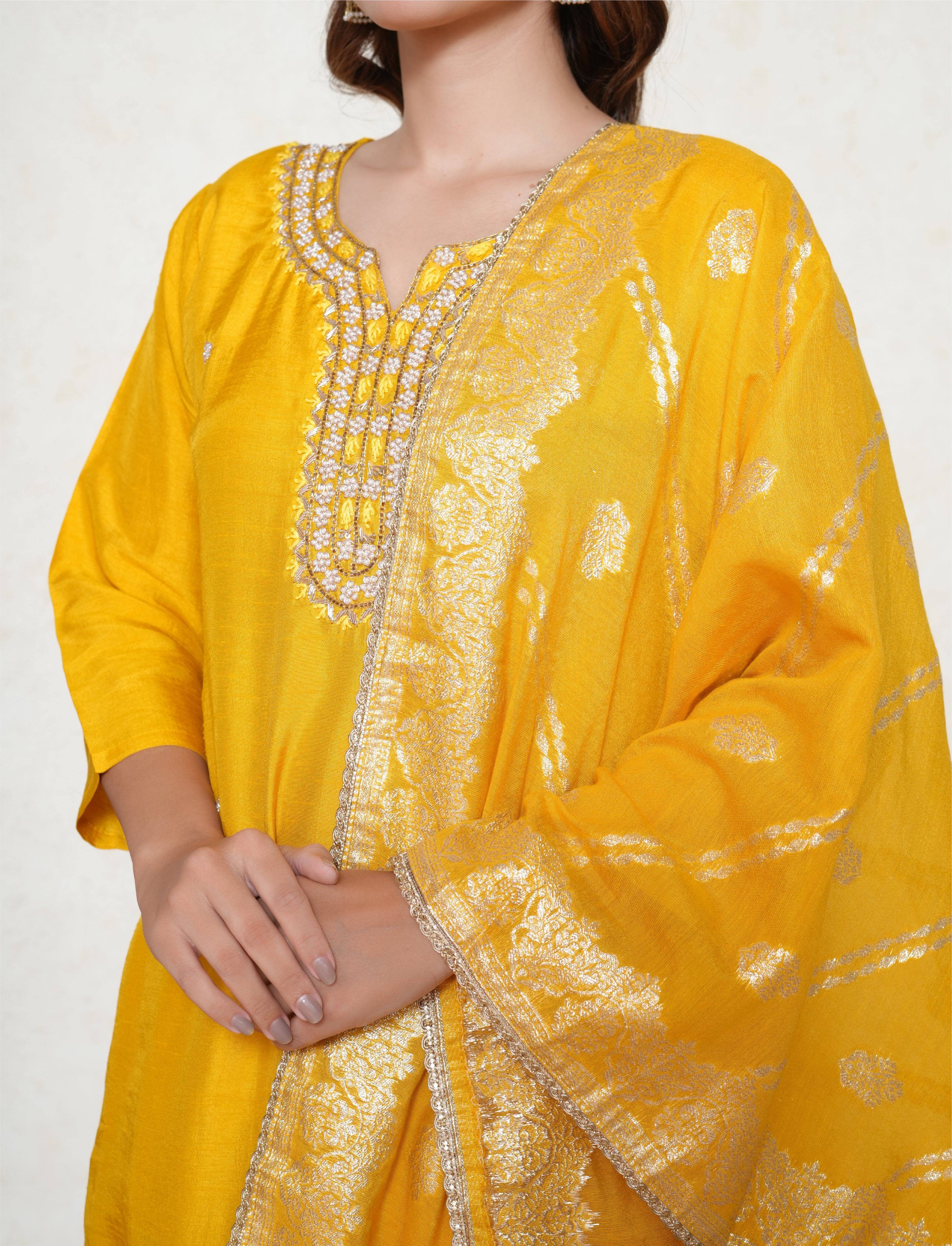 Brighten up any occasion with this radiant Tuscany yellow silk blend suit, a beautiful fusion of traditional craftsmanship and refined elegance. The silk blend kurta features a graceful notch neckline, exquisitely adorned with pearl, sequin, dabka, and cutdana work that adds just the right amount of shimmer and texture. Small booties scattered across the kurta bring a timeless charm, making it ideal for both day and evening events. The matching silk blend pants offer a polished and cohesive silhouette.