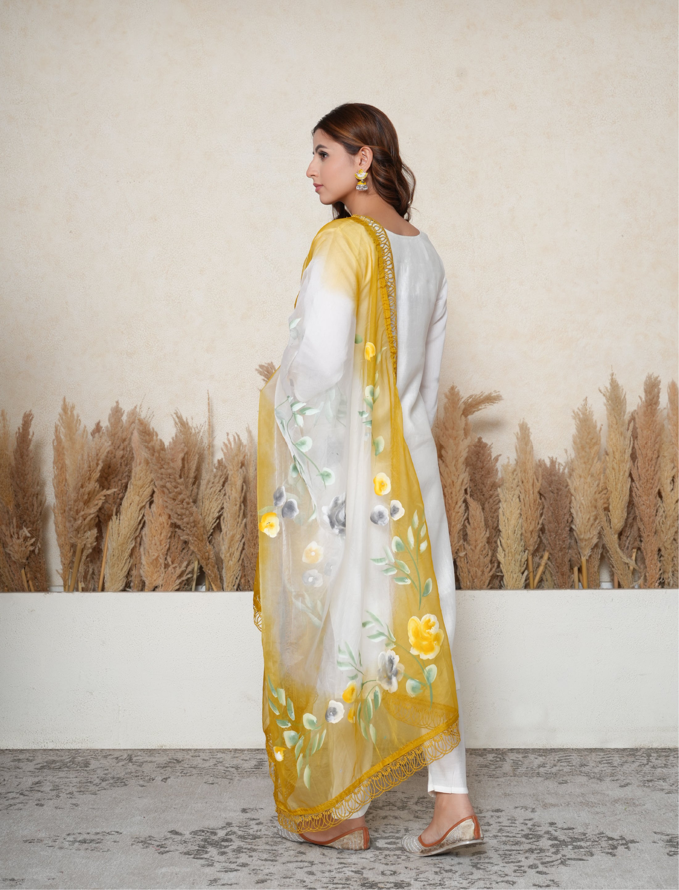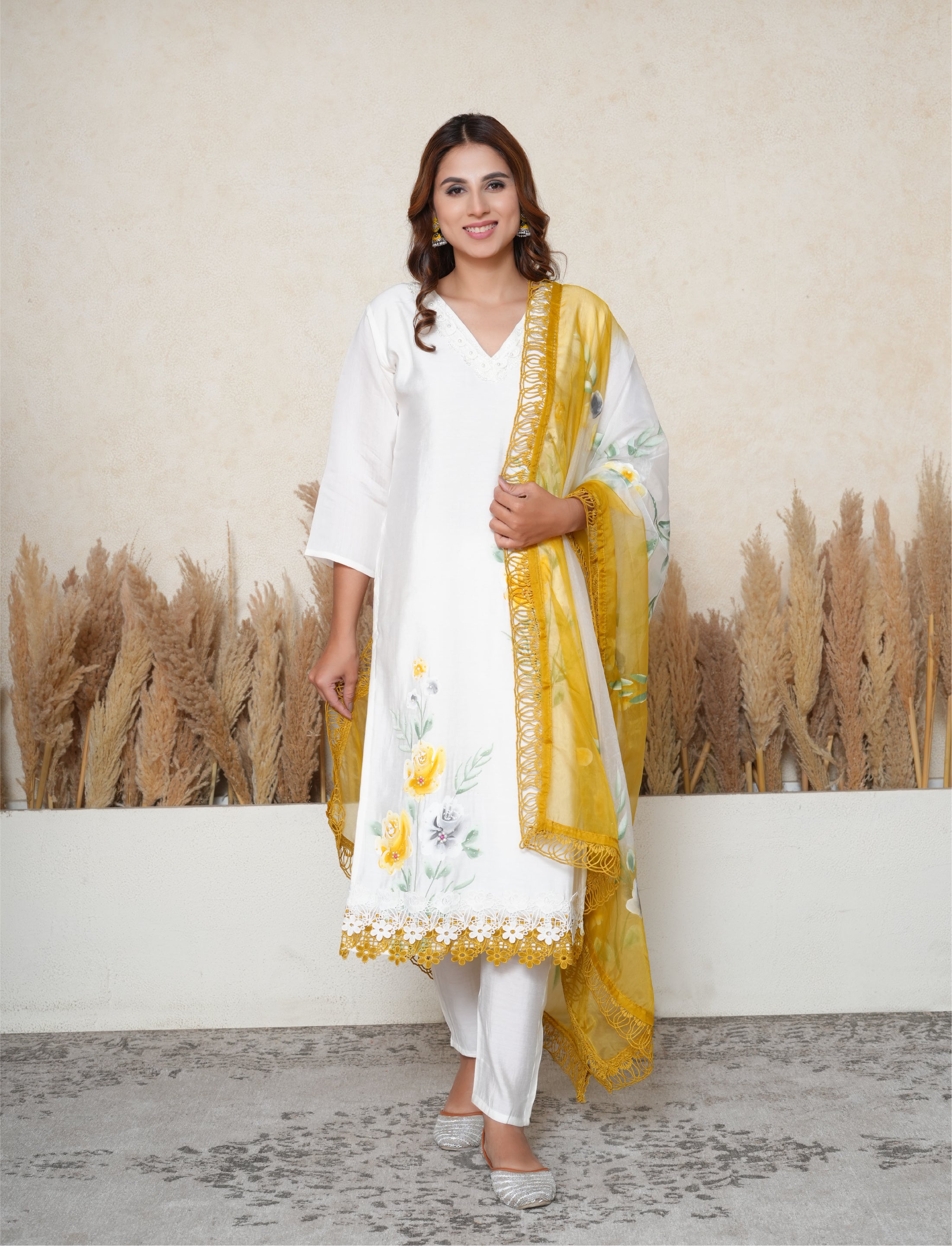 Fresh, minimal, and artistically styled — this White Suit Set is a timeless wardrobe essential elevated with delicate craftsmanship and elegant accents. The cotton silk kurta features a flattering V-neckline adorned with lace and pearl work, adding a refined, feminine charm. The straight-cut kurta is enhanced with a subtle floral handpainted pattern, and finished with a lace border along the hem, offering a graceful flow and artistic appeal. It pairs effortlessly with white straight cotton pants, completing the ensemble with a clean, classic touch. The star of the set is the contrast sheer fabric mustard and white dupatta, featuring handpainted floral motifs and finished with a lace border, creating the perfect harmony of tradition and elegance.