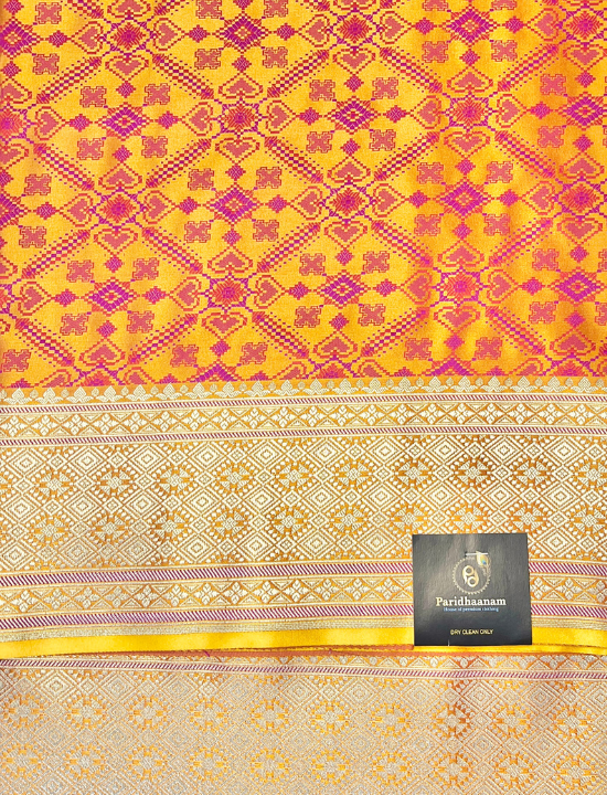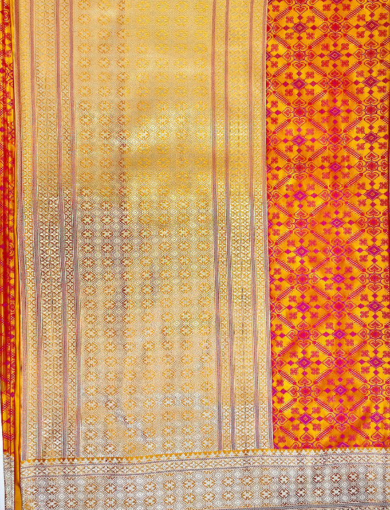 This elegant handloom banarasi tanchui jamawar saree with elaborate border holds within their warp and weft an heirloom of indian workmanship.Hand made saree with hand weaving work all over.